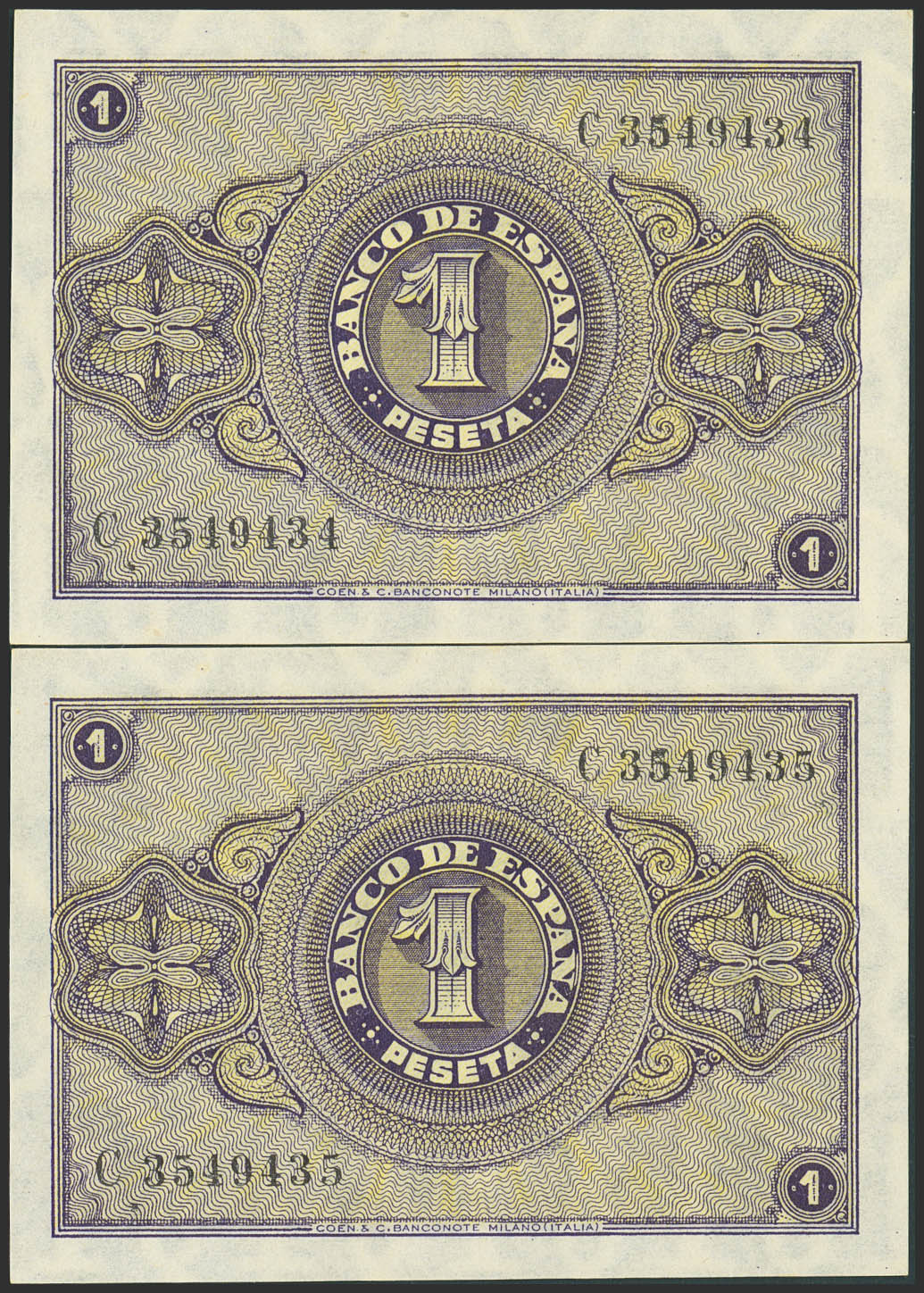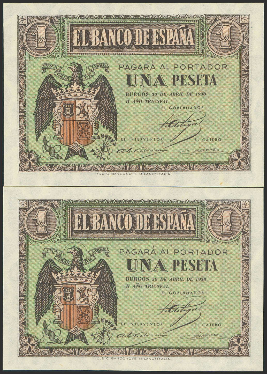 1 Peseta. 30 de Abril de 1938. Pareja correlativa. Serie C. (Edifil 2023: 428a). Apresto original. SC.