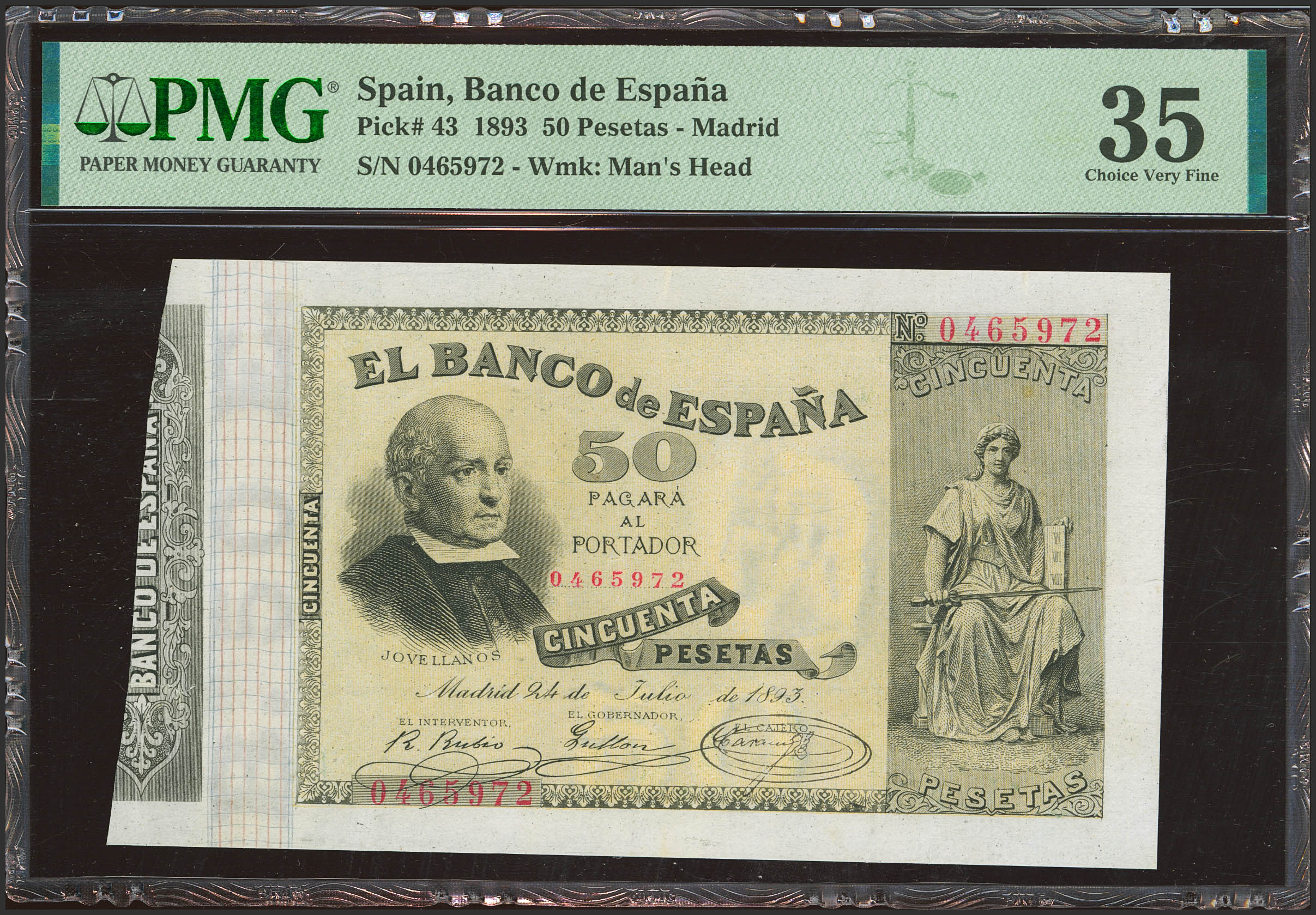 50 Pesetas. 24 de Julio de 1893. Sin serie. (Edifil 2023: 301, Pick 43). Raro, mínimamente reparado. MBC+. Encapsulado PMG35 (minor repairs).