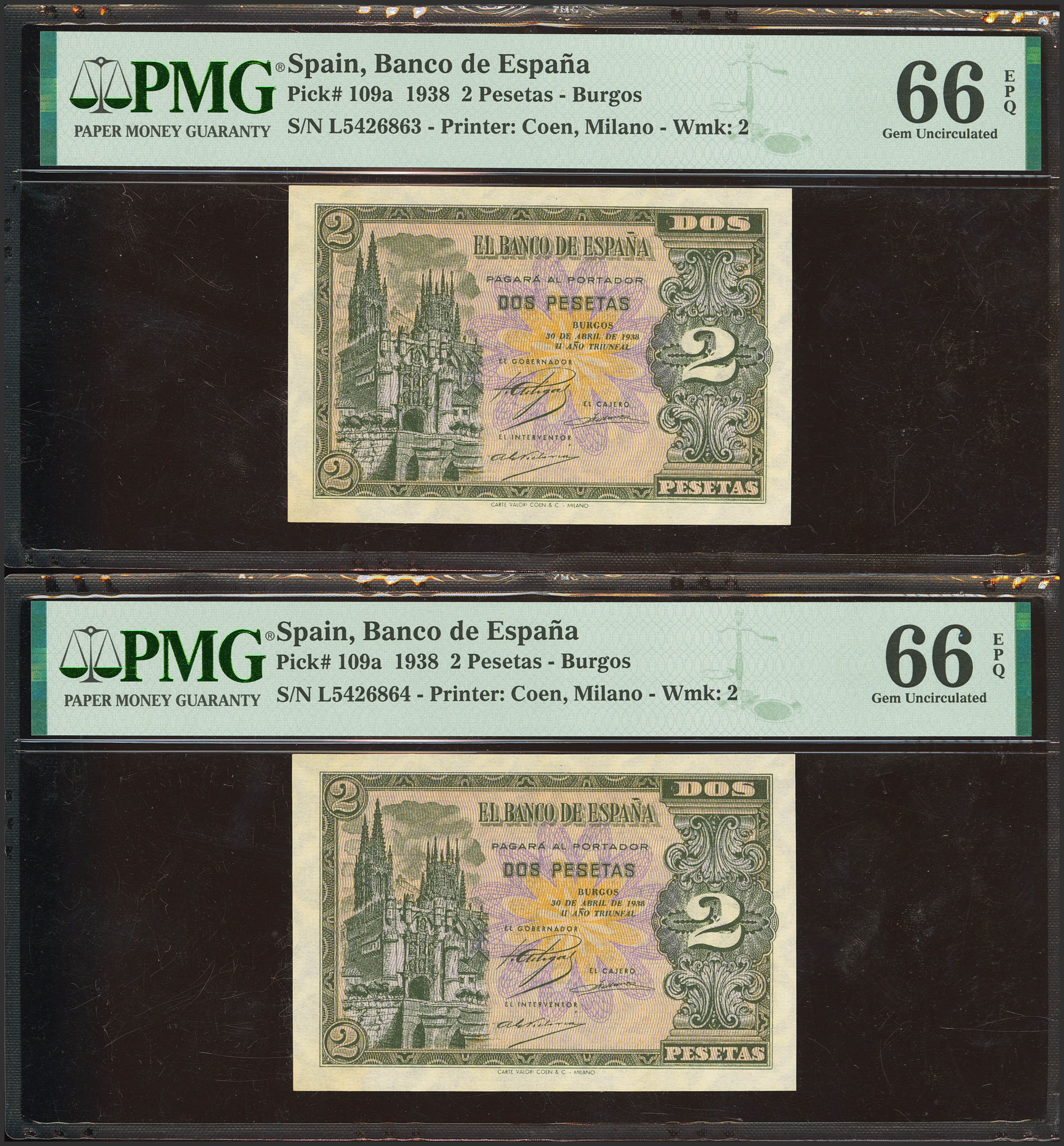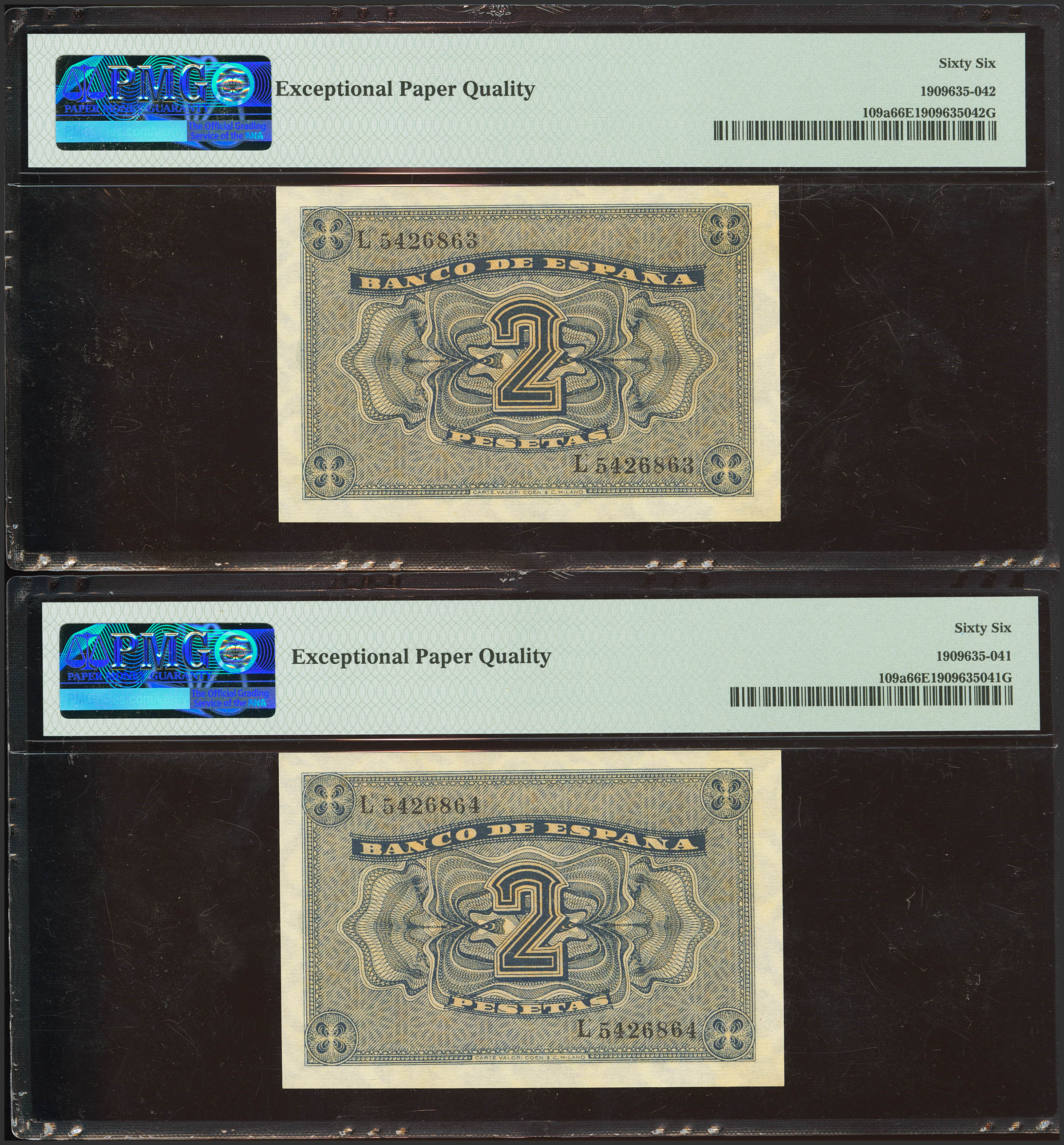 2 Pesetas. 30 de Abril de 1938. Pareja correlativa. Serie L. (Edifil 2023: 429a, Pick: 109a). Apresto original. SC. Encapsulados PMG66EPQ, ambos.