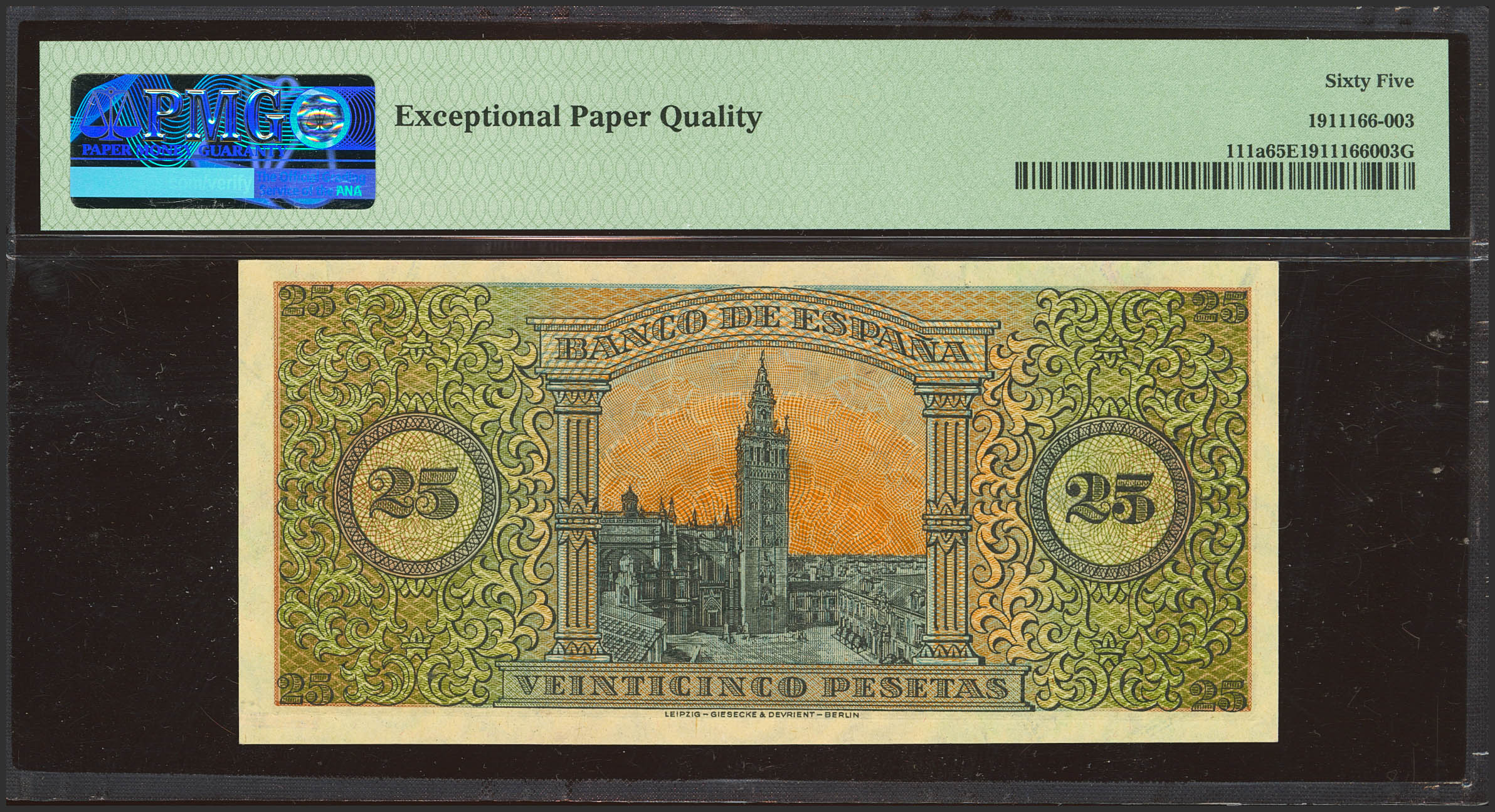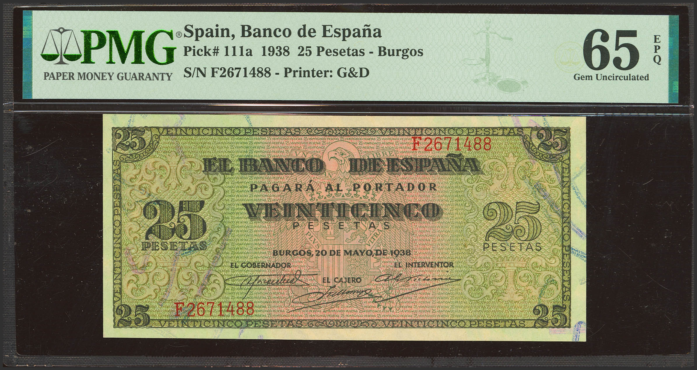 25 Pesetas. 20 de Mayo de 1938. Serie F, última serie emitida. (Edifil 2023: 430b, Pick: 111a). Inusual en esta excepcional calidad, apresto original. SC. Encapsulado PMG65EPQ.