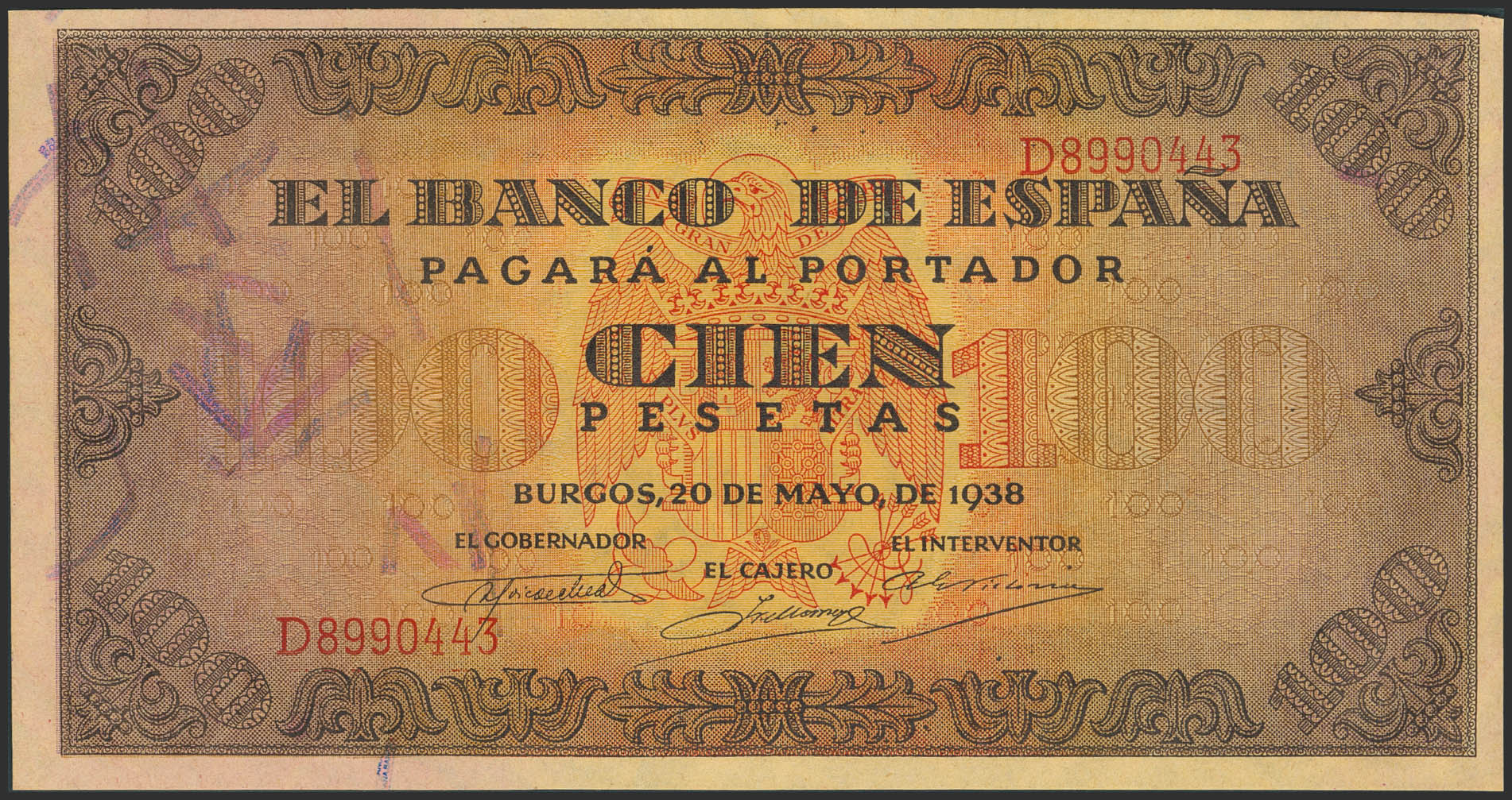 100 Pesetas. 20 de Mayo de 1938. Serie D. (Edifil 2023: 432a). Conserva todo su apresto original. SC--.
