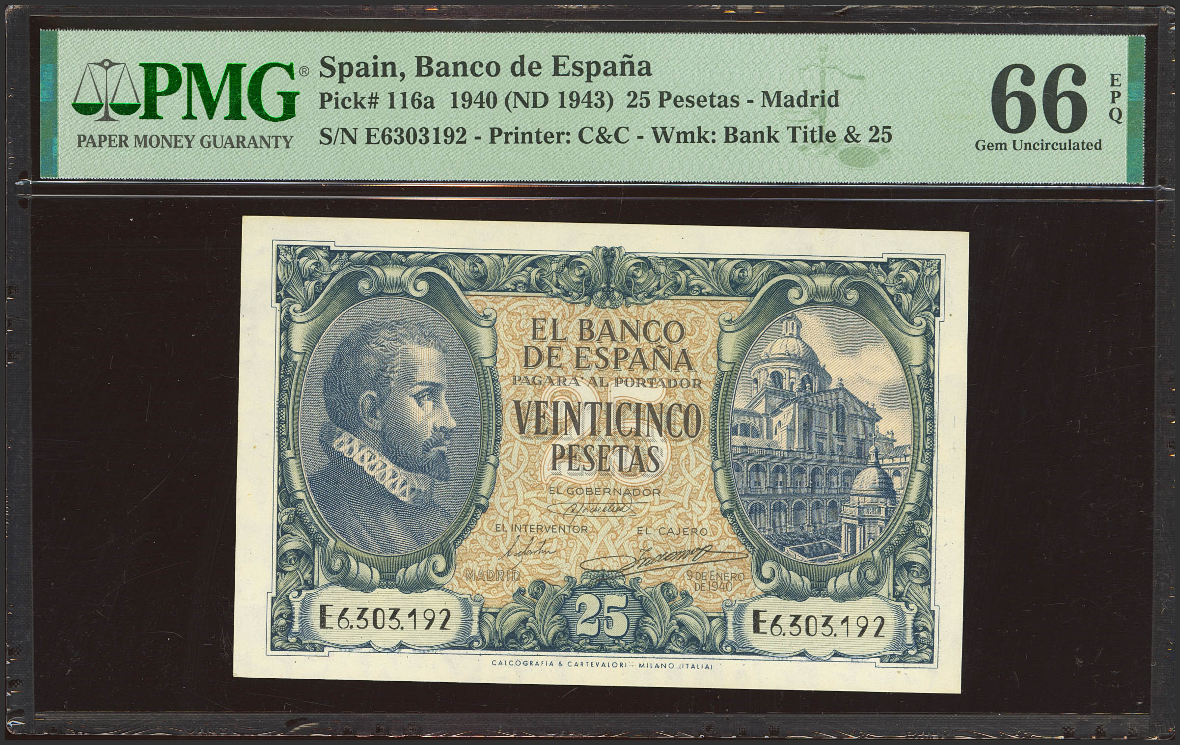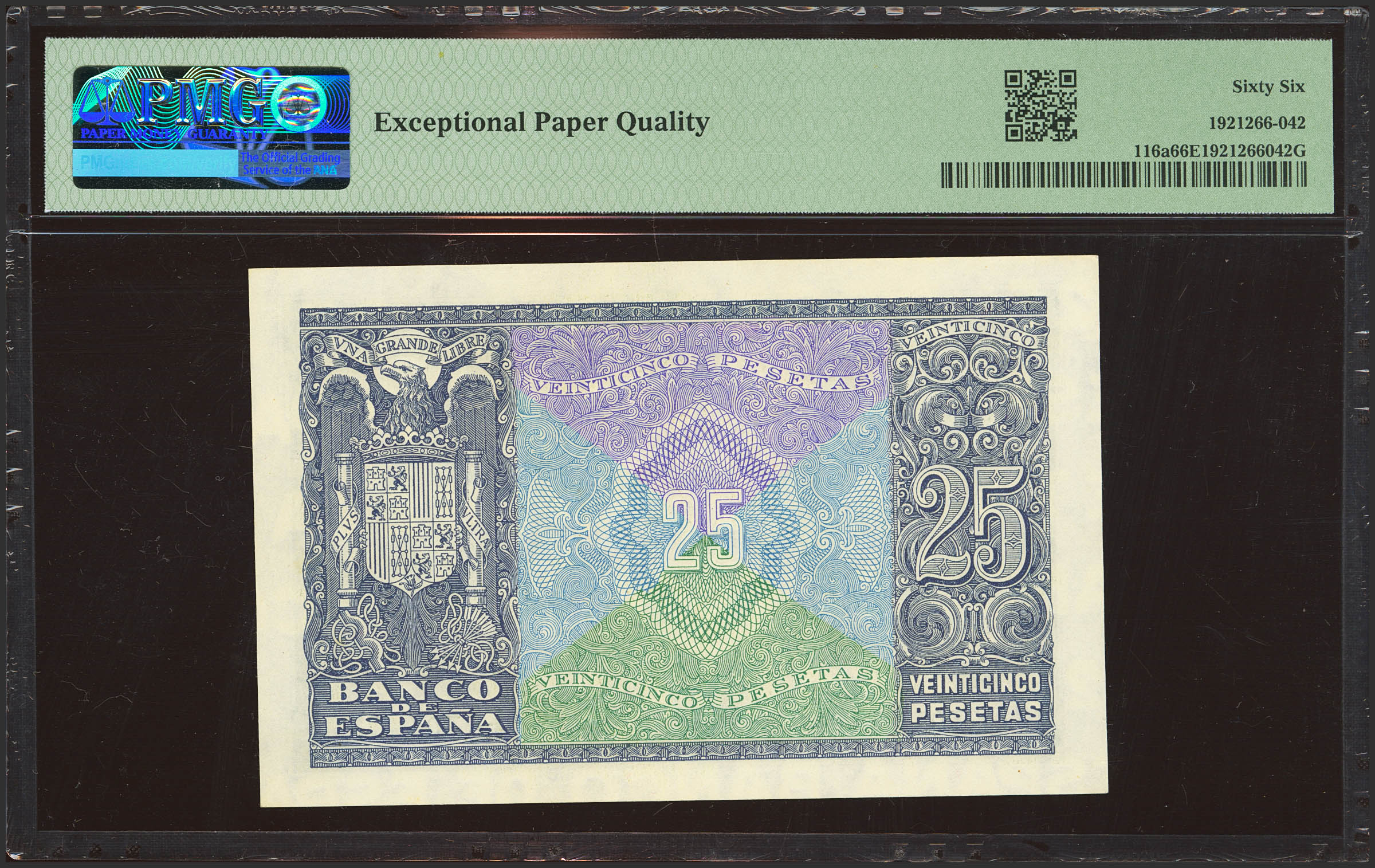 25 Pesetas. 9 de Enero de 1940. Serie E. (Edifil 2023: 436a, Pick: 116a). Raro en esta excepcional calidad, apresto original. SC. Encapsulado PMG66EPQ.
