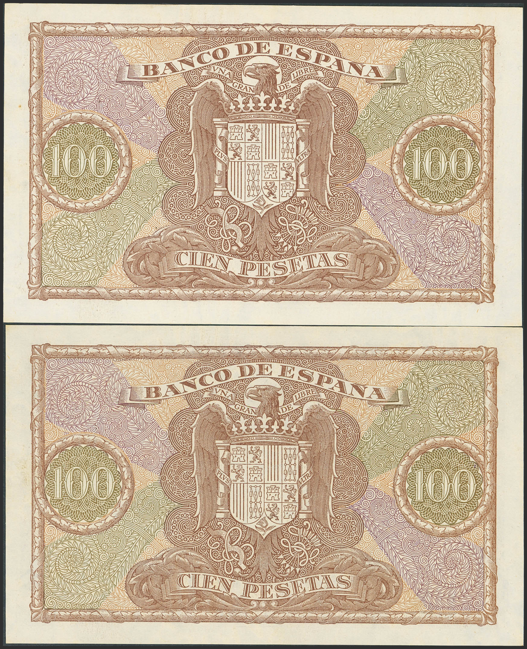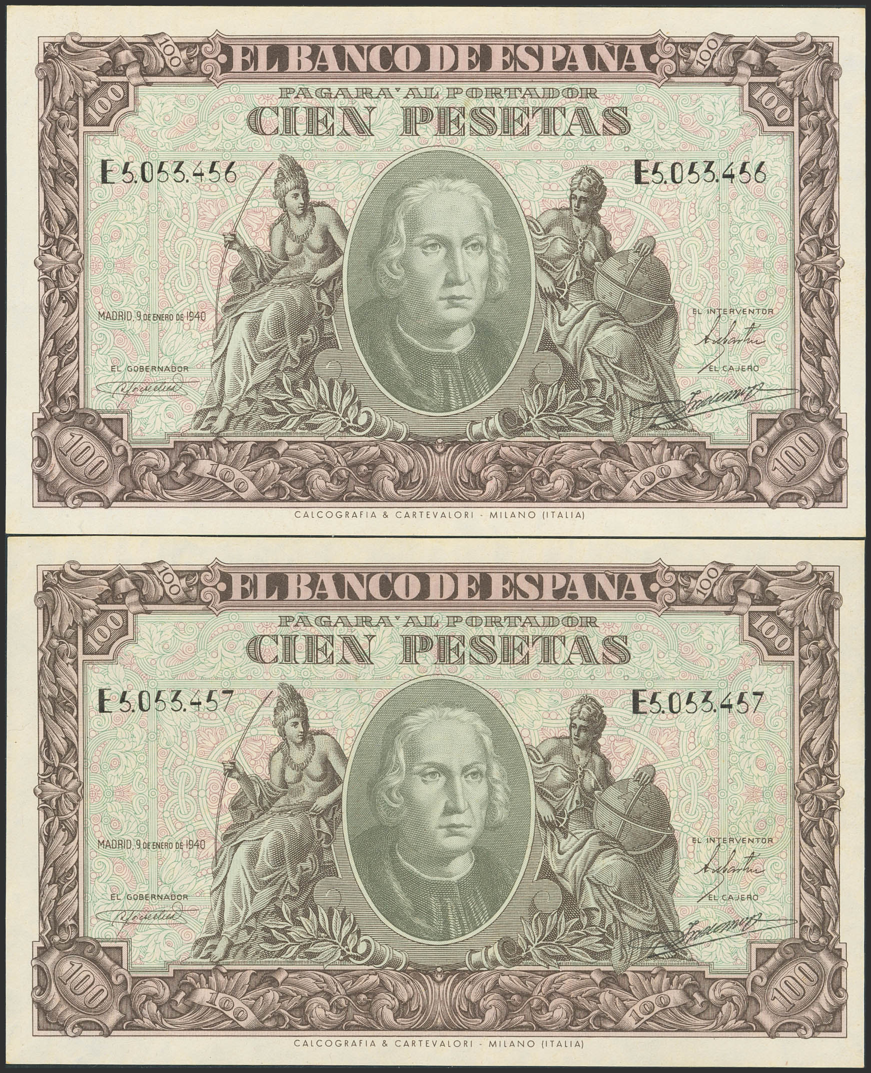 100 Pesetas. 9 de Enero de 1940. Pareja correlativa. Serie E. (Edifil 2023: 438a). Inusual, apresto original. EBC+++.