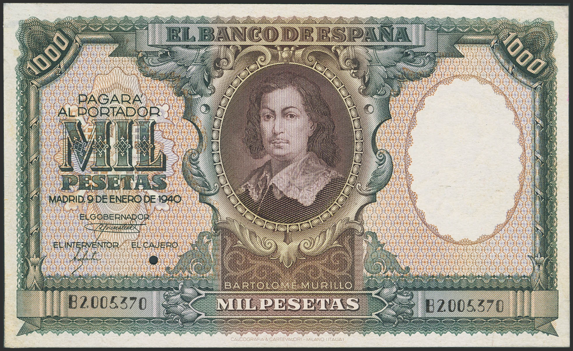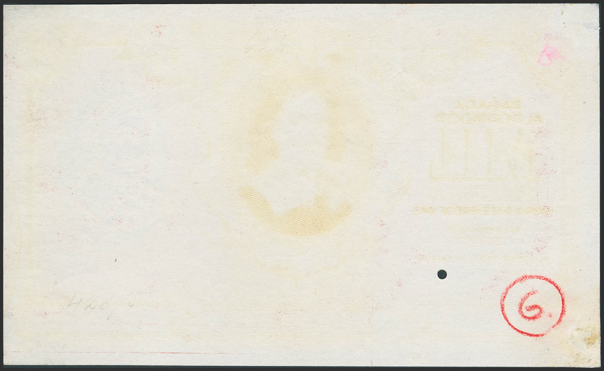 1000 Pesetas. 9 de Enero de 1940. Serie B y con numeración. Prueba definitiva del billete, taladrado pequeño en la firma del cajero y en el reverso anotaciones manuscritas del archivo. (Edifil 2023: 440P, Cobo: 35b, mismo ejemplar). Extraordinariamente raro, muy posiblemente se trate del único conocido, pieza de altísimo nivel, mínimas reparaciones sin ninguna importancia dada la rareza del billete. SC--.