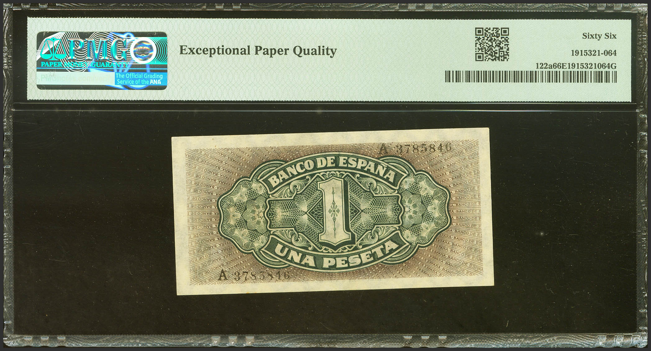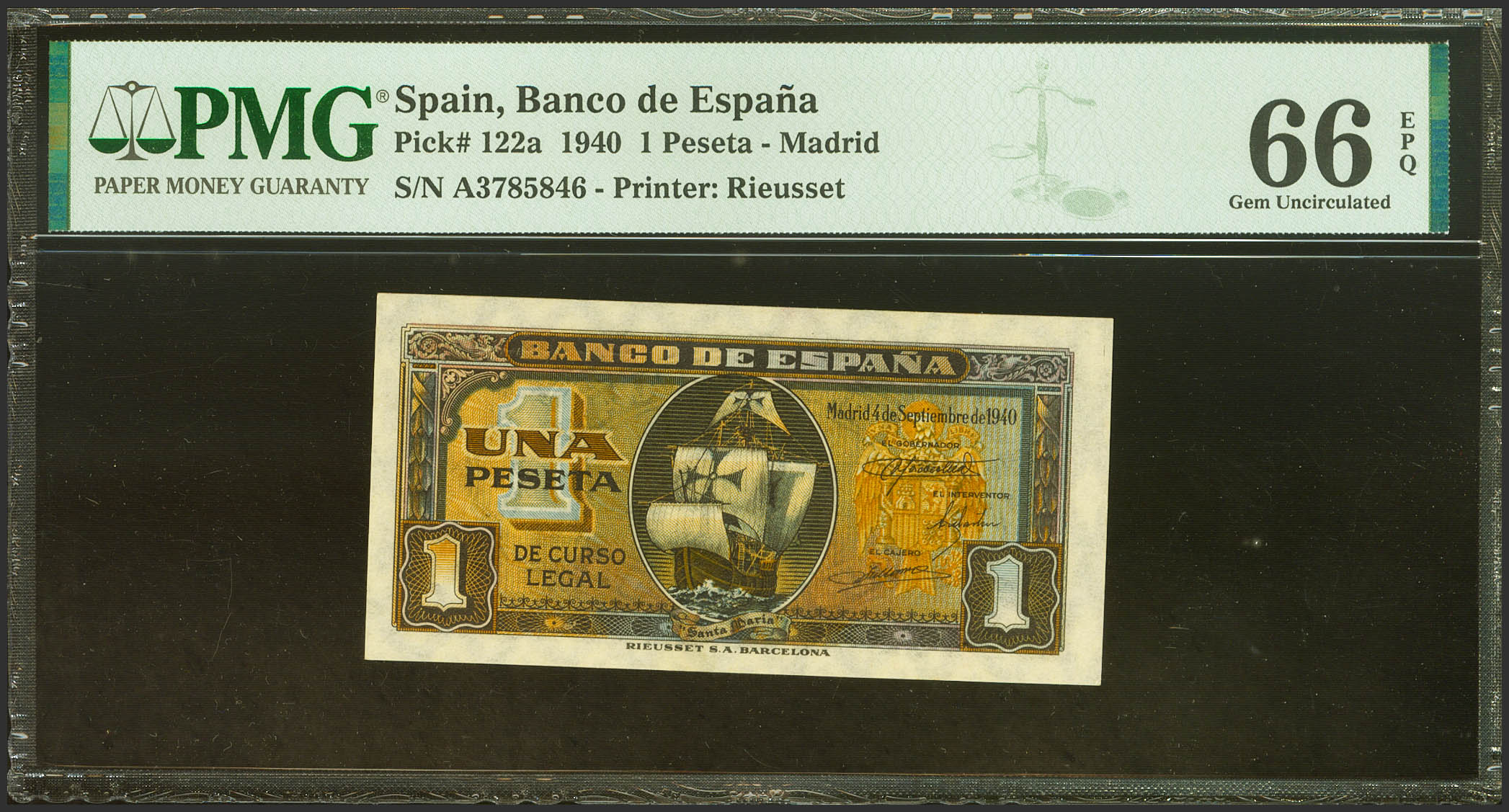1 Peseta. 4 de Septiembre de 1940. Serie A. (Edifil 2023: 442a, Pick: 122a). Inusual en esta calidad, apresto original. SC. Encapsulado PMG66EPQ.