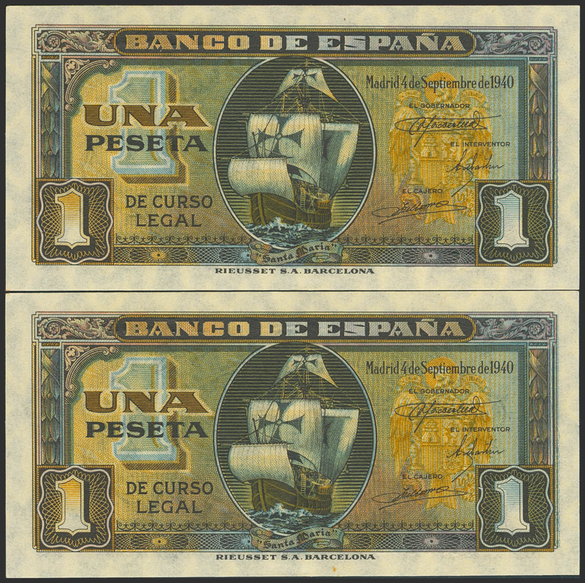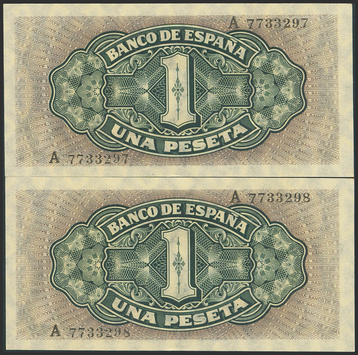 1 Peseta. 4 de Septiembre de 1940. Pareja correlativa. Serie A. (Edifil 2023: 442a). Conserva todo su apresto original. SC-.