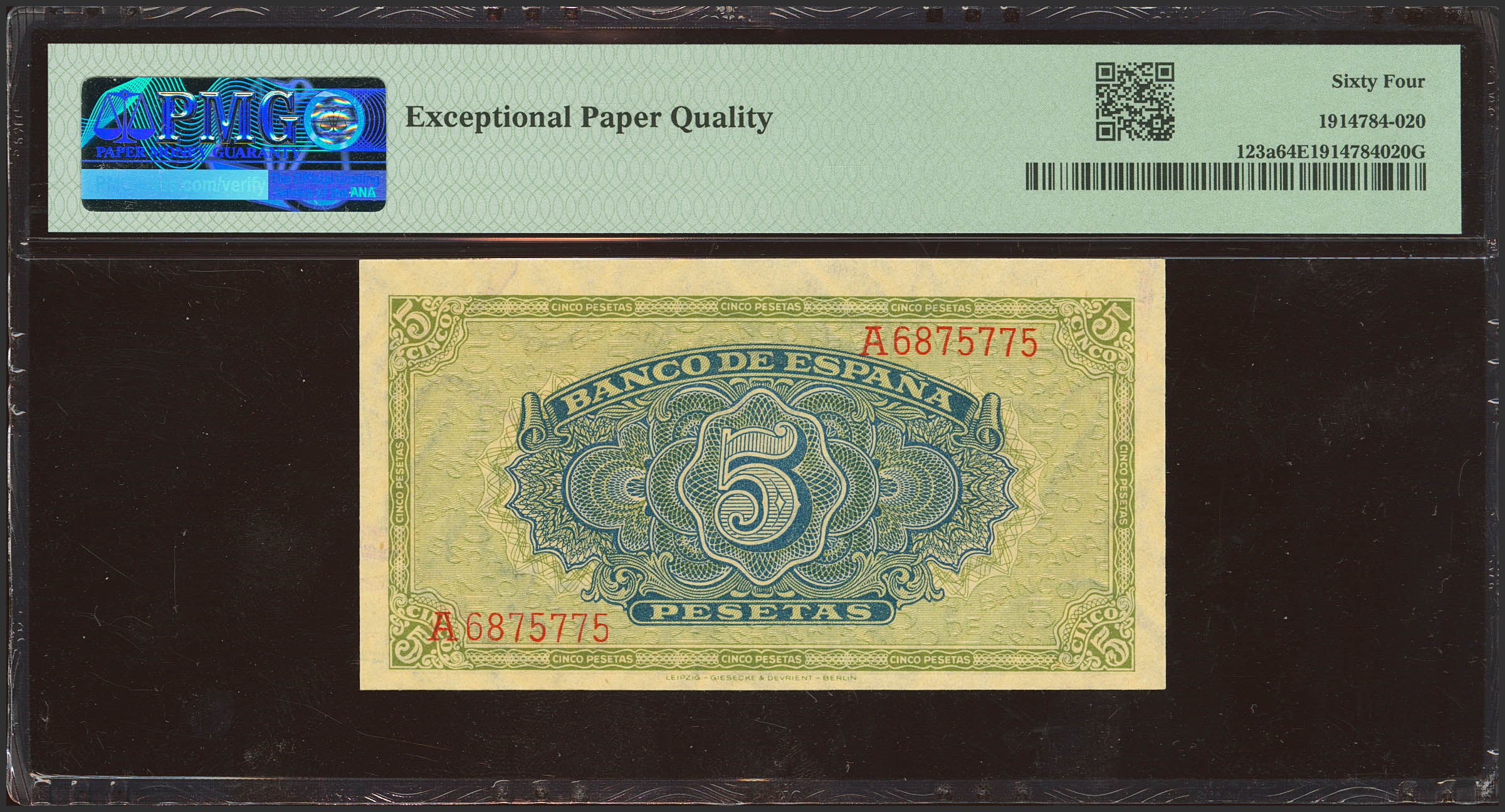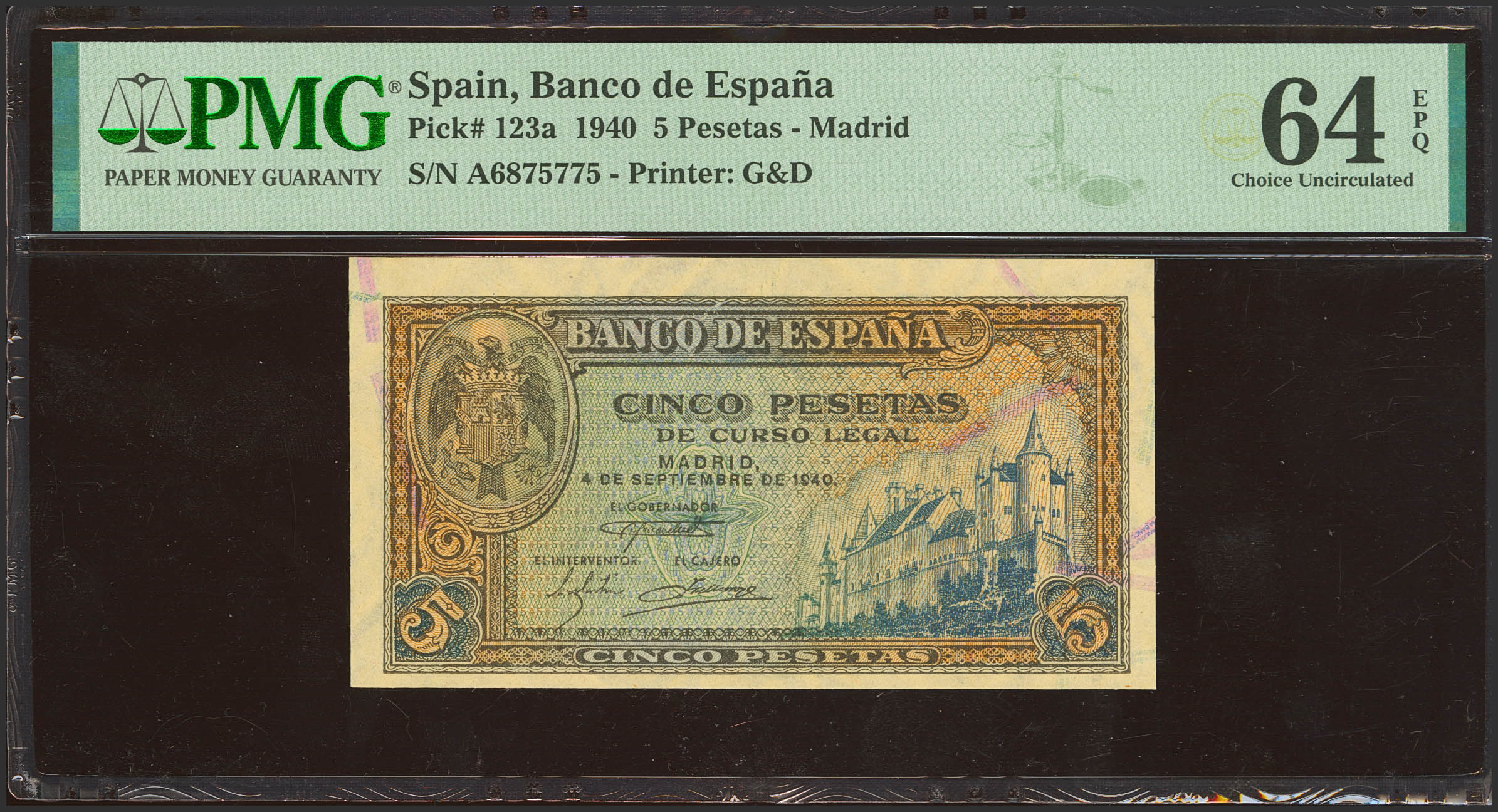 5 Pesetas. 4 de Septiembre de 1940. Serie A. (Edifil 2021: 443, Pick: 123a). Apresto original. SC. Encapsulado PMG64EPQ.