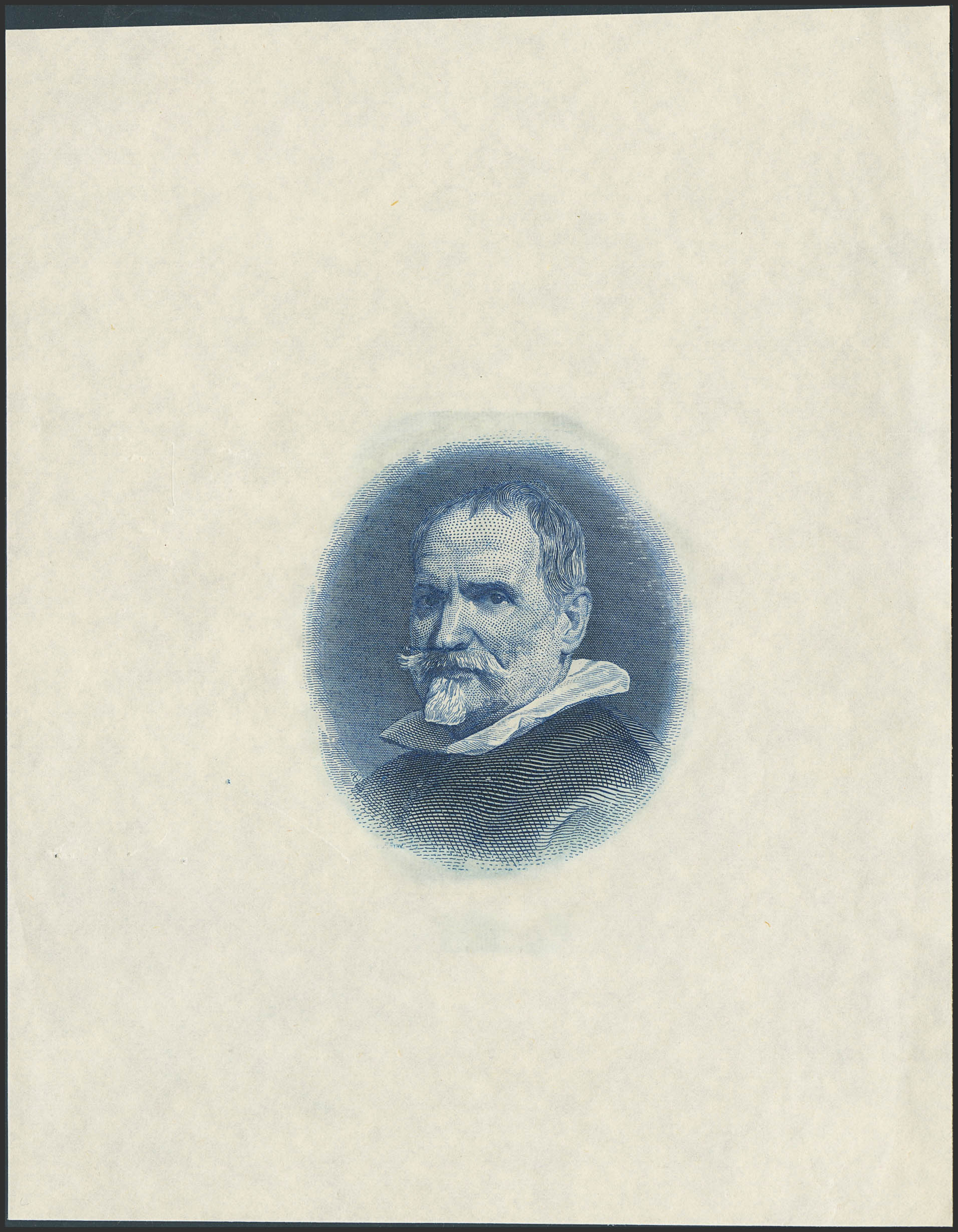 Prueba calcográfica del busto de Juan Martínez Montañés obra de Velázquez, en color azul y utilizado en un Título de Deuda Pública Amortizable de 1942. SC.