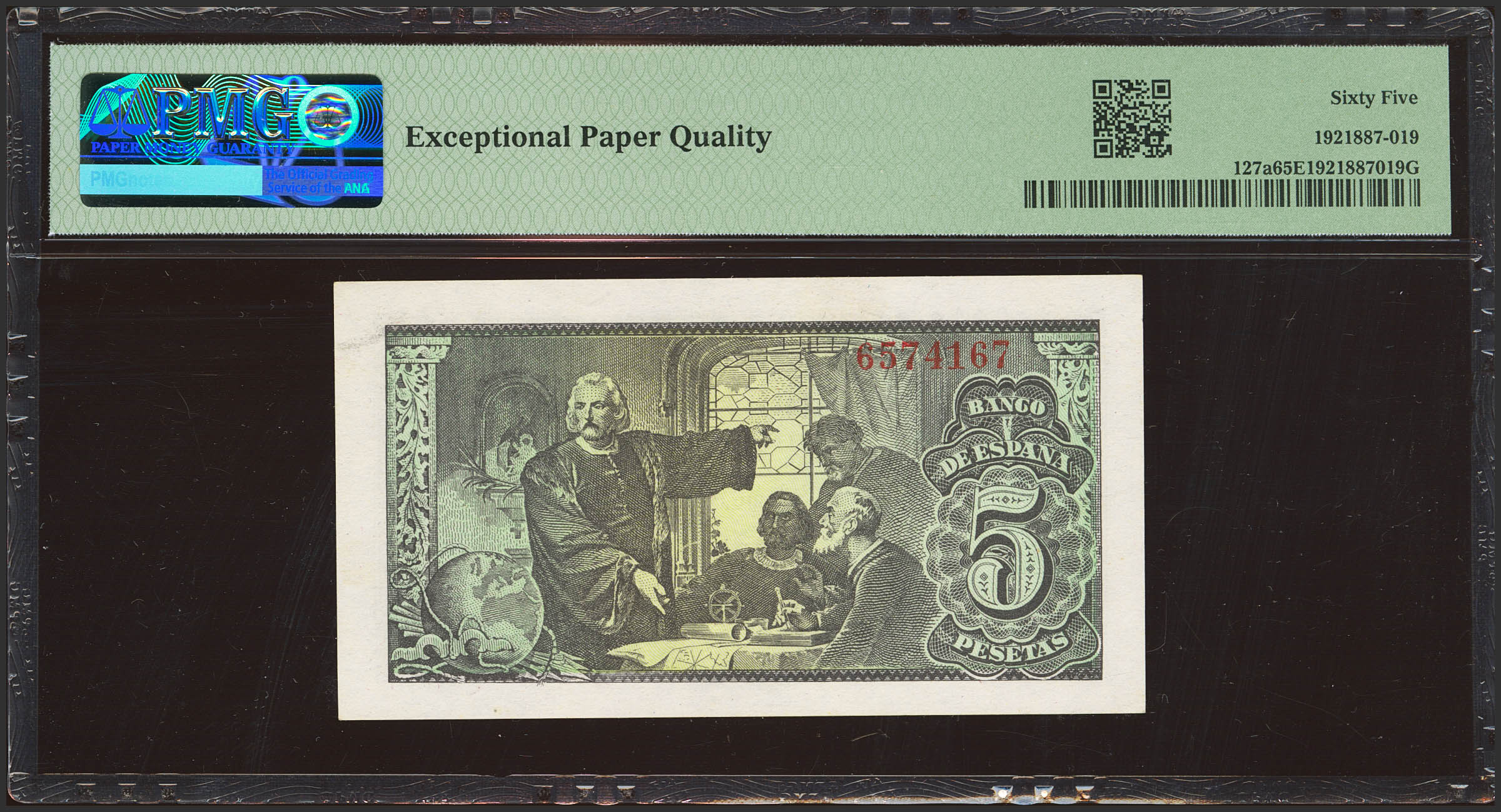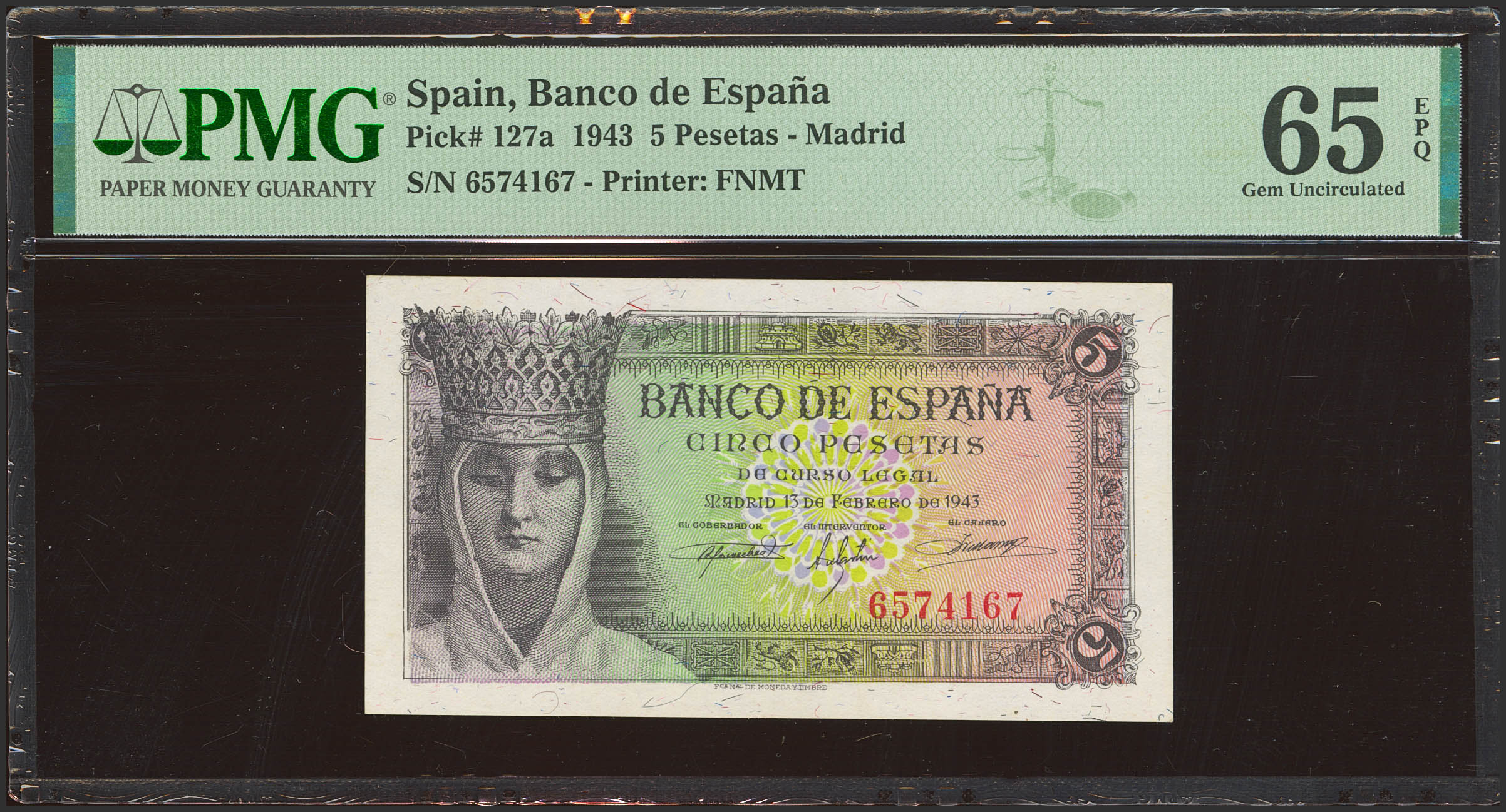 5 Pesetas. 13 de Febrero de 1943. Sin serie. (Edifil 2021: 446, Pick: 127a). Inusual en esta excepcional calidad, apresto original. SC. Encapsulado PMG65EPQ.