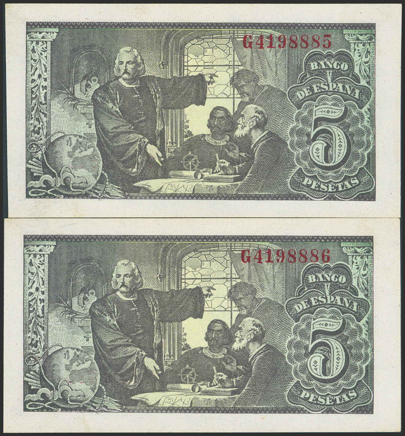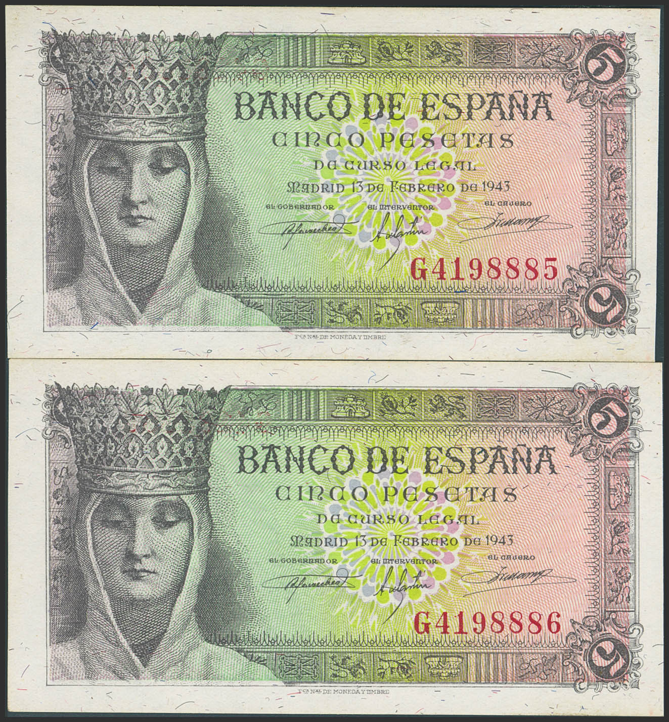 1 Peseta. 13 de Febrero de 1943. Pareja correlativa. Serie G. (Edifil 2023: 446a). Conserva todo su apresto original, manchitas del tiempo. SC-.