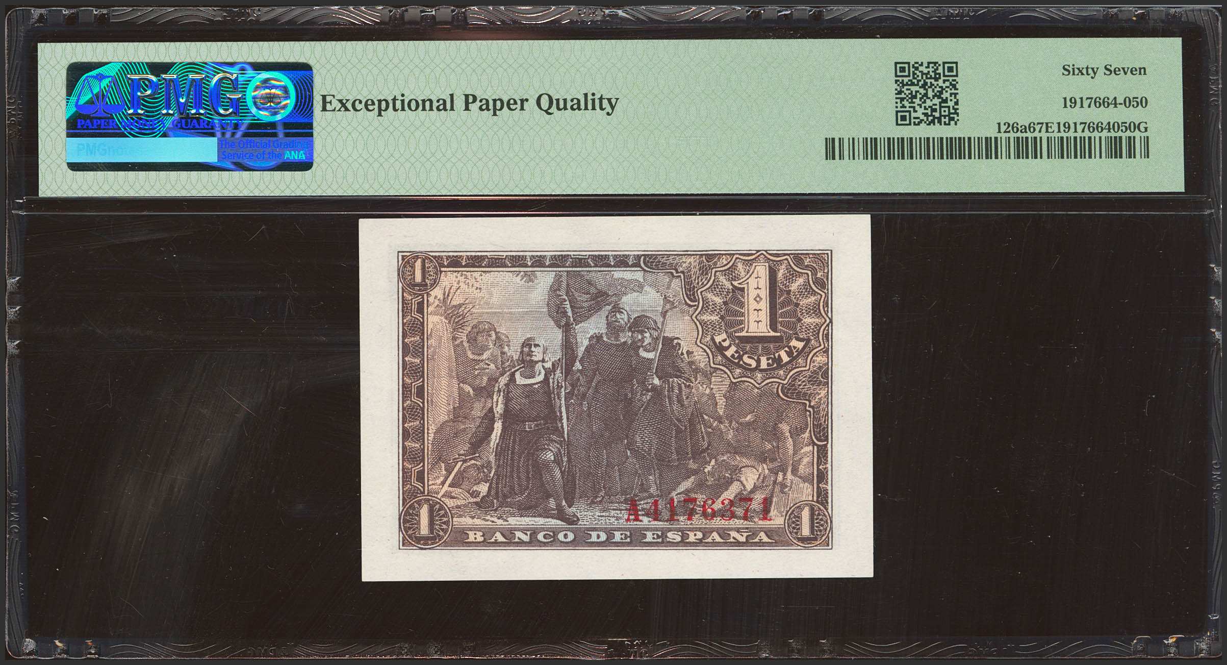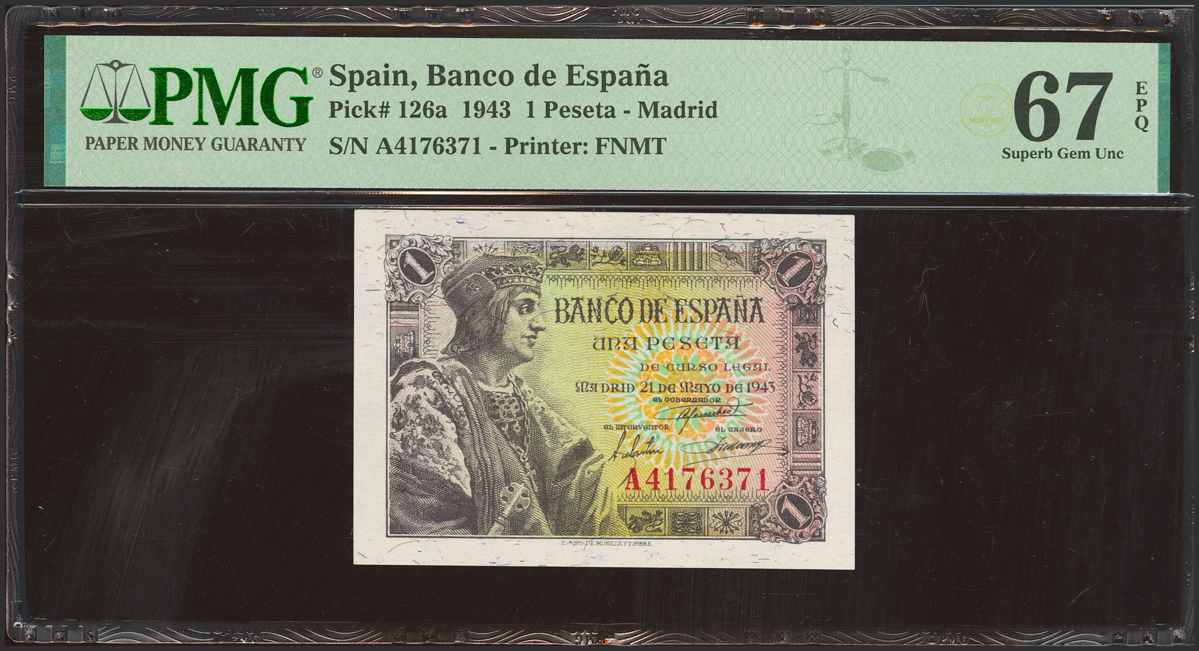 1 Peseta. 21 de Mayo de 1943. Serie A. (Edifil 2023: 447a, Pick: 126a). Apresto original. SC. Encapsulado PMG67EPQ.