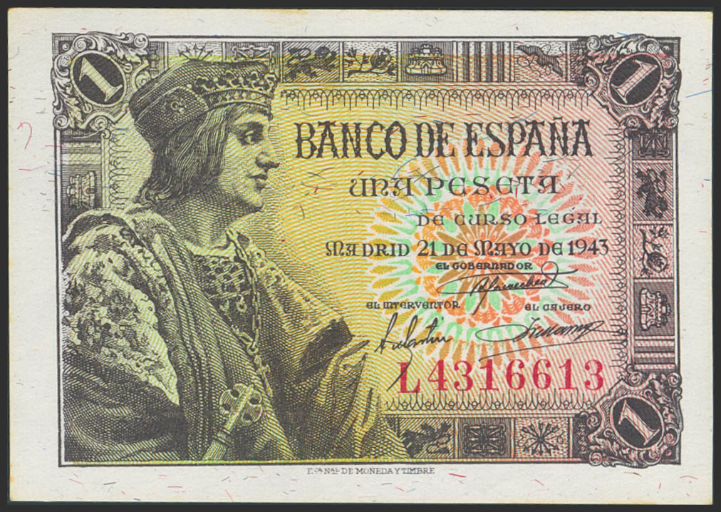 1 Peseta. 21 de Mayo de 1943. Serie L. (Edifil 2023: 447a). Apresto original. SC-.