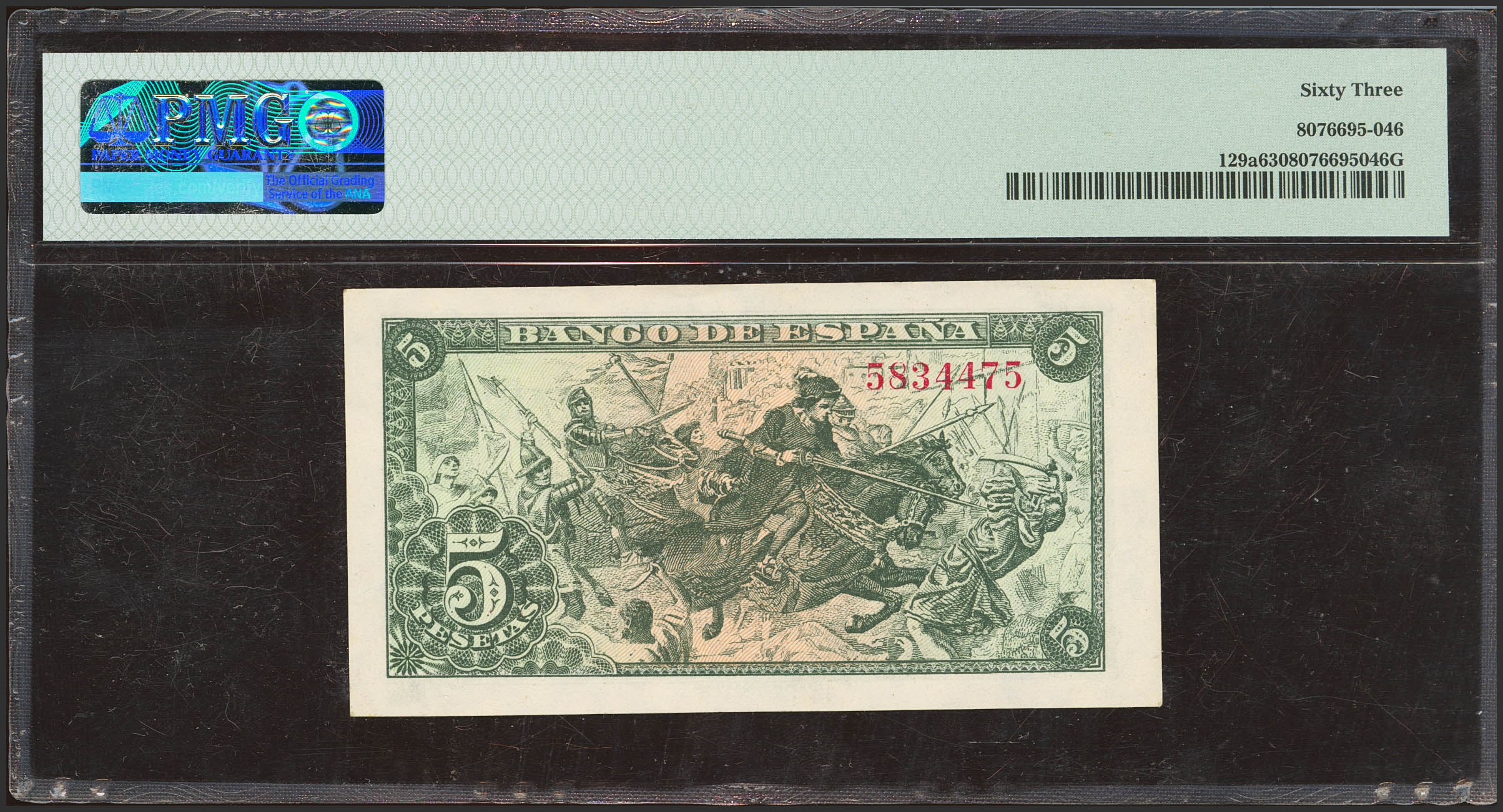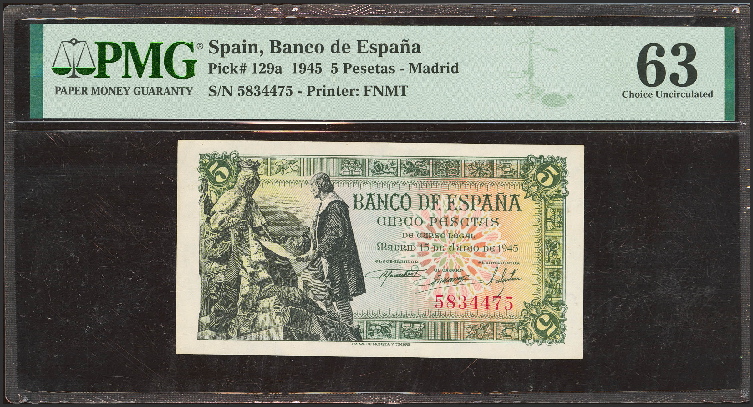 5 Pesetas. 15 de Junio de 1945. Sin serie. (Edifil 2023: 449, Pick: 129a). Inusual en esta calidad. SC. Encapsulado PMG63.
