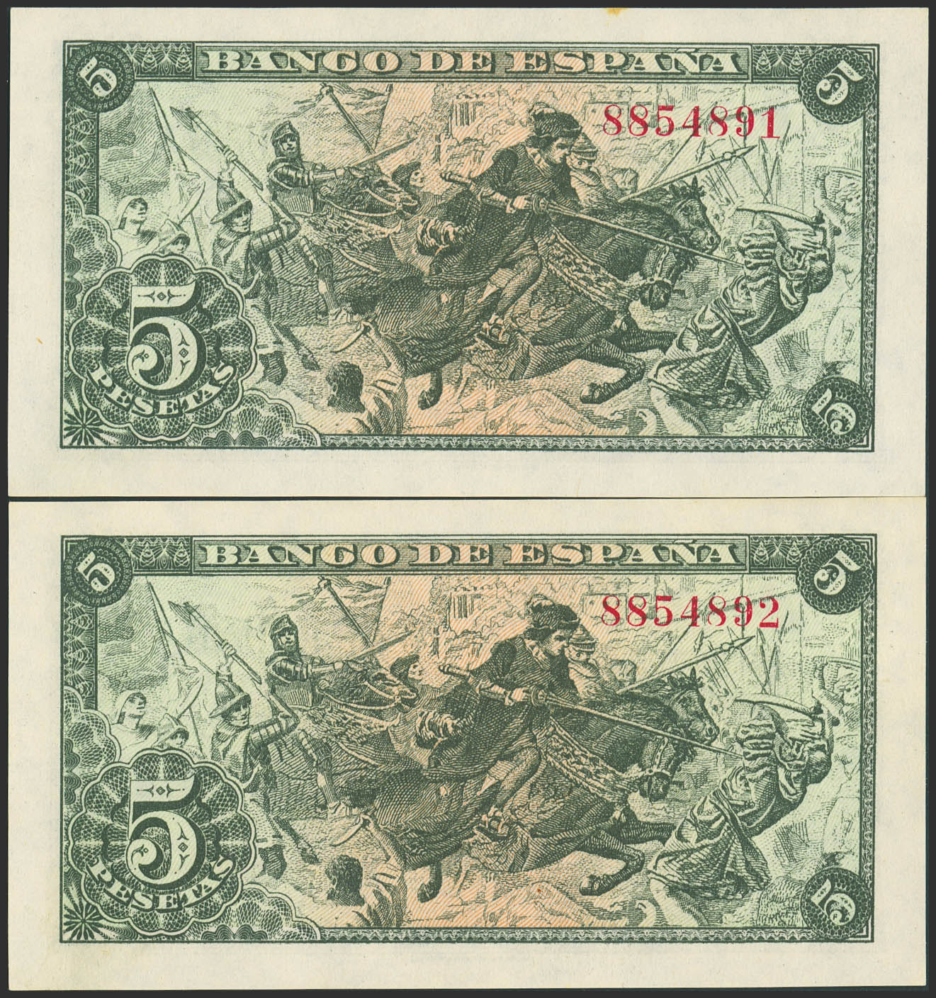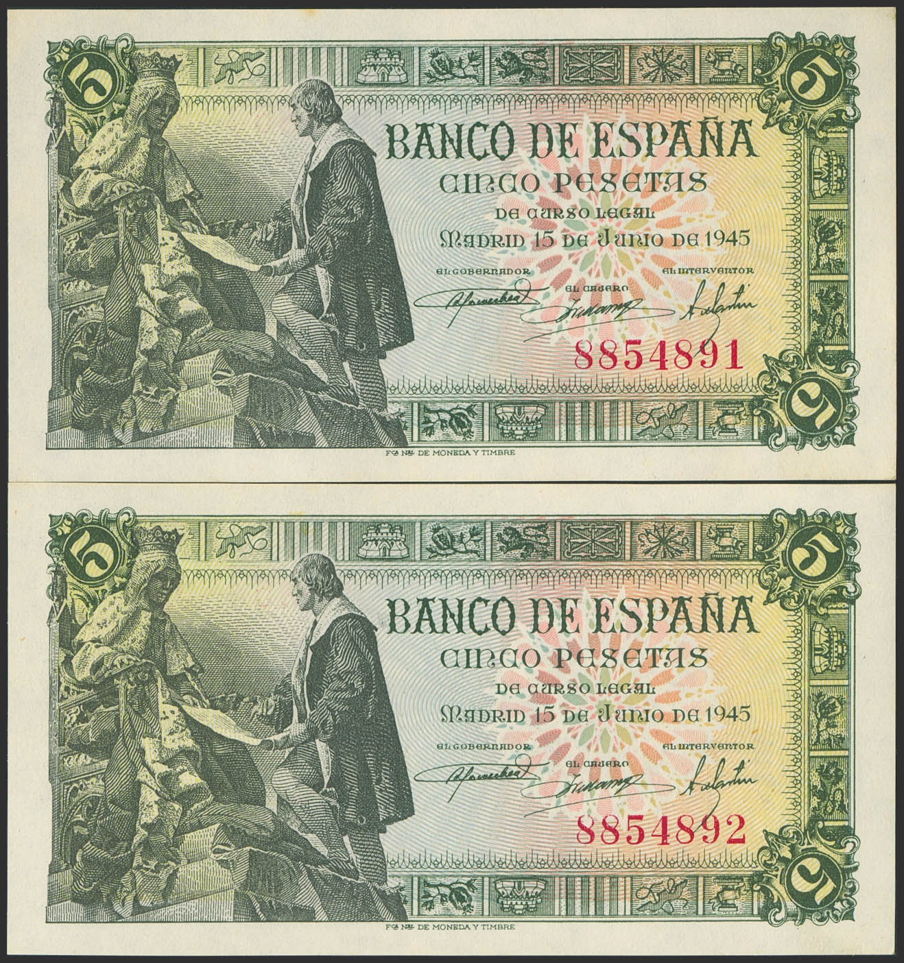 5 Pesetas. 15 de Junio de 1945. Pareja correlativa. Sin serie. (Edifil 2023: 449). Apresto original. SC-.