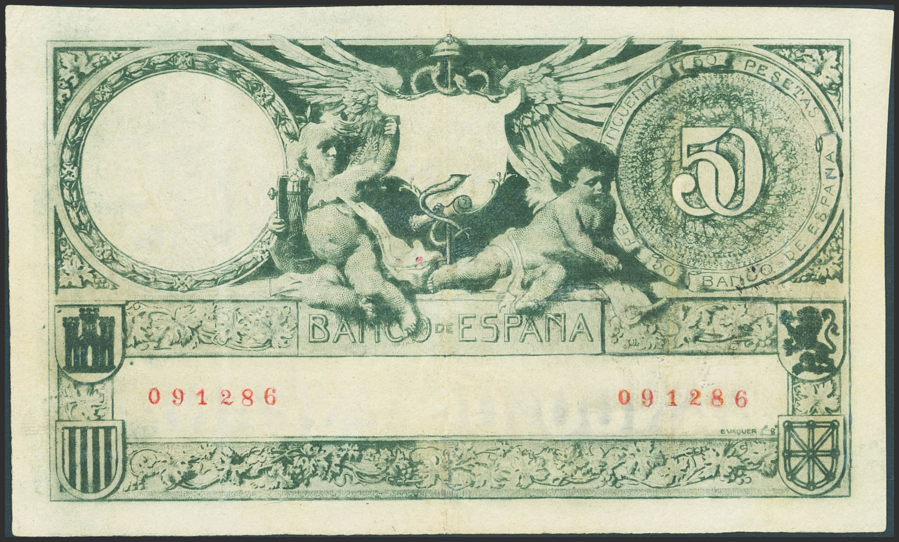 50 Pesetas. 19 de Marzo de 1905. Falso de Epoca. Sin serie. (Edifil 2023: 312F, Cobo: 31). Unico conocido de este tipo a la fecha de hoy, sin duda un ejemplar de especial factura y que ha sido descubierto recientemente, tratándose de un tipo desconocido y no registrado hasta ahora, mínima reparación. MBC+.Agradecemos a Ramón Cobo Huici su colaboración en la contextualización de este billete falso de época dentro de la notafilia española, PDF adjunto.