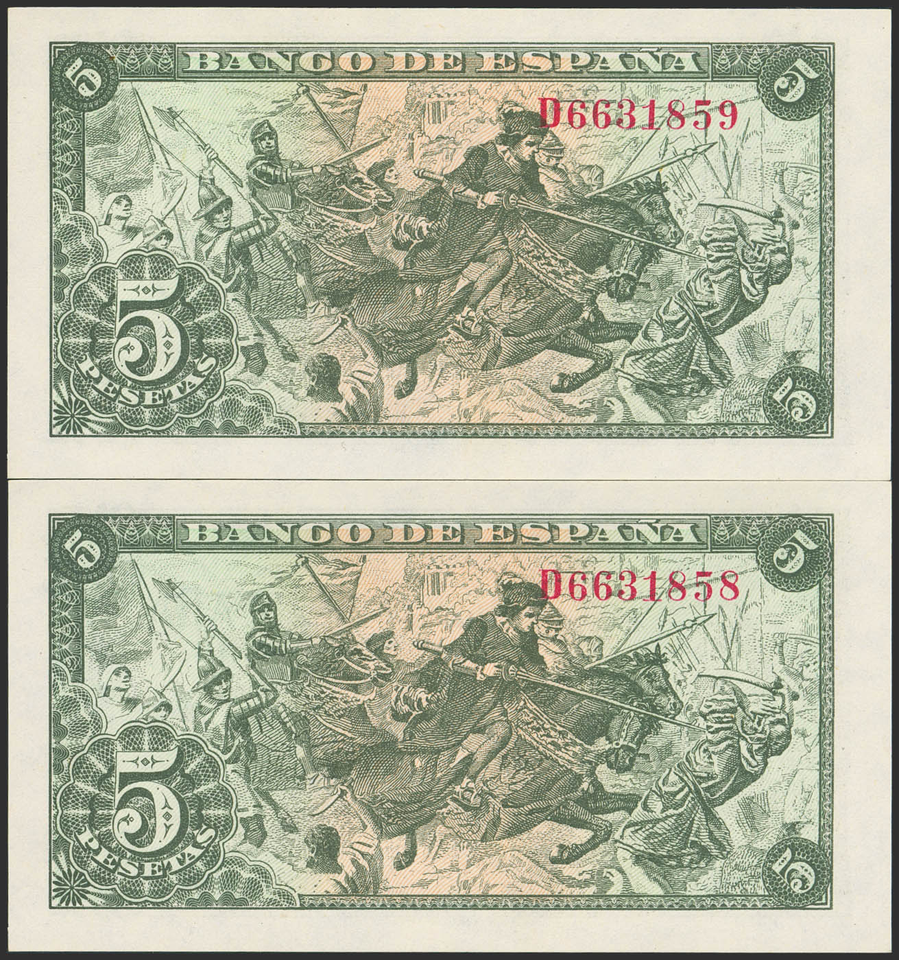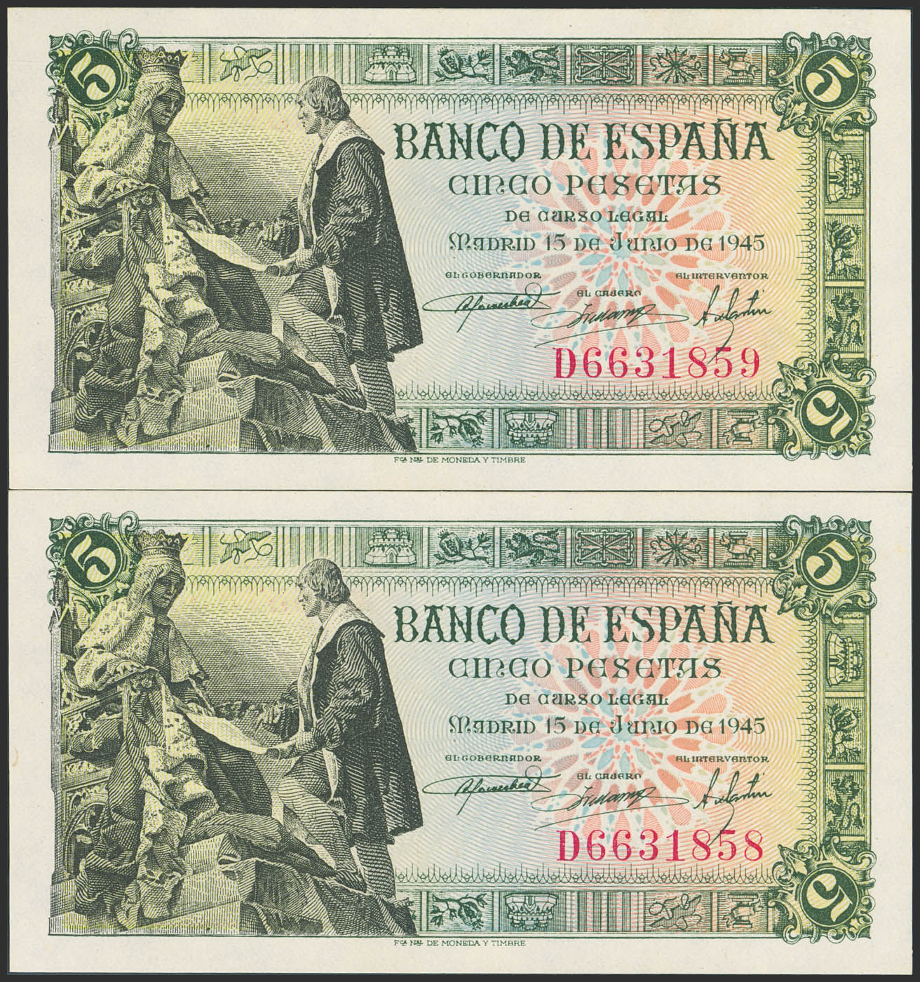 5 Pesetas. 15 de Junio de 1945. Pareja correlativa. Serie D. (Edifil 2023: 449a). Conserva todo su apresto original. SC.