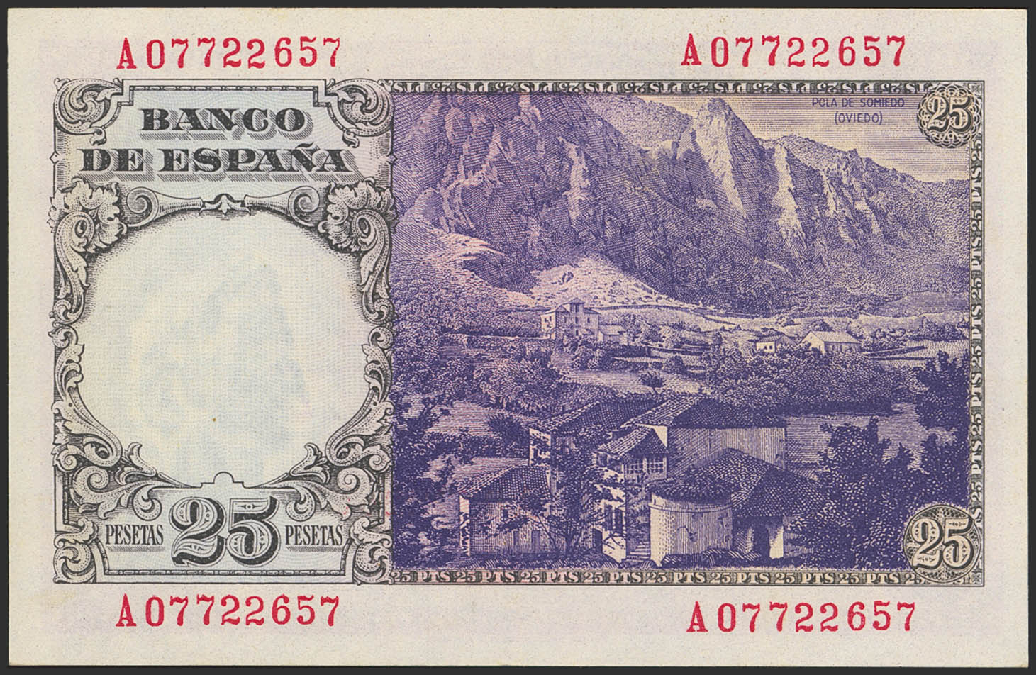 25 Pesetas. 19 de Febrero de 1946. Serie A. (Edifil 2023: 450a). Apresto original. EBC+++.