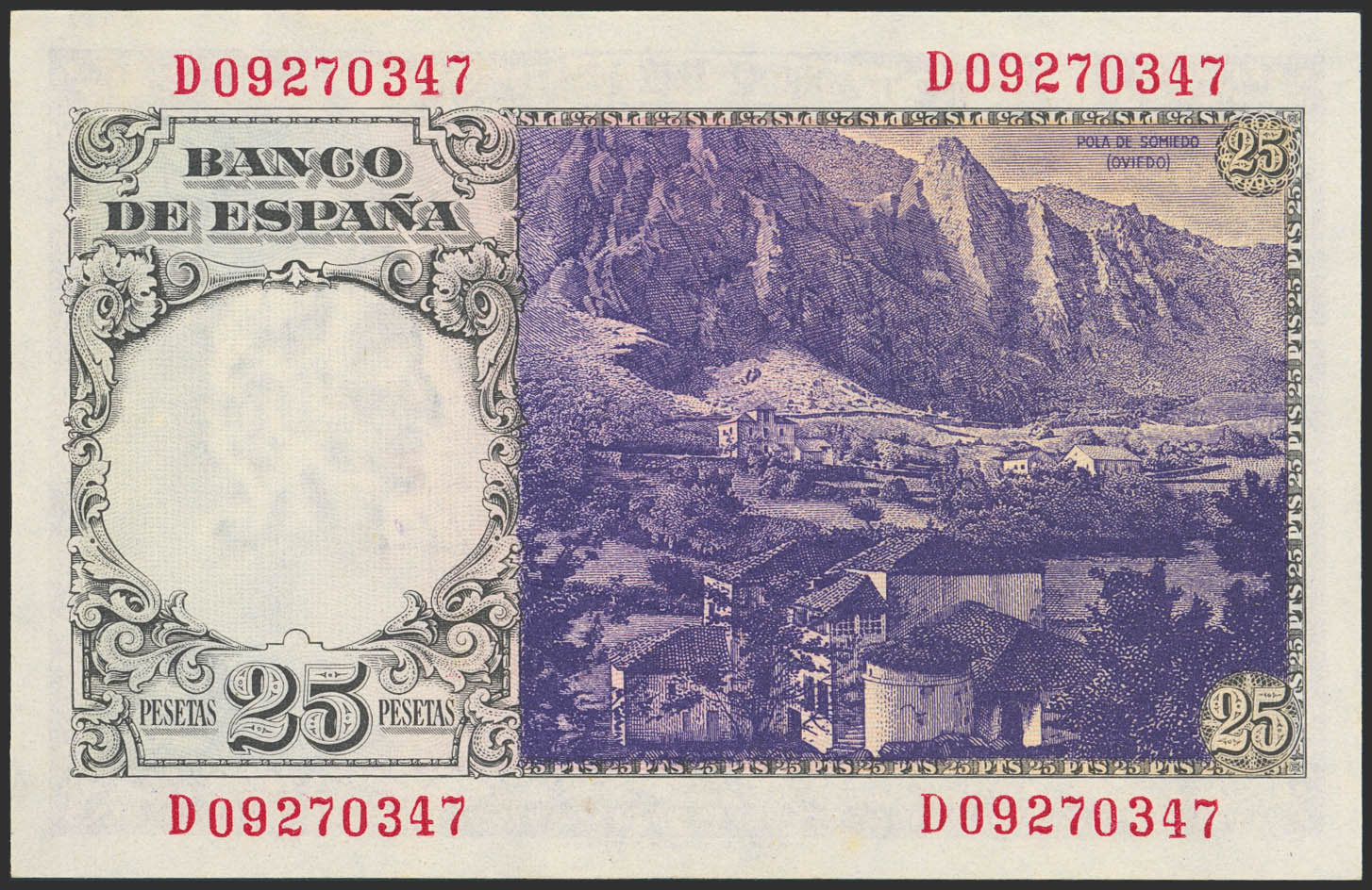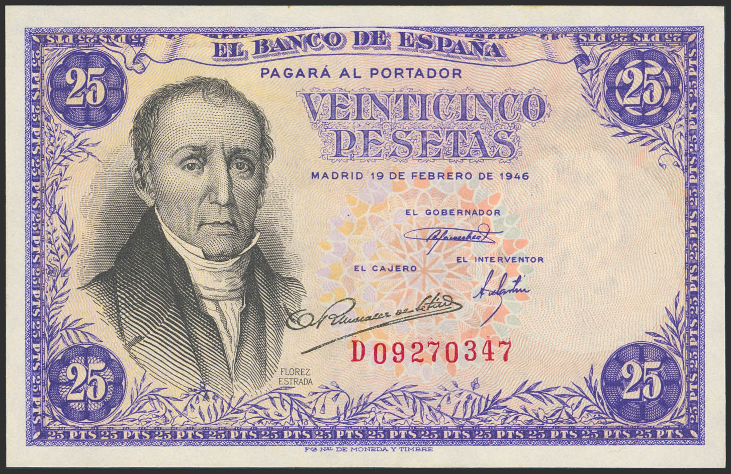 25 Pesetas. 19 de Febrero de 1946. Serie D. (Edifil 2023: 450a). Apresto original. SC.