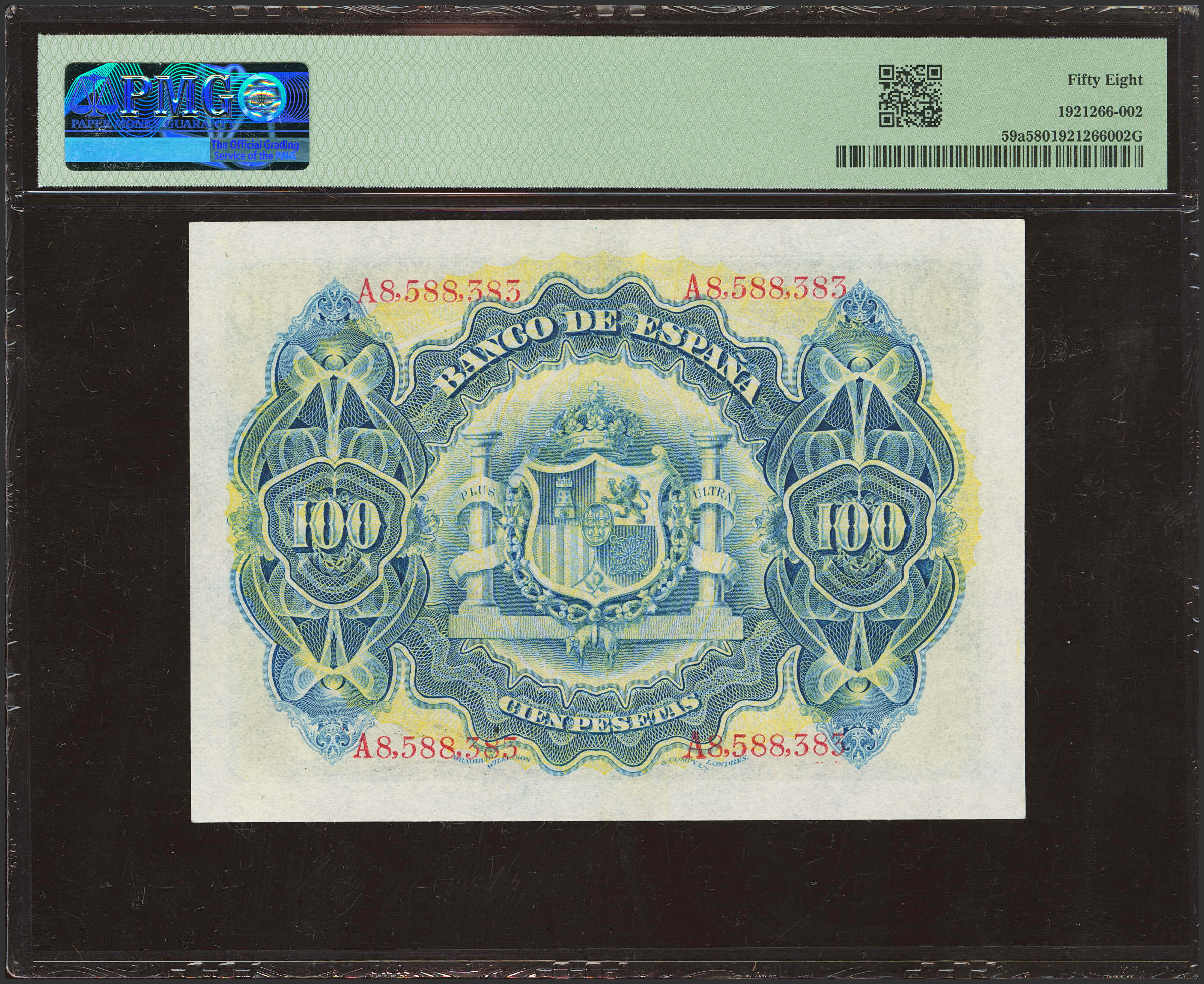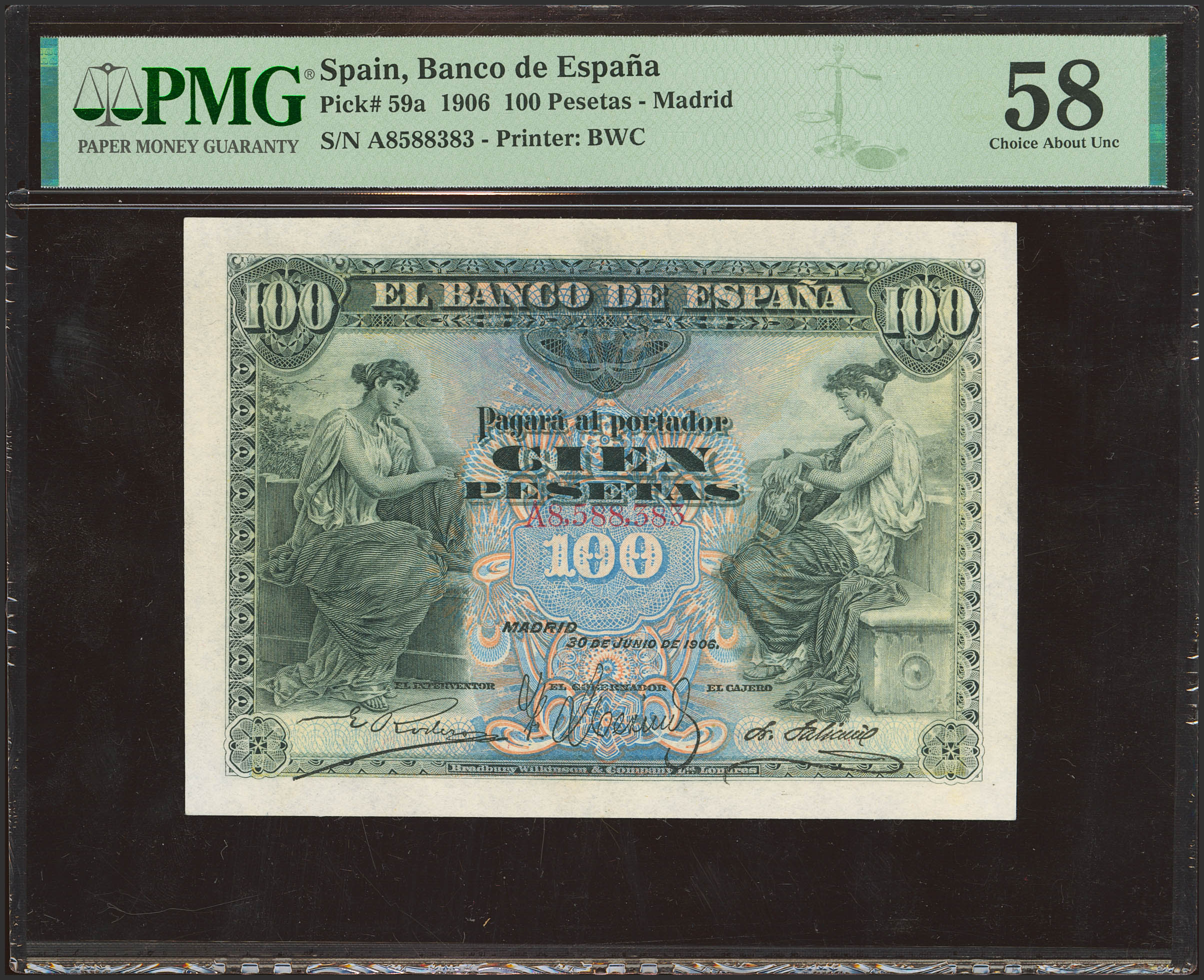 100 Pesetas. 30 de Junio de 1906. Serie A. (Edifil 2023: 313a, Pick: 59a). EBC++. Encapsulado PMG58.