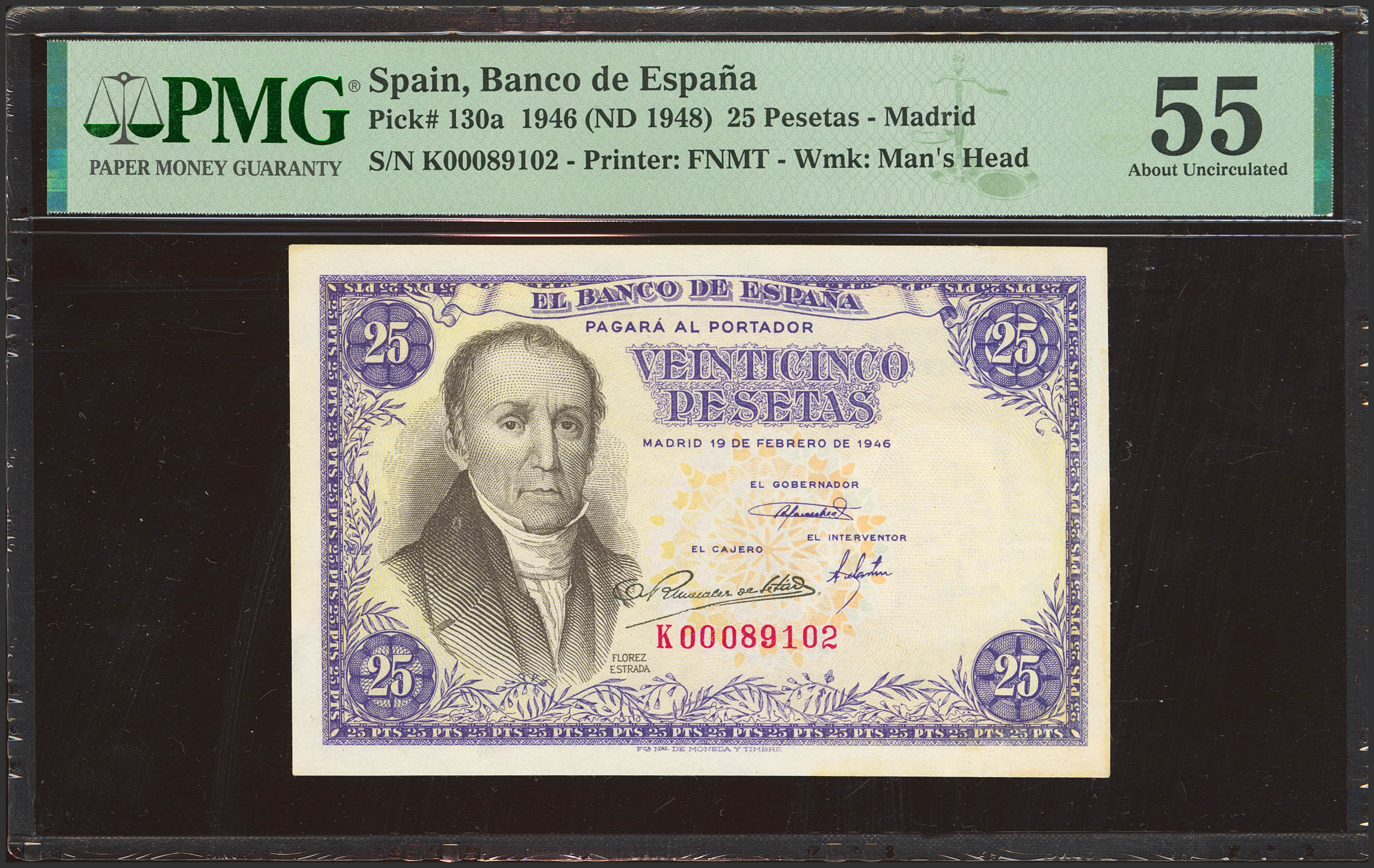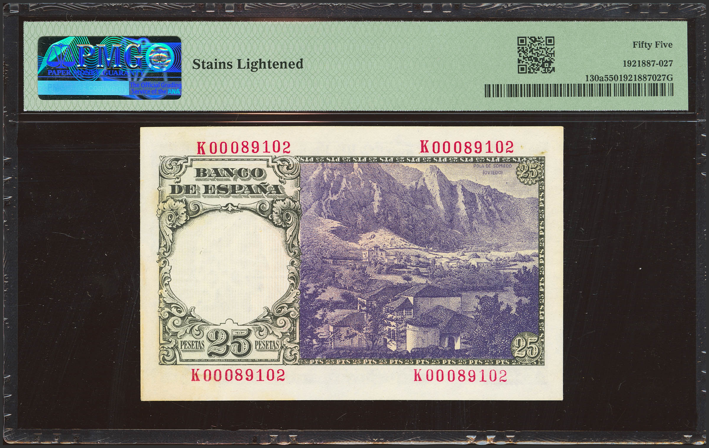 25 Pesetas. 19 de Febrero de 1946. Serie K, última serie emitida. (Edifil 2023: 450a, Pick: 130a). Muy rara serie, manchitas del tiempo sin ninguna importancia. EBC+. Encapsulado PMG55 (stains ligthened).