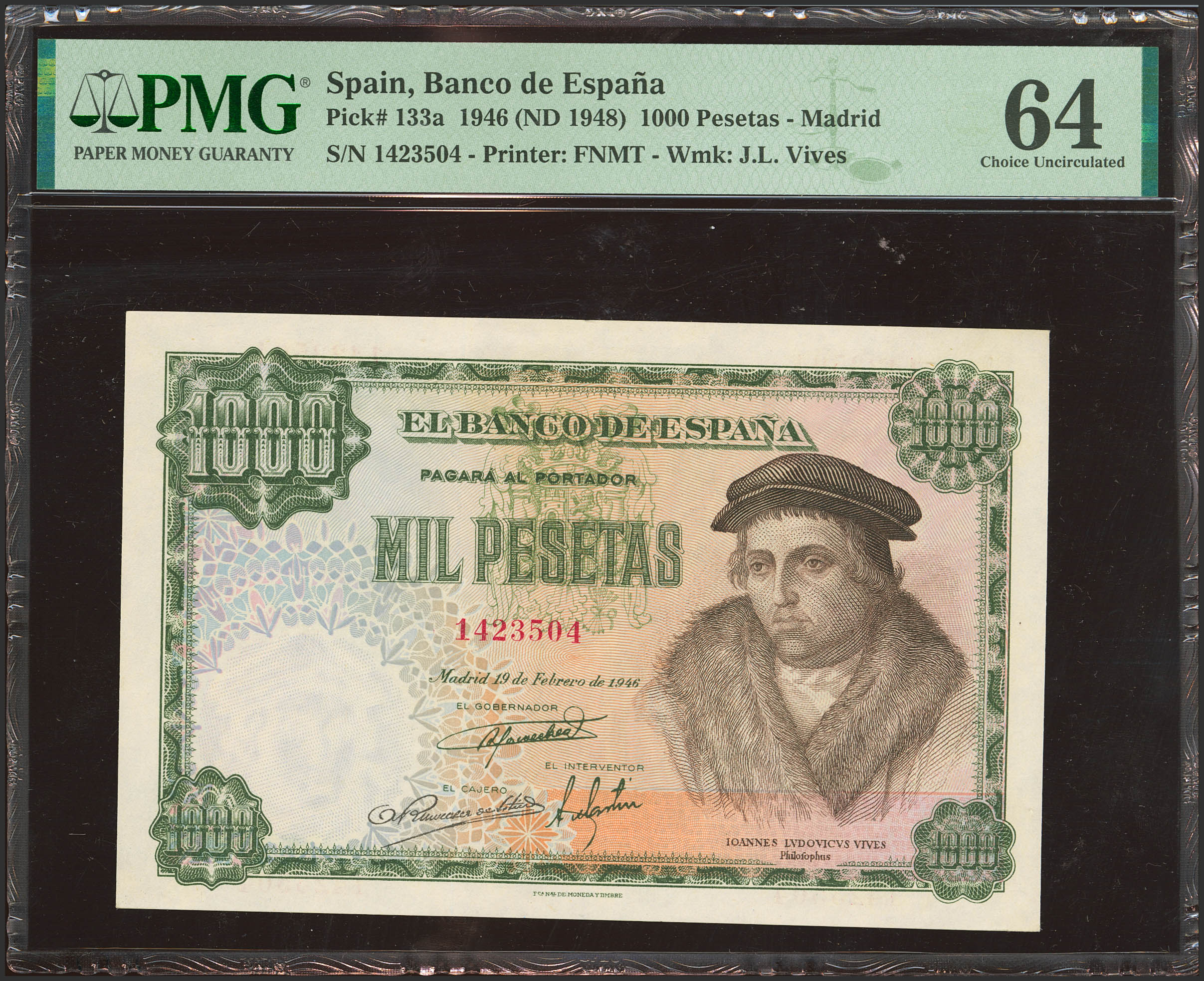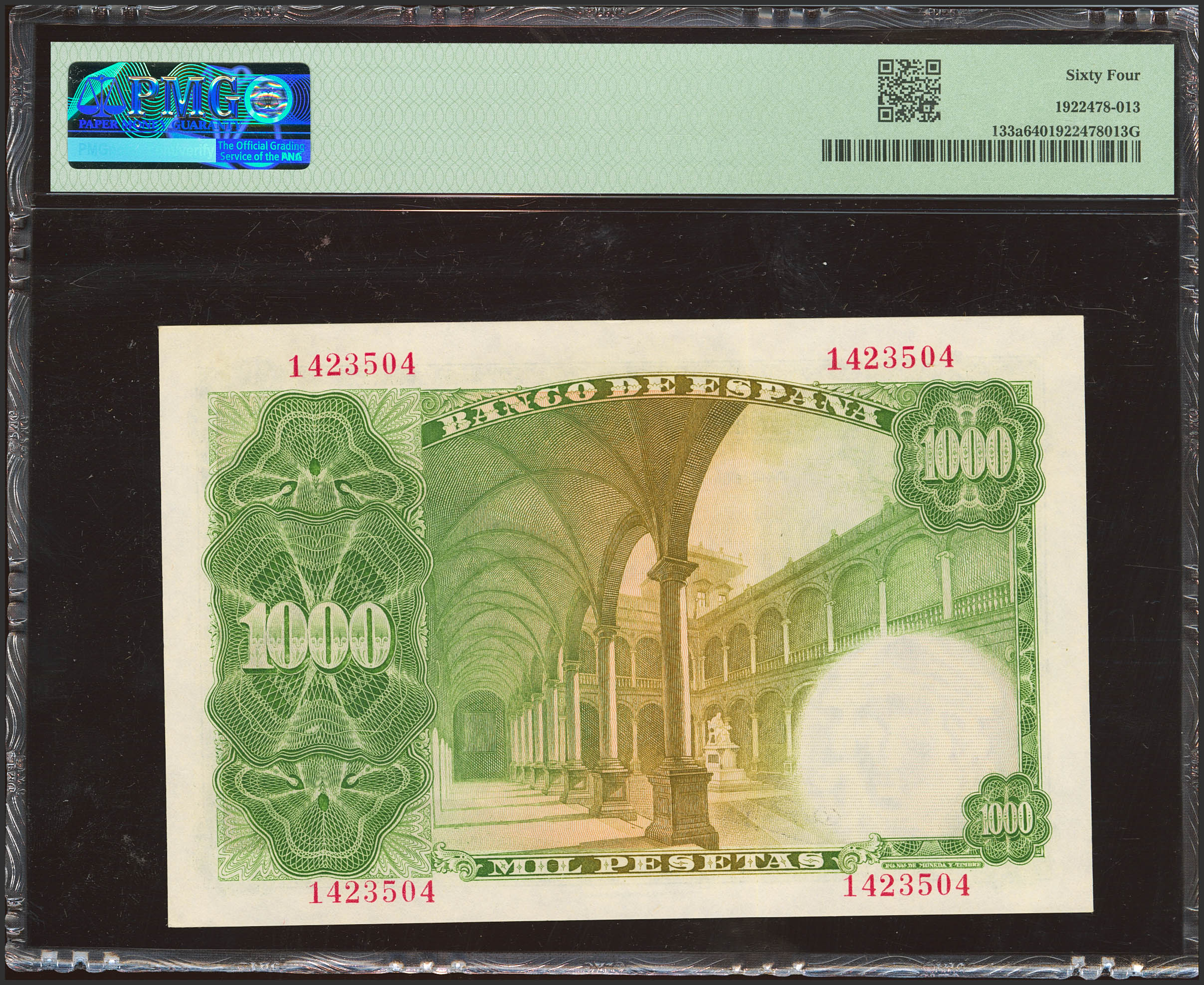 1000 Pesetas. 19 de Febrero de 1946. Sin serie. (Edifil 2023: 453, Pick: 133a). Extraordinariamente raro, especialmente en esta excepcional calidad. SC. Encapsulado PMG64 (para hacernos idea de la rareza, a fecha 1 de Mayo de 2025, este billete es el tercer mejor calificado junto a otro billete en PMG).