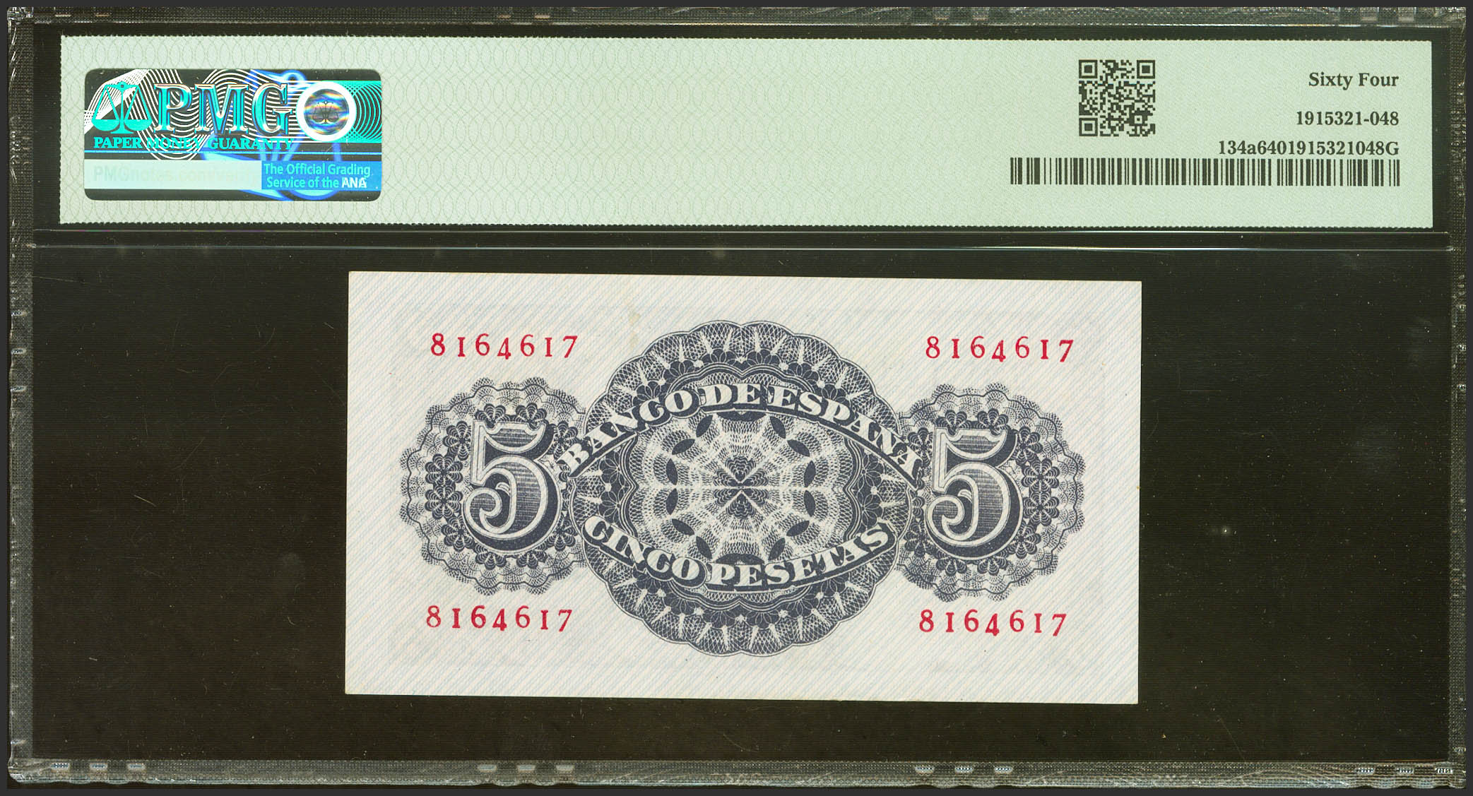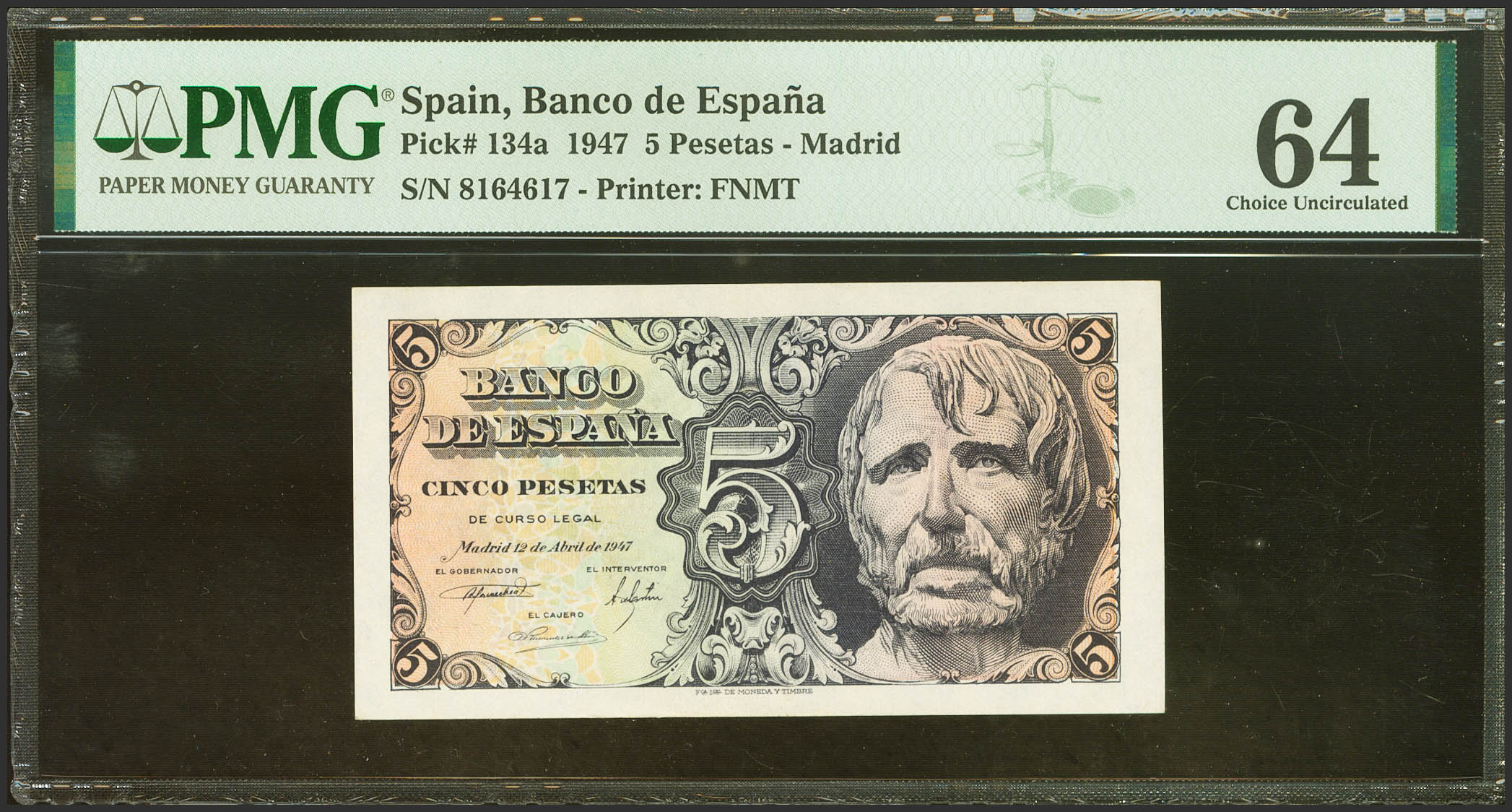 5 Pesetas. 12 de Abril de 1947. Sin serie. (Edifil 2023: 454, Pick: 134a). SC. Encapsulado PMG64.