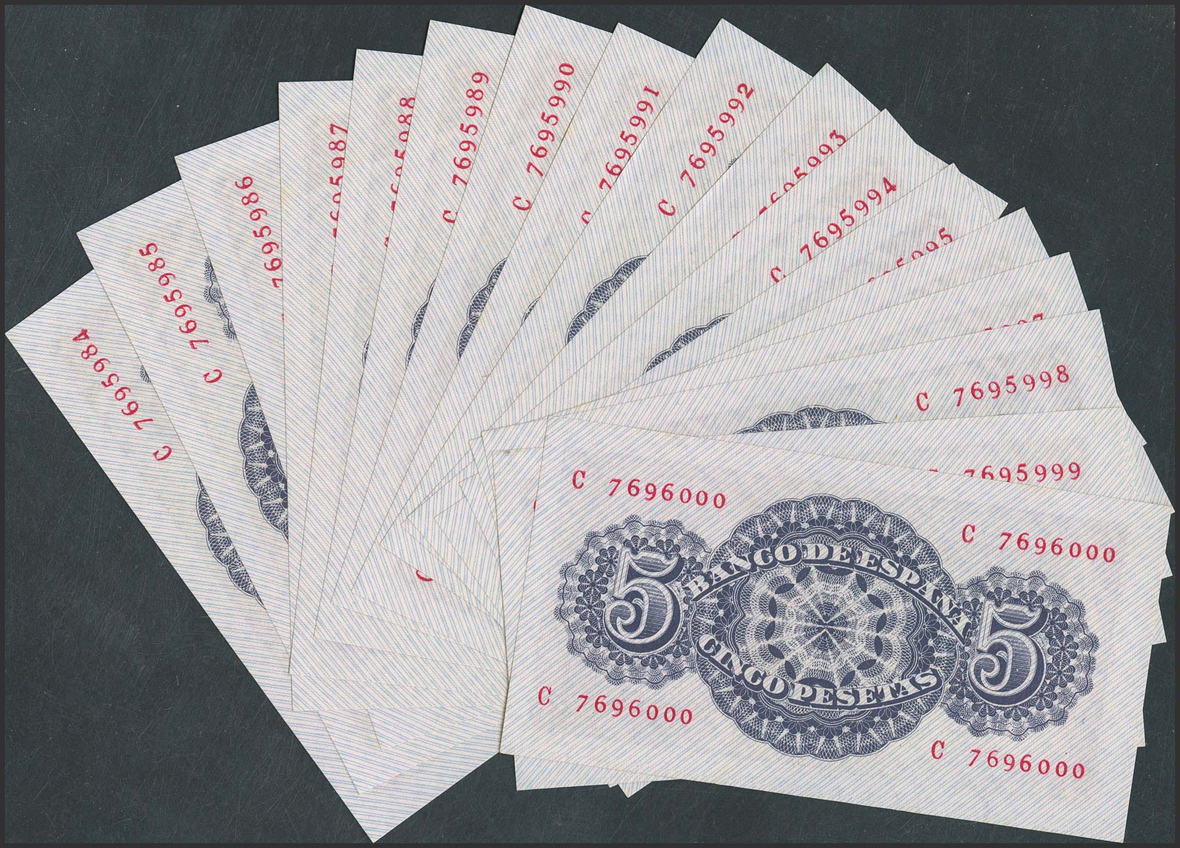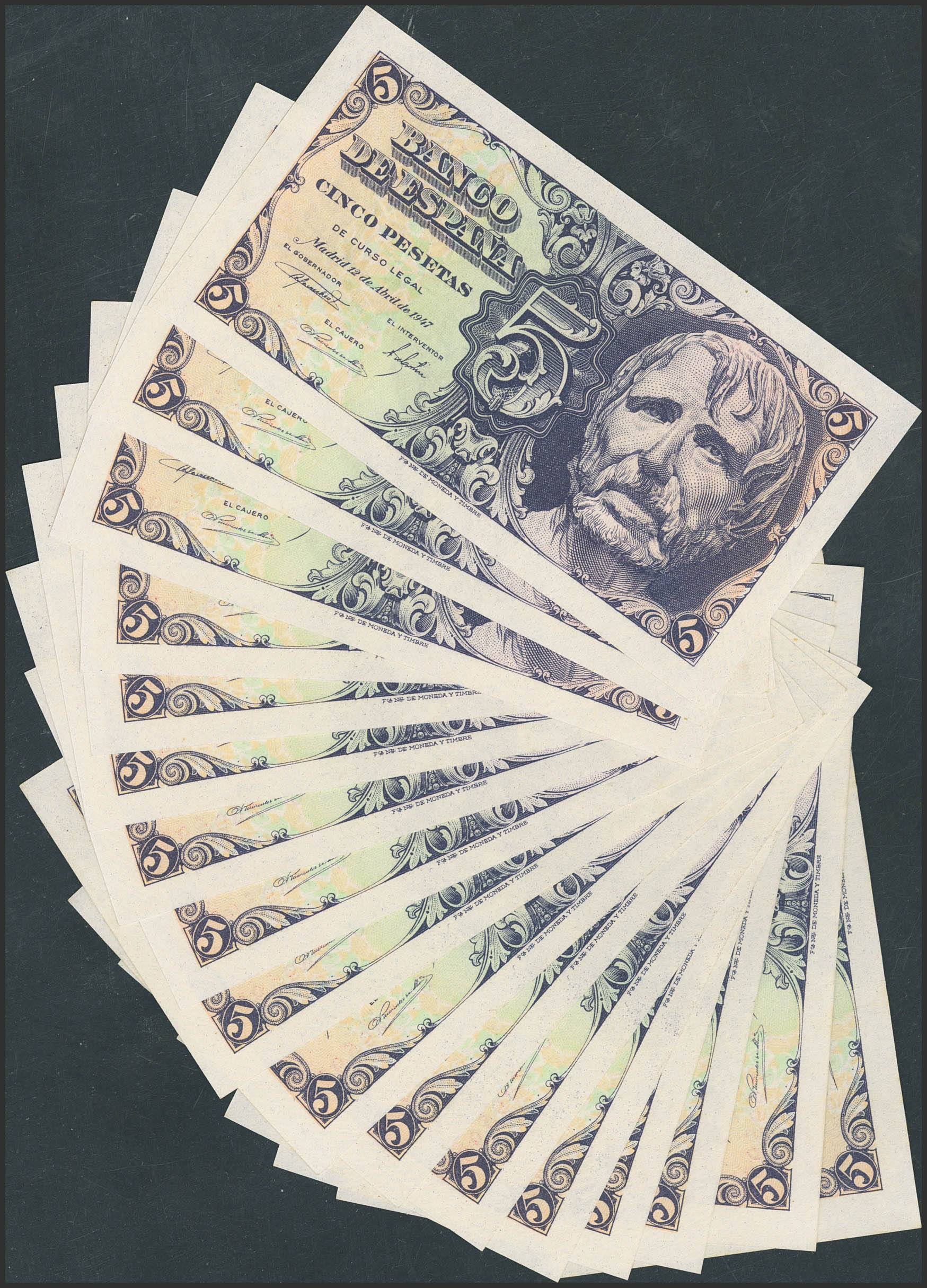 Conjunto de 17 billetes correlativos de 5 Pesetas emitidos el 12 de Abril de 1947, con la serie C (Edifil 2023: 454a), conservando su apresto original. EBC+++/SC--.
