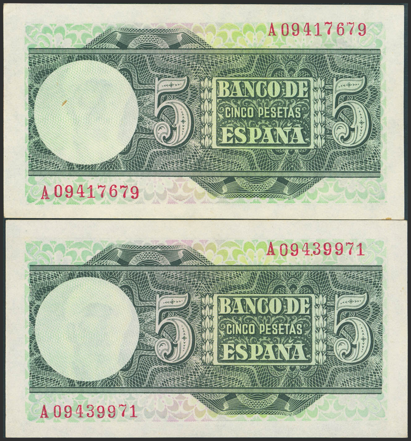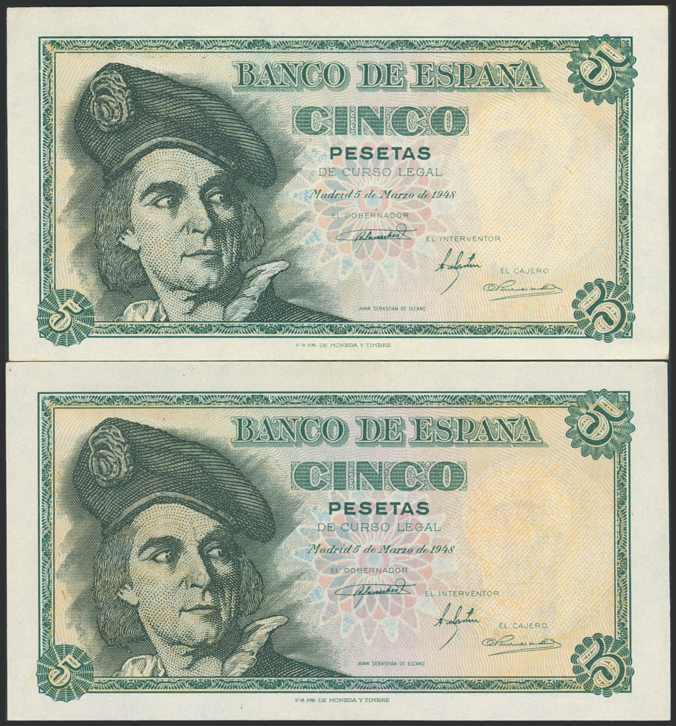 Conjunto de 2 billetes de 5 Pesetas emitidos el 5 de Marzo de 1948, ambos con la Serie A. (Edifil 2023: 455a). Apresto original. SC-.