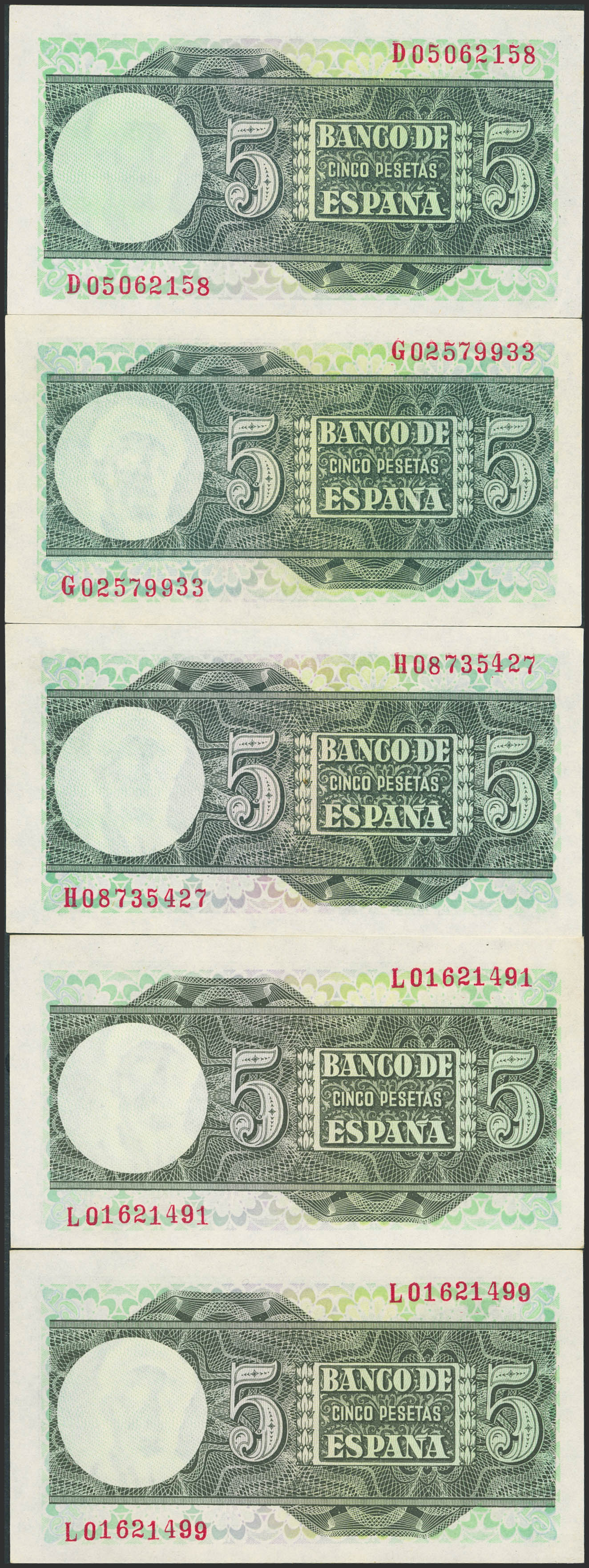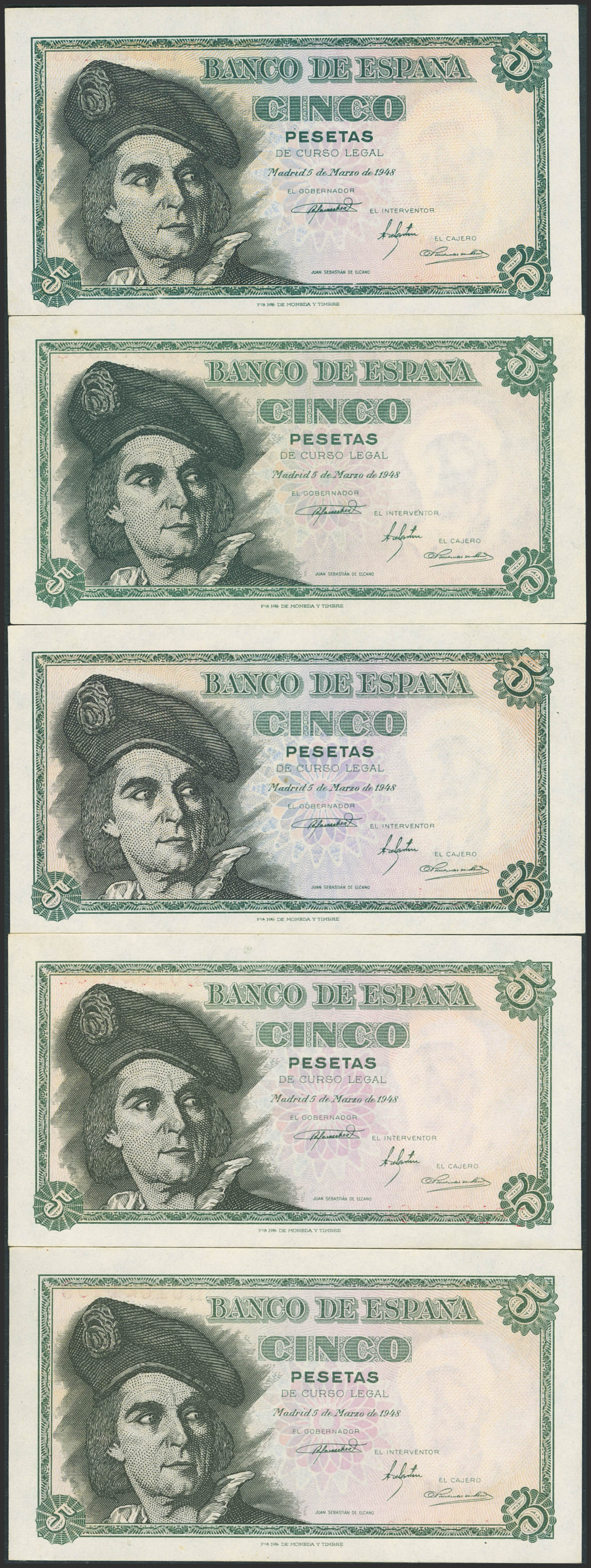 Conjunto de 5 billetes correlativos de 5 Pesetas emitidos el 5 de Marzo de 1948 con las series D, G, H y L(2). (Edifil 2023: 455a). EBC.