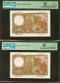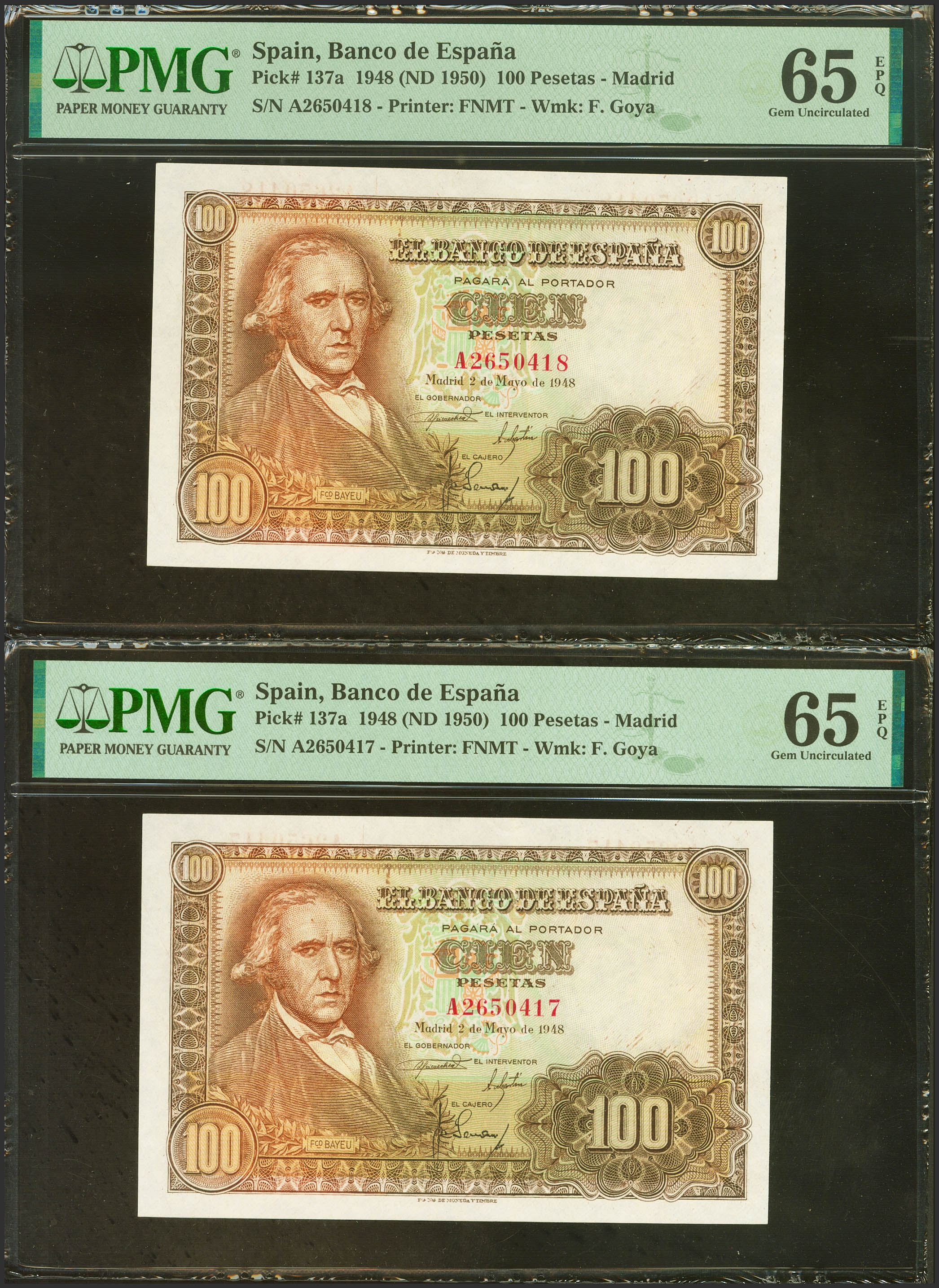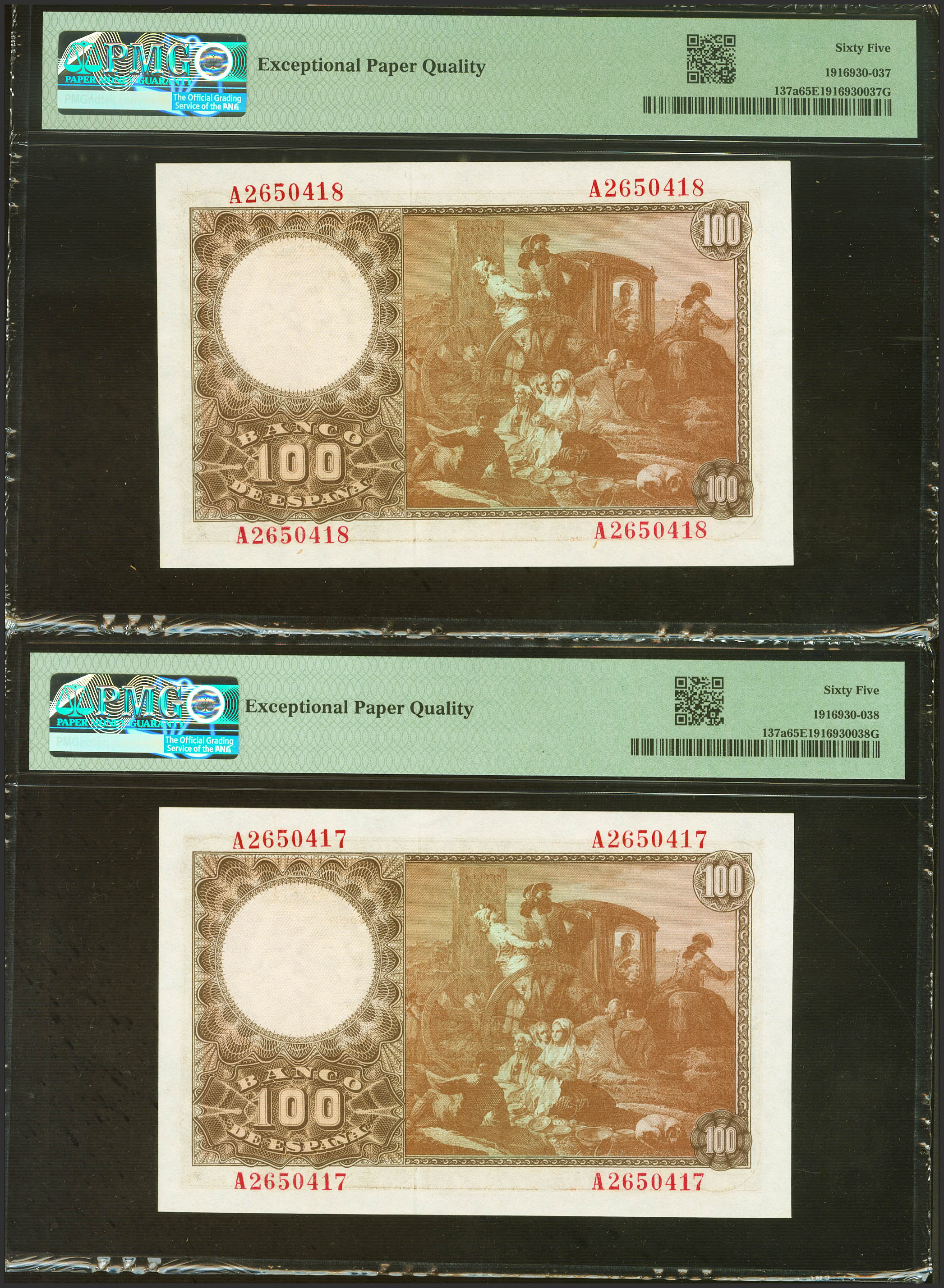 100 Pesetas. 2 de Mayo de 1948. Pareja correlativa. Serie A. (Edifil 2023: 456a, Pick: 137a). Inusual en esta excepcional calidad, apresto original. SC. Encapsulados PMG65EPQ, ambos.