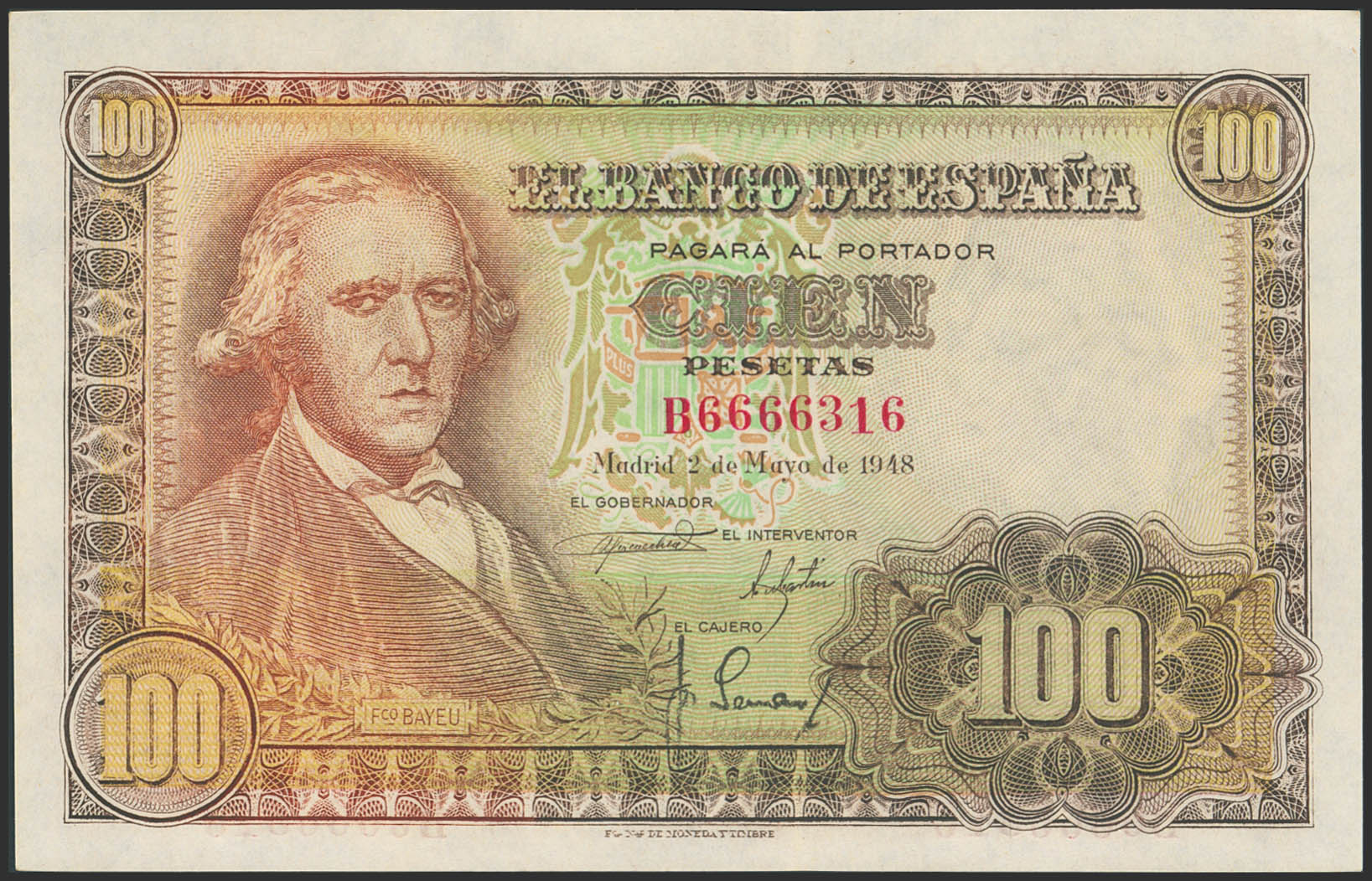 100 Pesetas. 2 de Mayo de 1948. Serie B. (Edifil 2023: 456a). Conserva gran parte del apresto original. EBC+++.