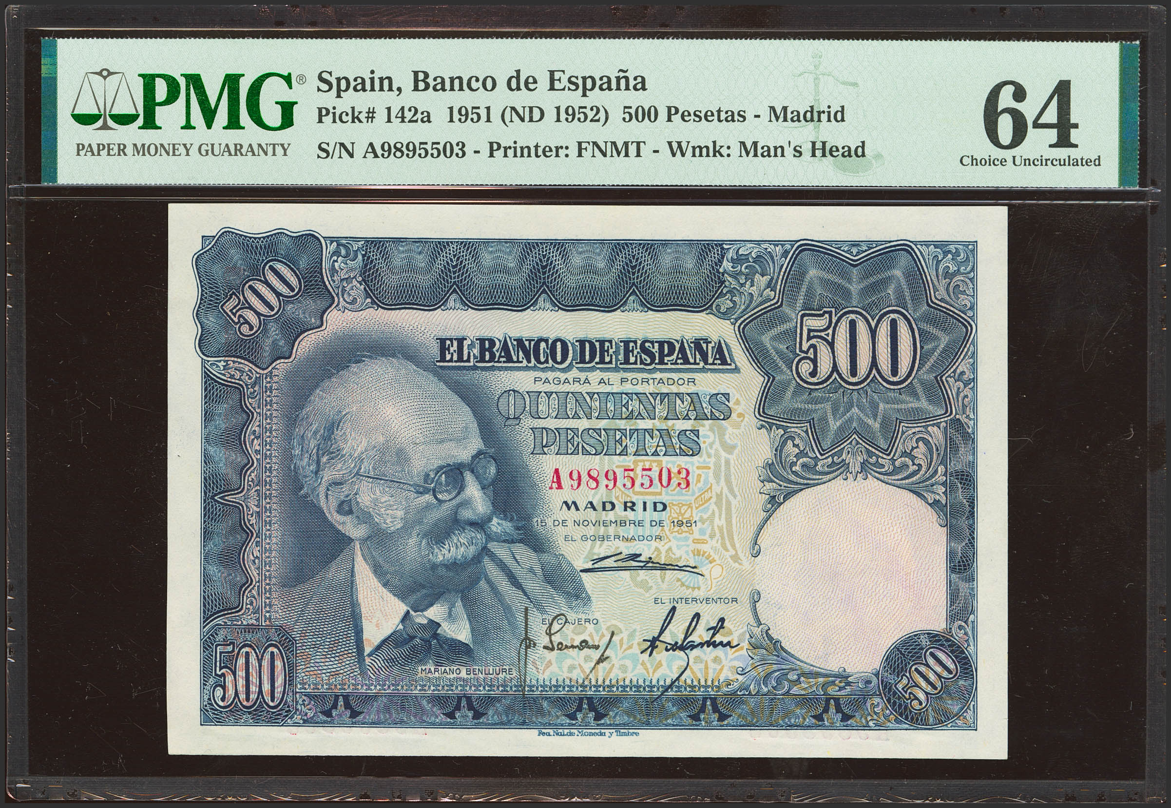 500 Pesetas. 15 de Noviembre de 1951. Serie A. (Edifil 2023: 460a, Pick: 142a). Puntito de aguja. SC. Encapsulado PMG64 (pinhole).