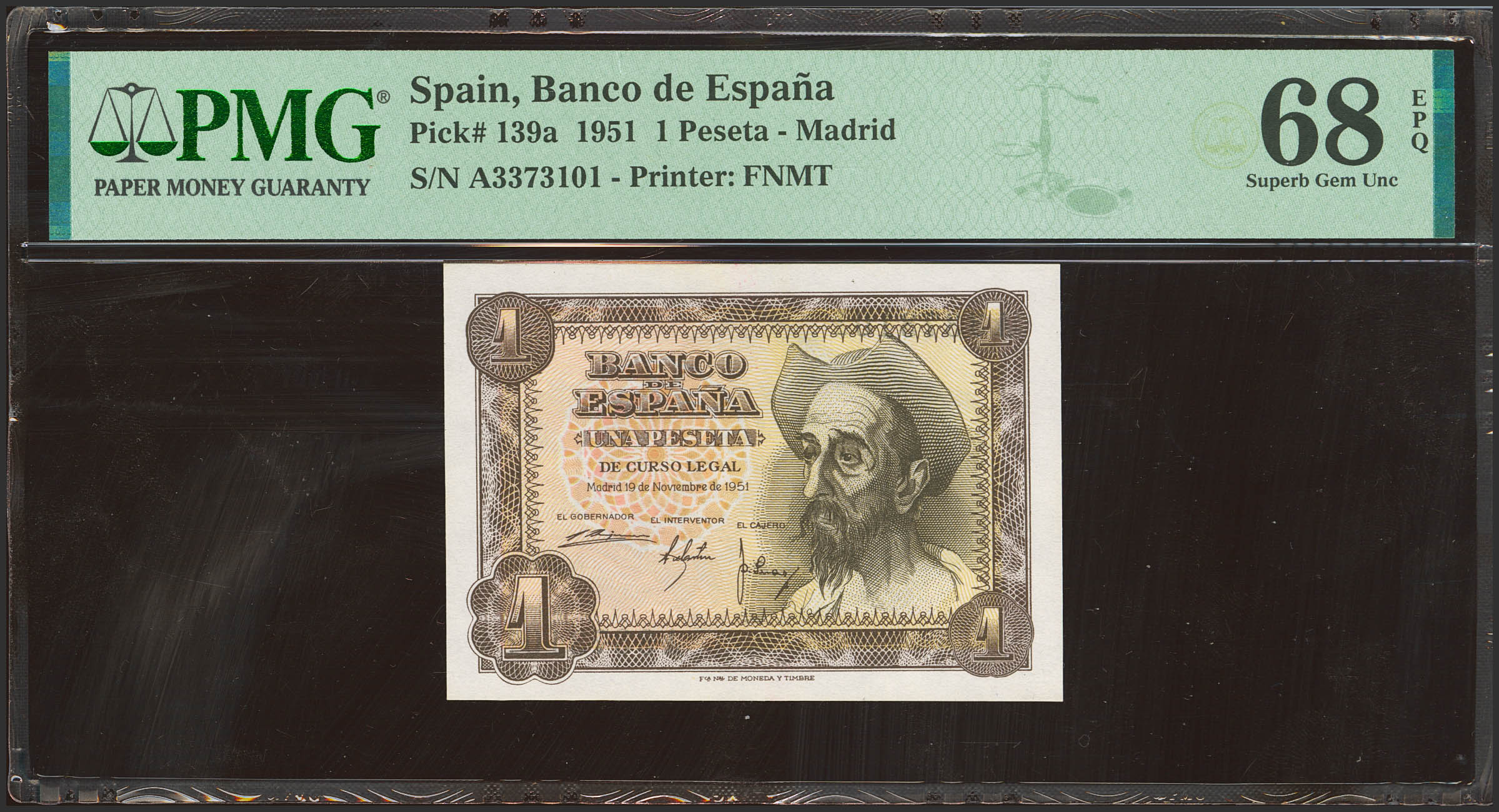 1 Peseta. 19 de Noviembre de 1951. Serie A. (Edifil 2023: 461a, Pick: 139a). Apresto original. SC. Encapsulado PMG68EPQ.