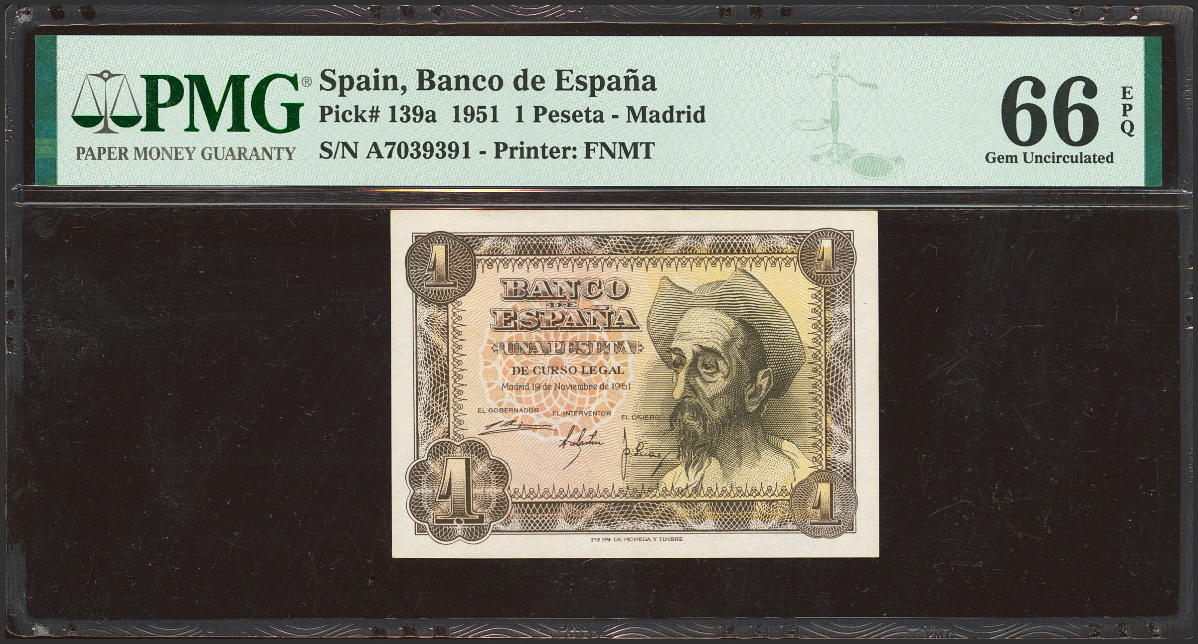 1 Peseta. 19 de Noviembre de 1951. Serie A. (Edifil 2023: 461a, Pick: 139a). Apresto original. SC. Encapsulado PMG66EPQ.