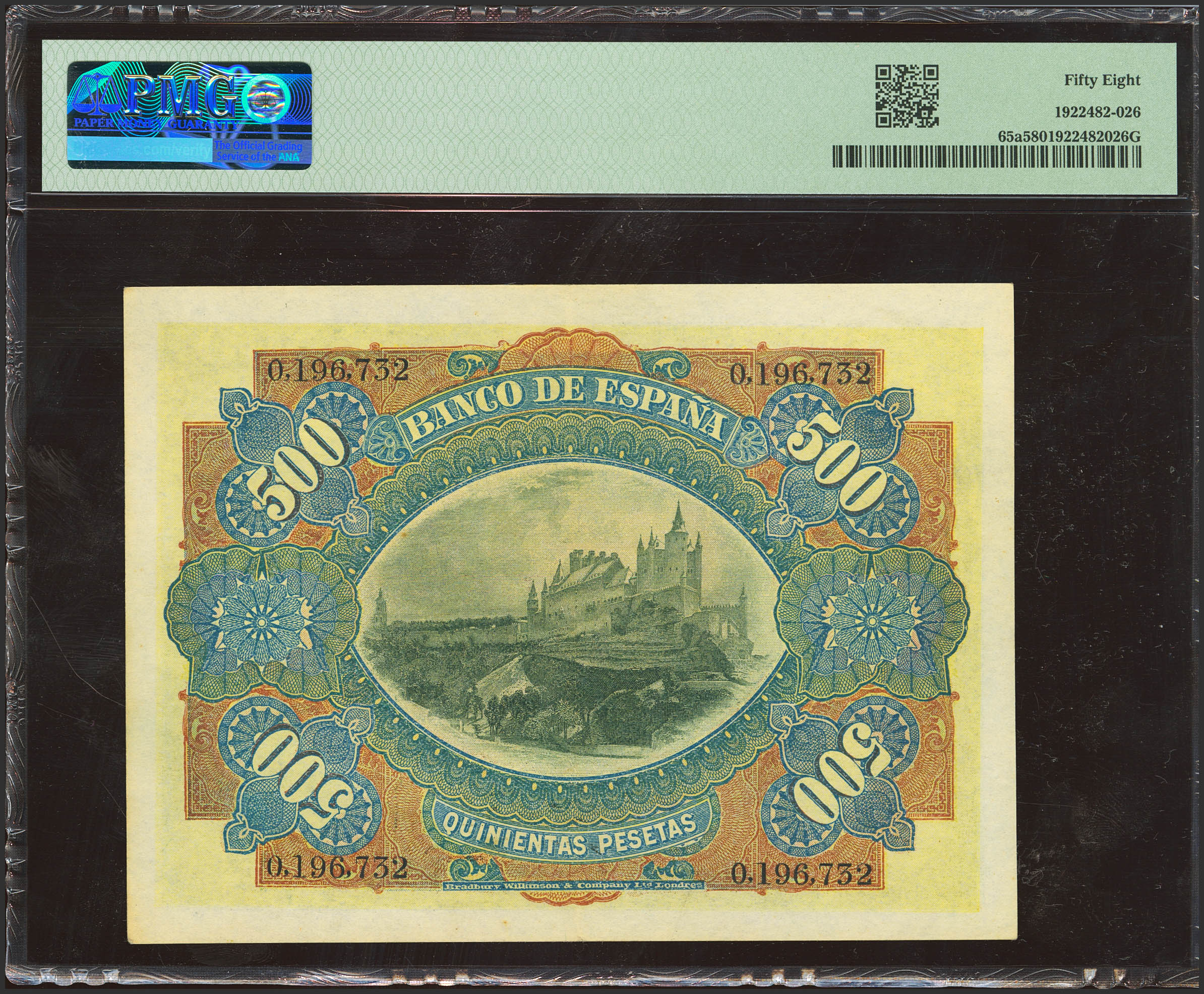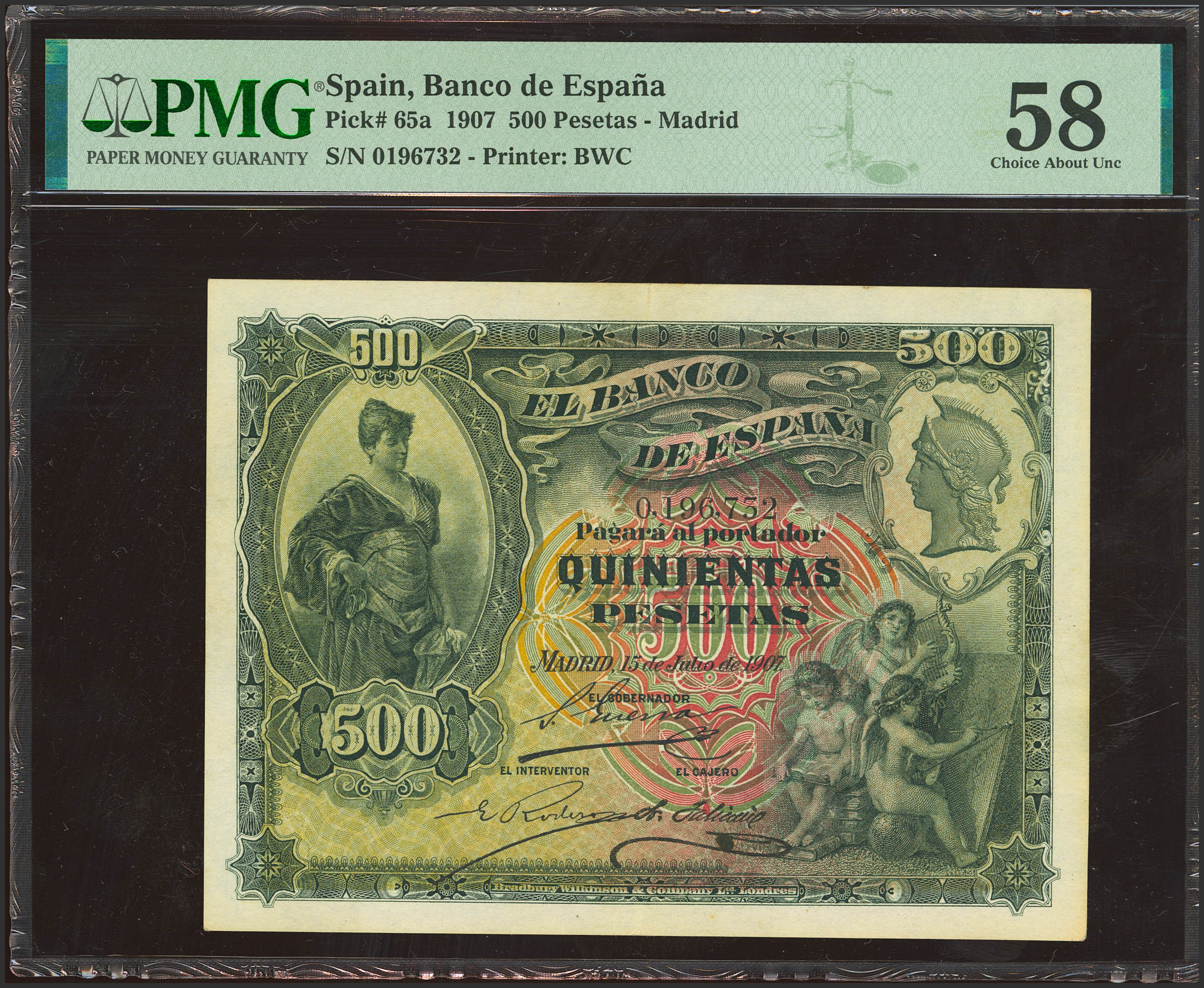 500 Pesetas. 15 de Julio de 1907. Sin serie. (Edifil 2023: 321, Pick: 65a). Rarísimo, especialmente en esta excepcional calidad, y sin ninguna reparación. EBC++. Encapsulado PMG58 (para hacernos idea de la rareza, a fecha 1 de Mayo de 2025, este billete es el segundo mejor calificado junto a otros diez billetes en PMG)