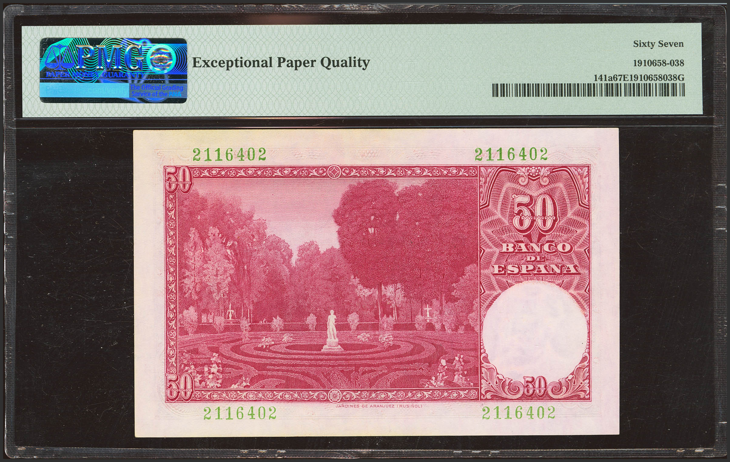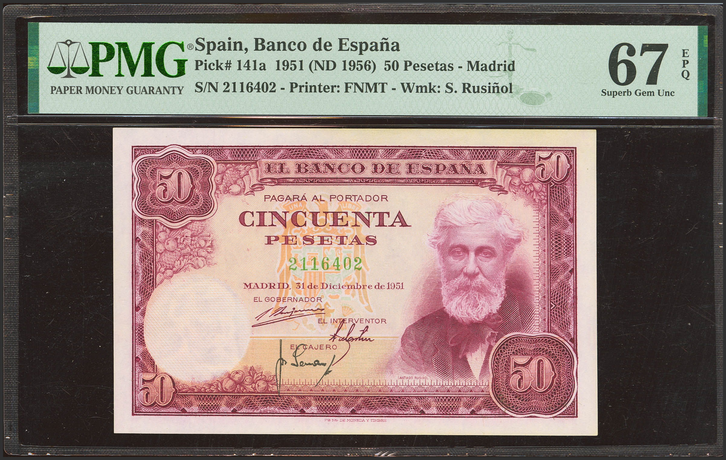 50 Pesetas. 31 de Diciembre de 1951. Sin serie. (Edifil 2023: 462, Pick: 141a). Apresto original, manchita del tiempo en el margen superior. SC. Encapsulado PMG67EPQ.