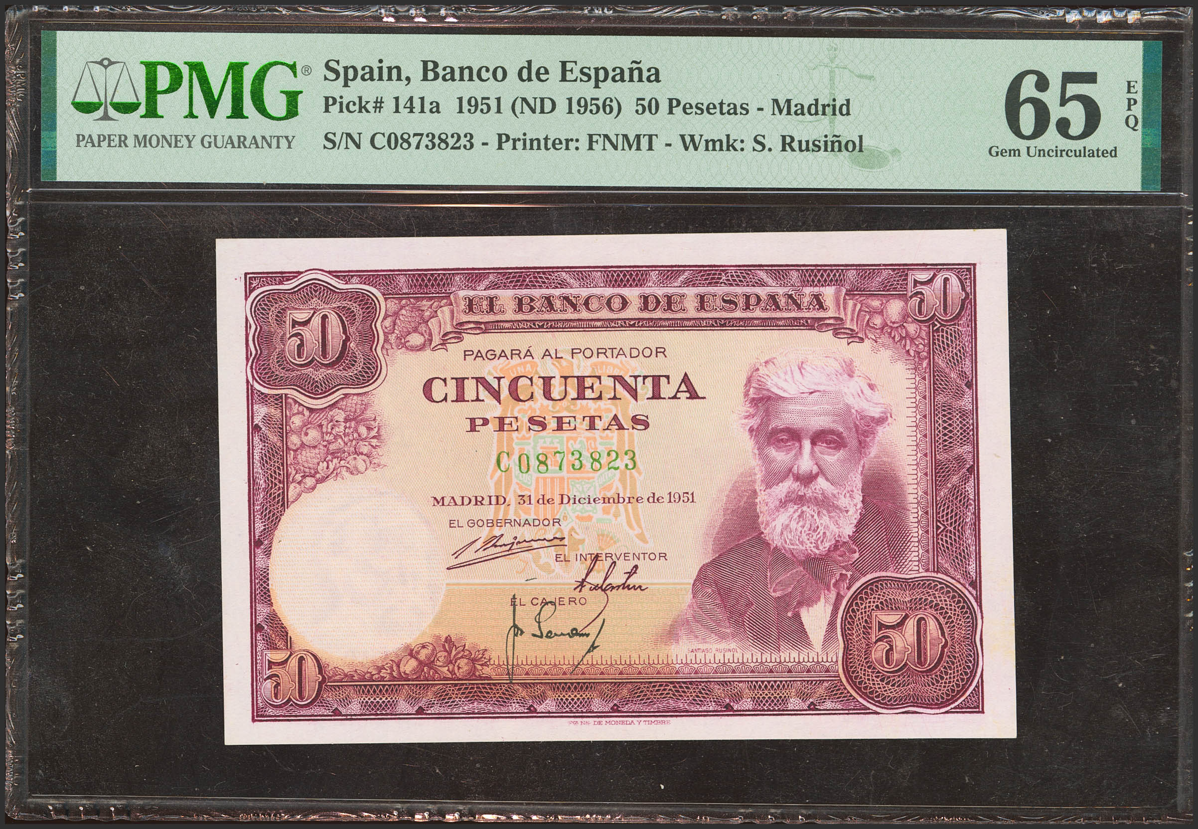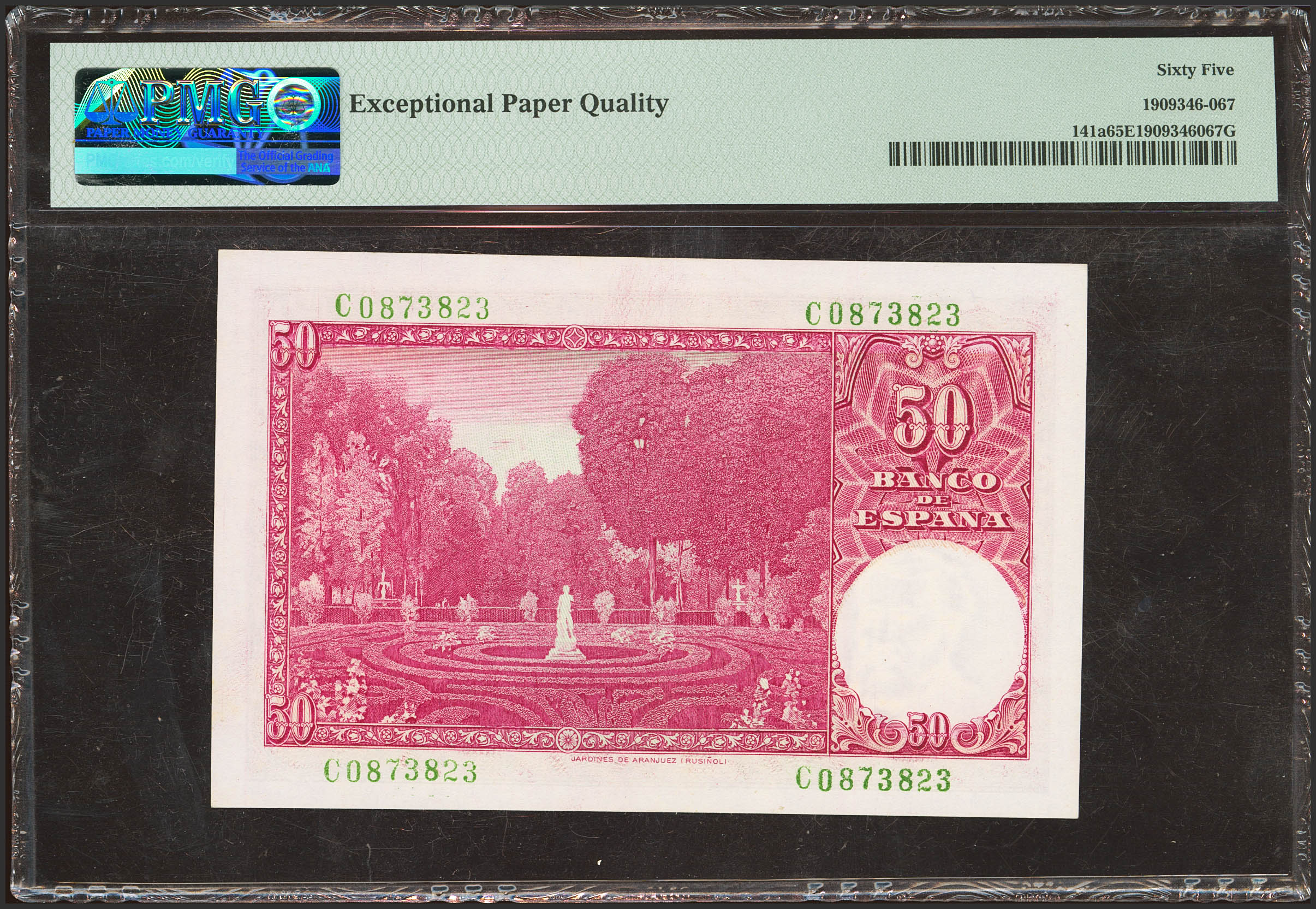 50 Pesetas. 31 de Diciembre de 1951. Serie C, última serie emitida. (Edifil 2023: 462a, Pick: 141a). SC. Encapsulado PMG65EPQ.