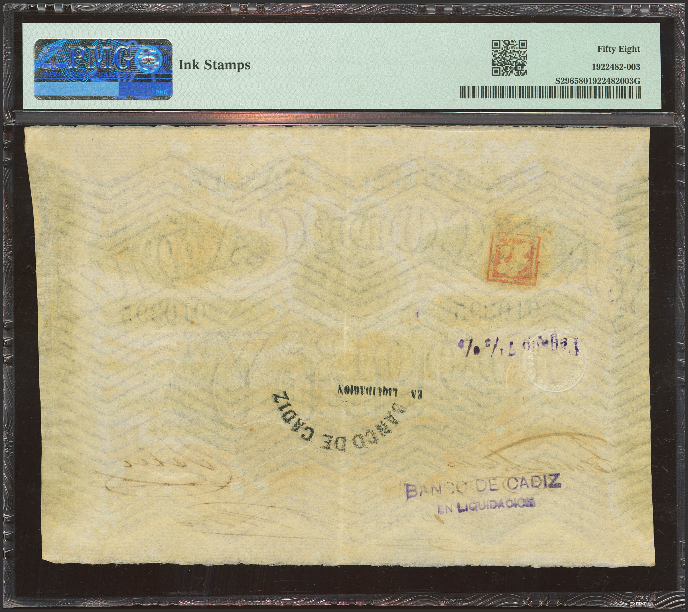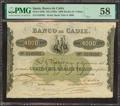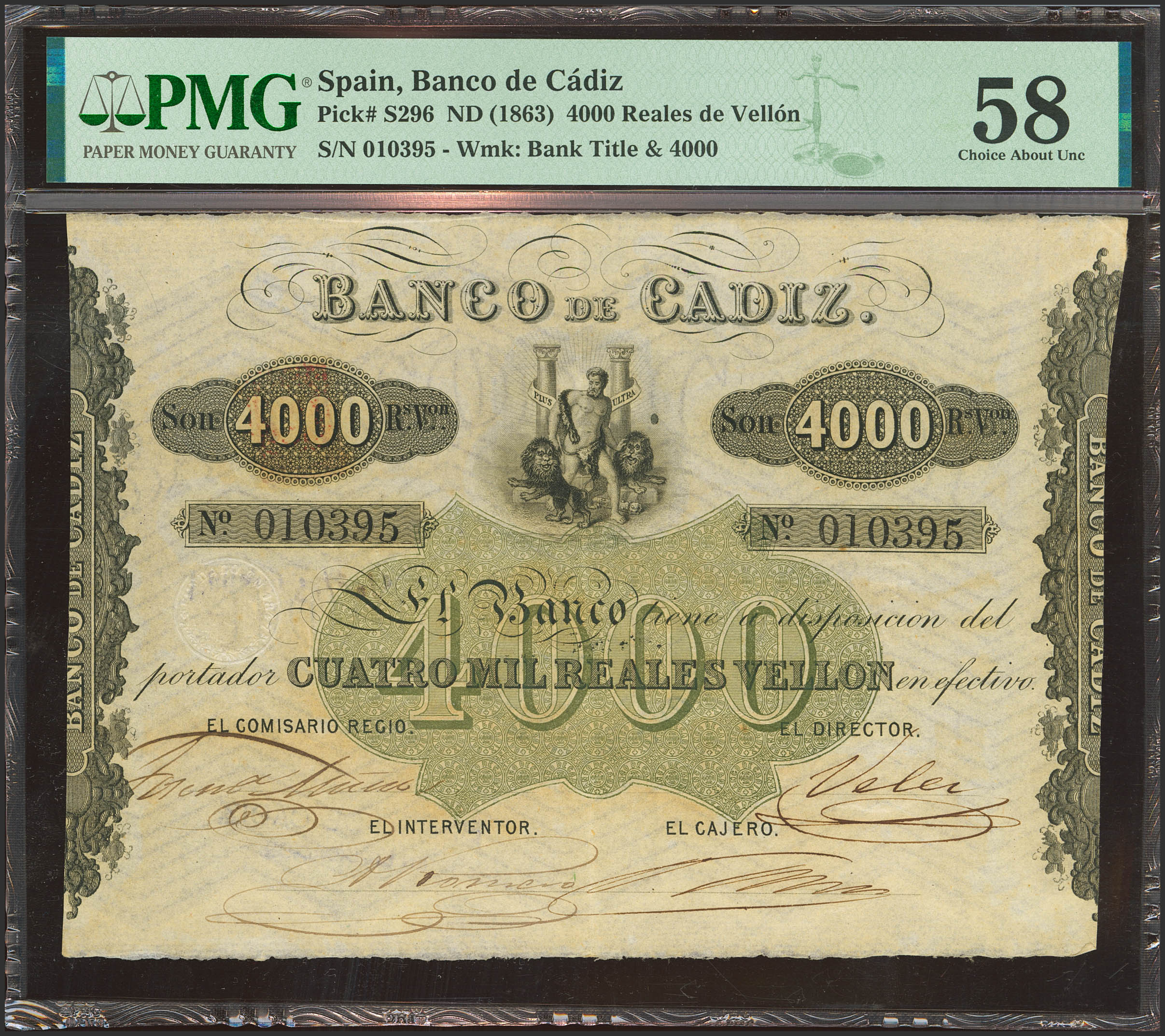 BANCO DE CADIZ. Emisión III. 4000 Reales (sin fechar). Cuatro firmas y resello en seco. (Edifil 2023: 83, Pick: S296). Muy raro, especialmente en esta excepcional calidad. EBC+. Encapsulado PMG58 (ink stamp) (para hacernos idea de la rareza, a fecha 1 de Mayo de 2025, se trata del billete mejor calificado en PMG).