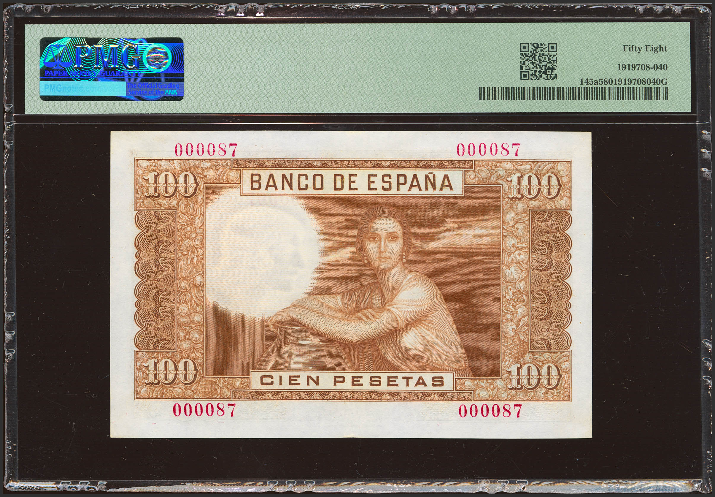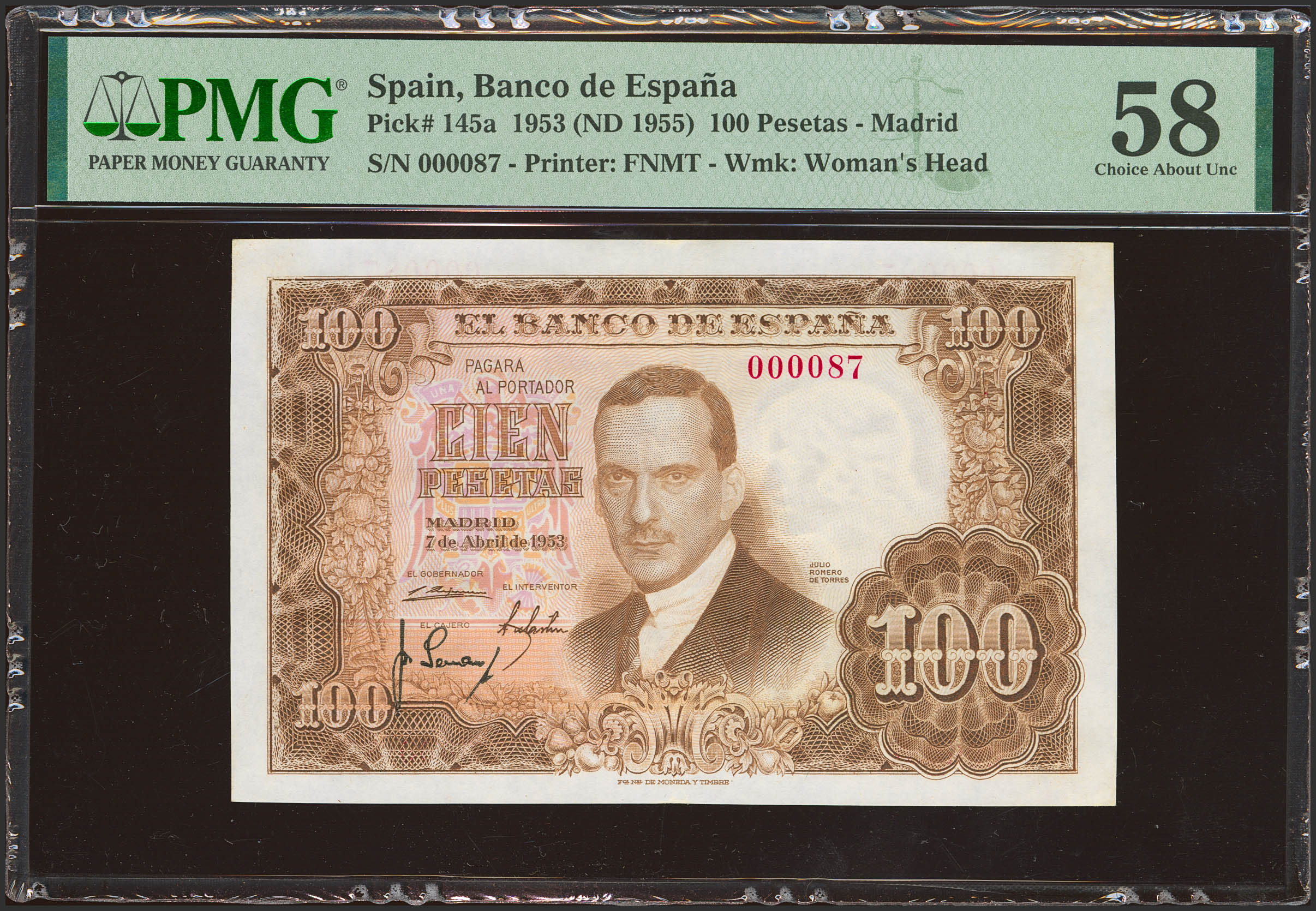 100 Pesetas. 7 de Abril de 1953. Sin serie y numeración extremadamente baja (Nº000087). (Edifil 2023: 464, Pick: 145a). EBC++. Encapsulado PMG58.