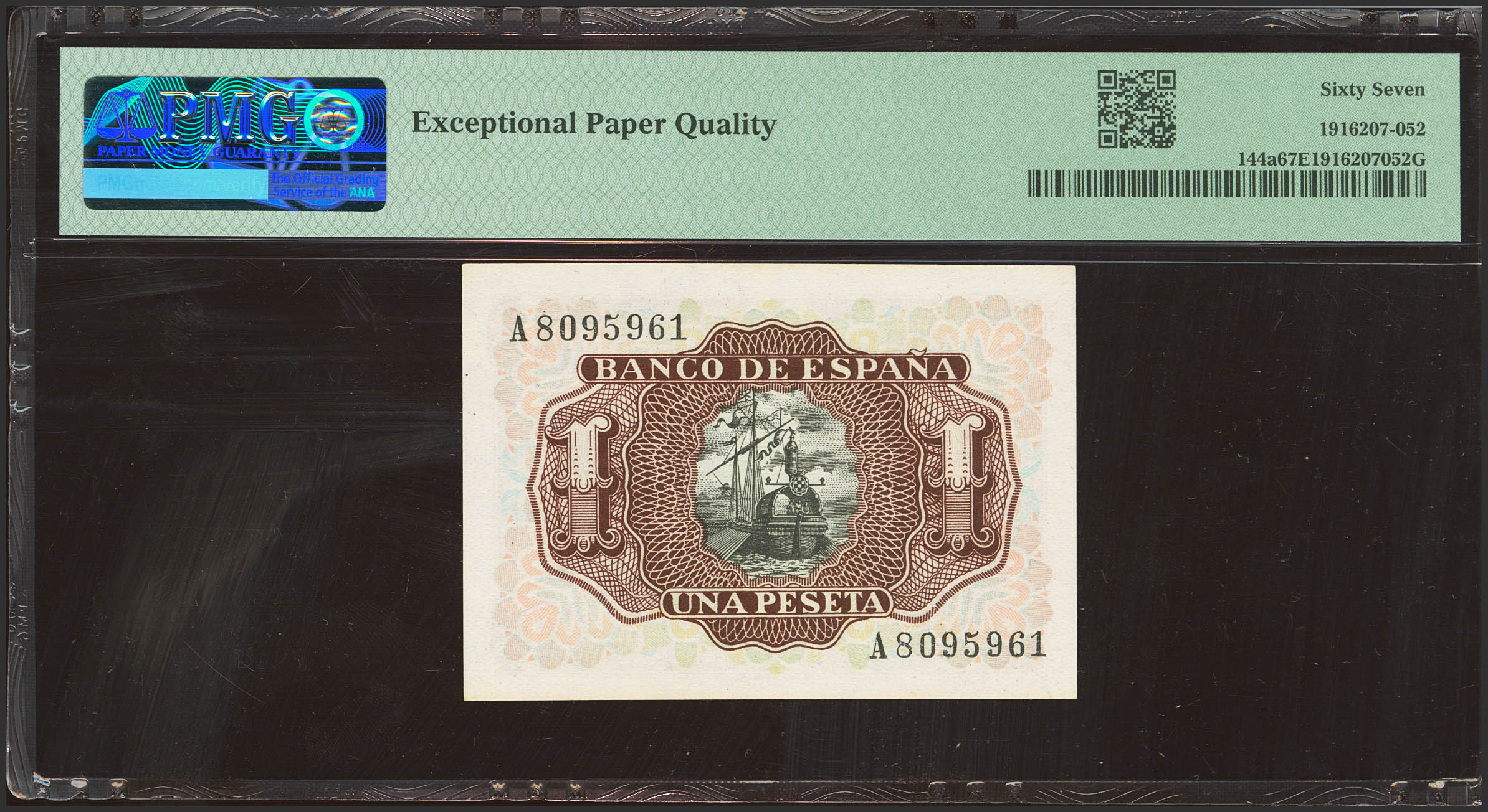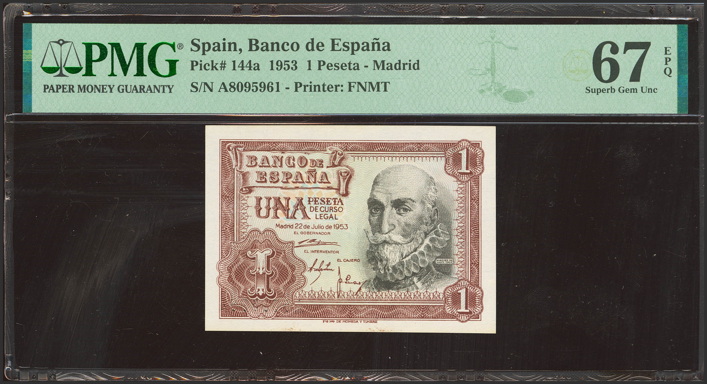 1 Peseta. 22 de Julio de 1953. Serie A. (Edifil 2023: 465a, Pick: 144a). Apresto original. SC. Encapsulado PMG67EPQ.