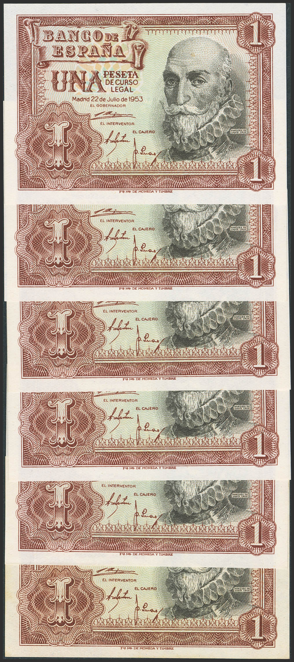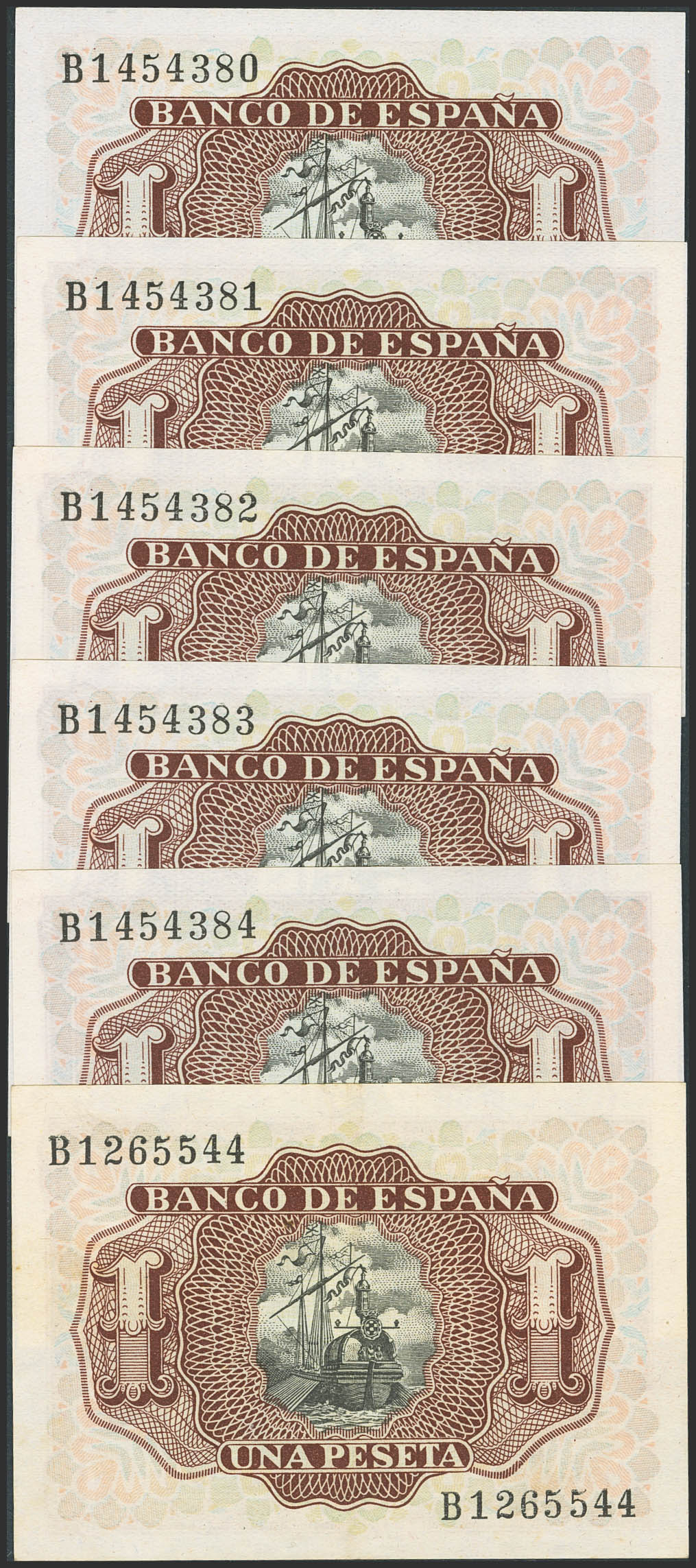 Conjunto de 6 billetes, cinco de ellos correlativos, del 1 Peseta emitido el 22 de Julio de 1953 y con la serie B (Edifil 2023: 465a), conservando el apresto original. SC/EBC.
