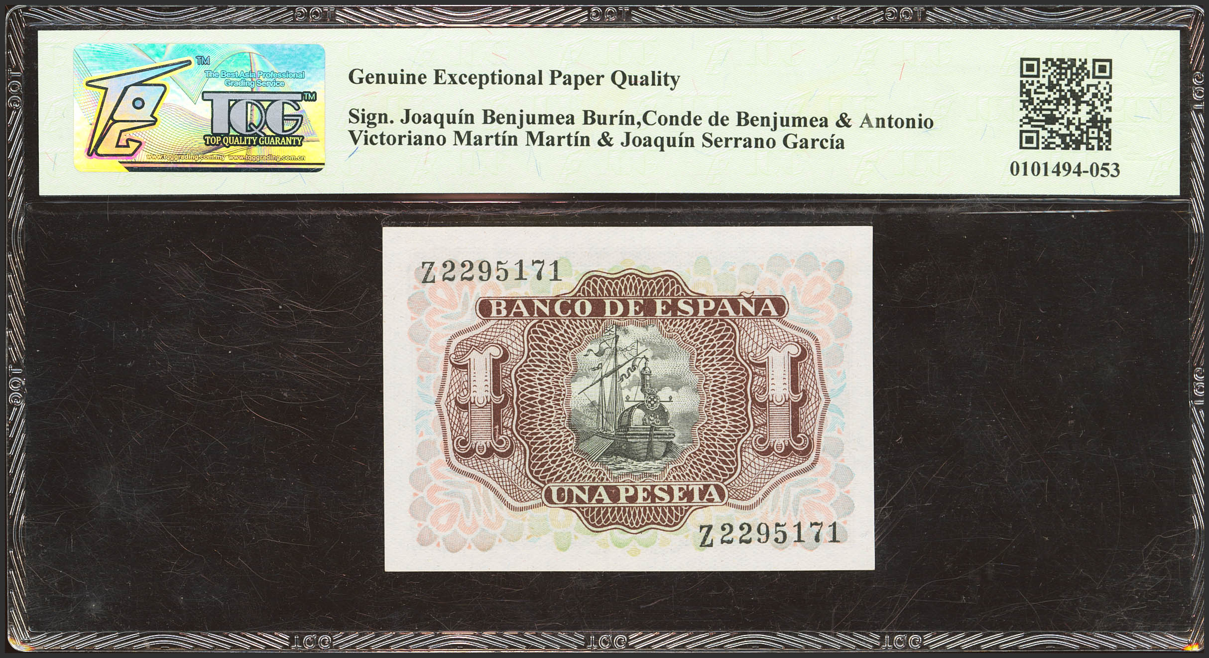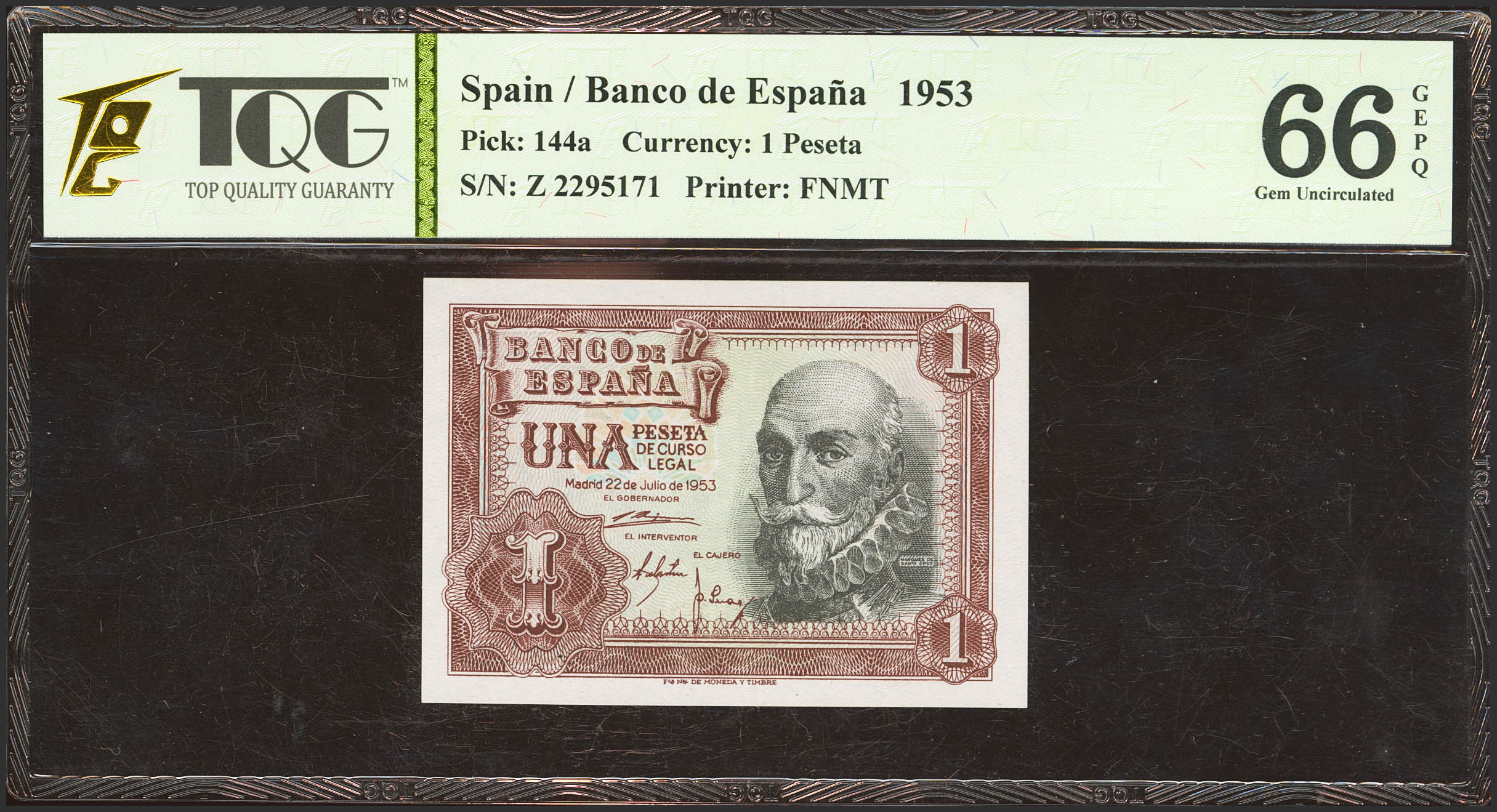 1 Peseta. 22 de Julio de 1953. Serie Z. (Edifil 2023: 465a, Pick: 144a). Apresto original. SC. Encapsulado TQG66GEPQ.