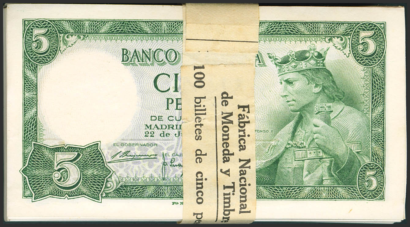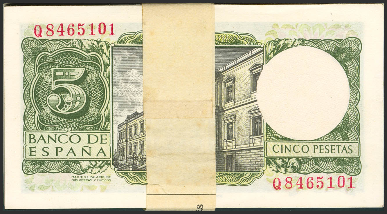 Conjunto de 100 billetes correlativos de 5 Pesetas, emitidos el 22 de Julio de 1954, todos ellos con la serie Q, en "fajo" y con su precinto original (Edifil 2023: 466a), conservando todo su apresto original. SC/SC--.