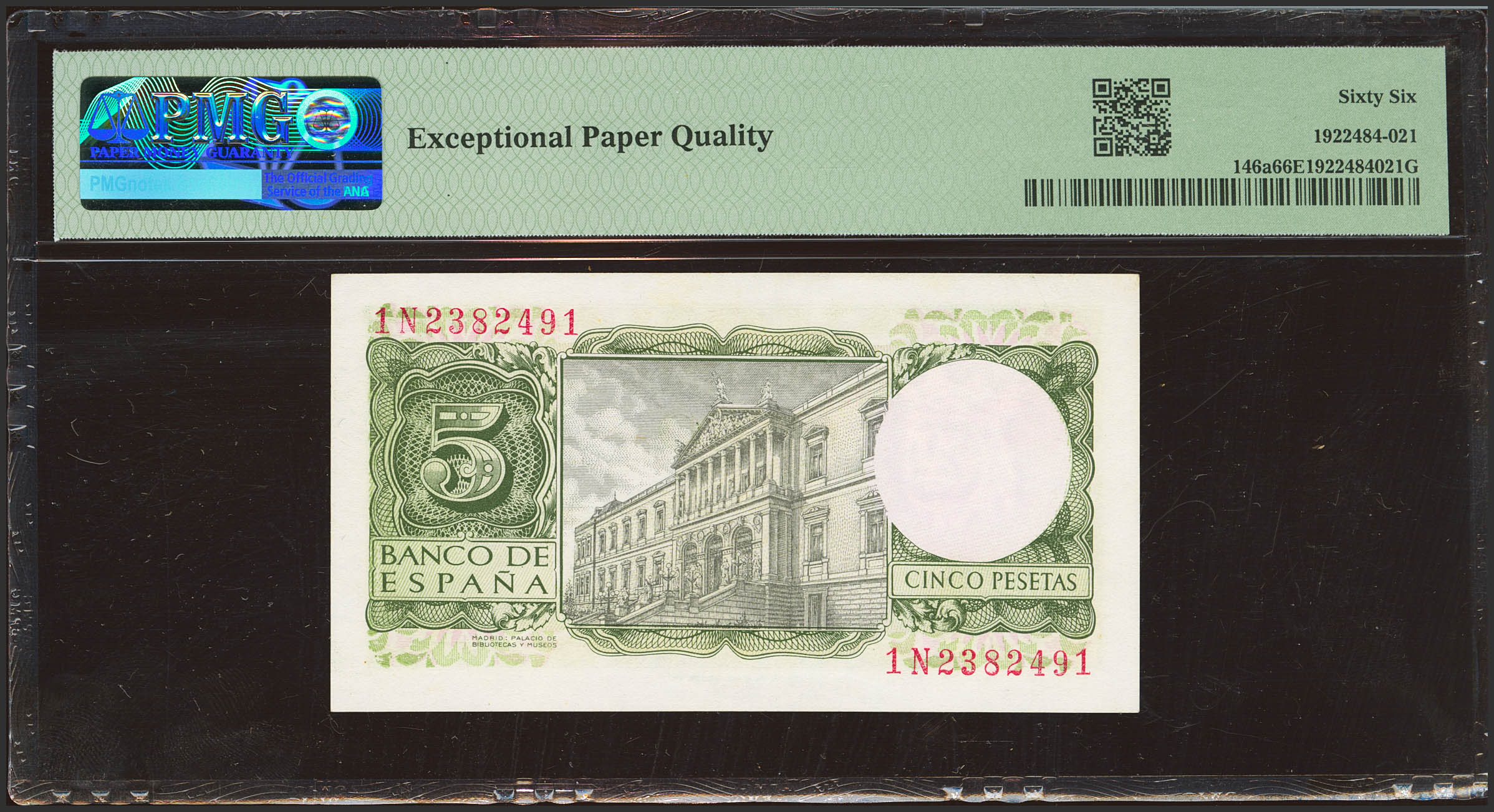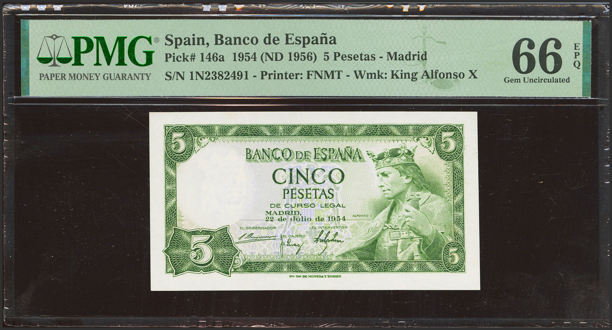 5 Pesetas. 22 de Julio de 1954. Serie 1N, serie no emitida. (Edifil 2023: 466b, Pick: 146a). Extraordinariamente rara serie, especialmente en esta excepcional calidad, se trata de una de las series más raras del Estado Español, para hacernos idea de su rareza el estudioso Ramón Cobo sólo tiene registrado un sólo ejemplar que bien podría tratarse de este ejemplar, apresto original. SC. Encapsulado PMG66EPQ.