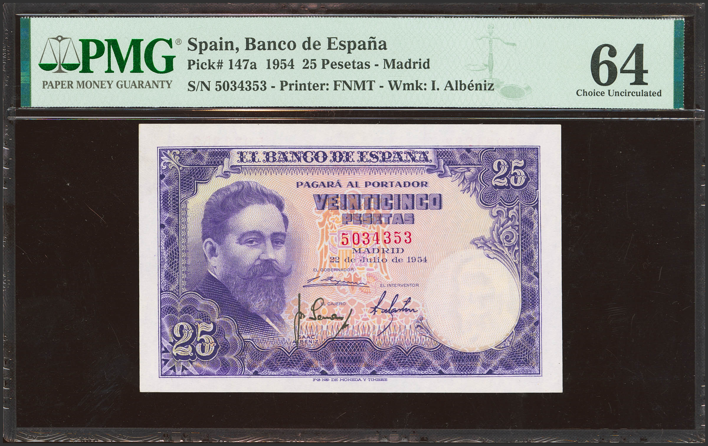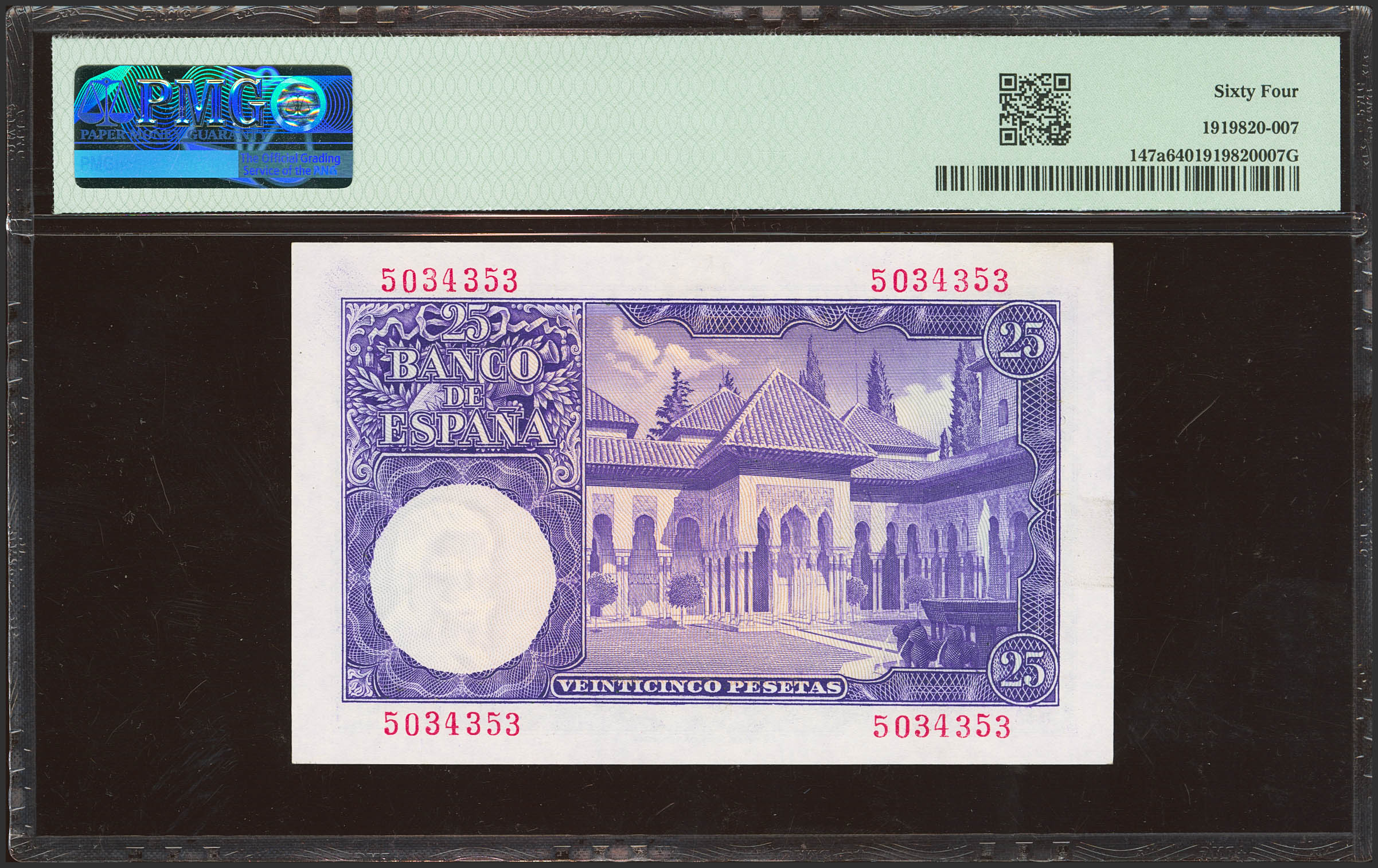 25 Pesetas. 22 de Julio de 1954. Sin serie. (Edifil 2023: 467, Pick: 147a). Inusual. SC. Encapsulado PMG64.