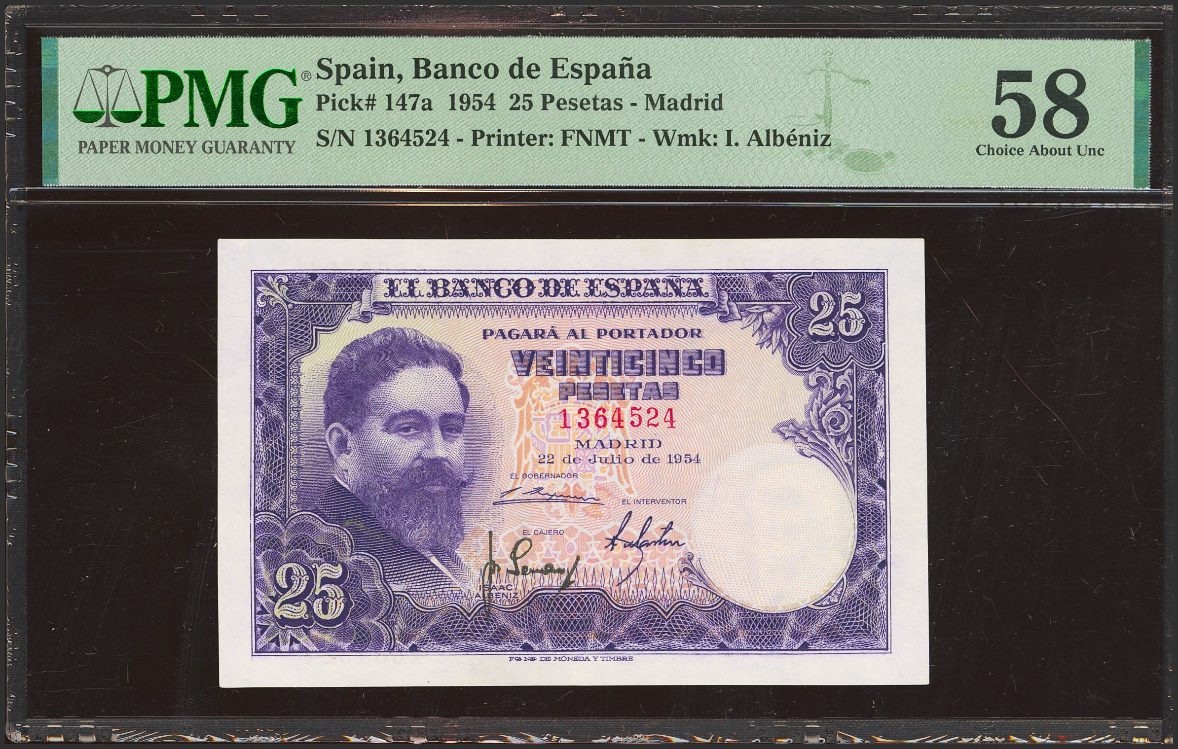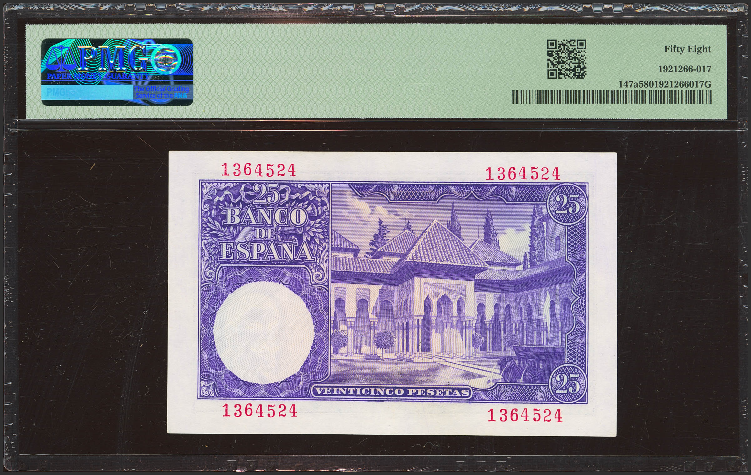 25 Pesetas. 22 de Julio de 1953. Sin serie. (Edifil 2021: 467, Pick: 147a). EBC++. Encapsulado PMG58.