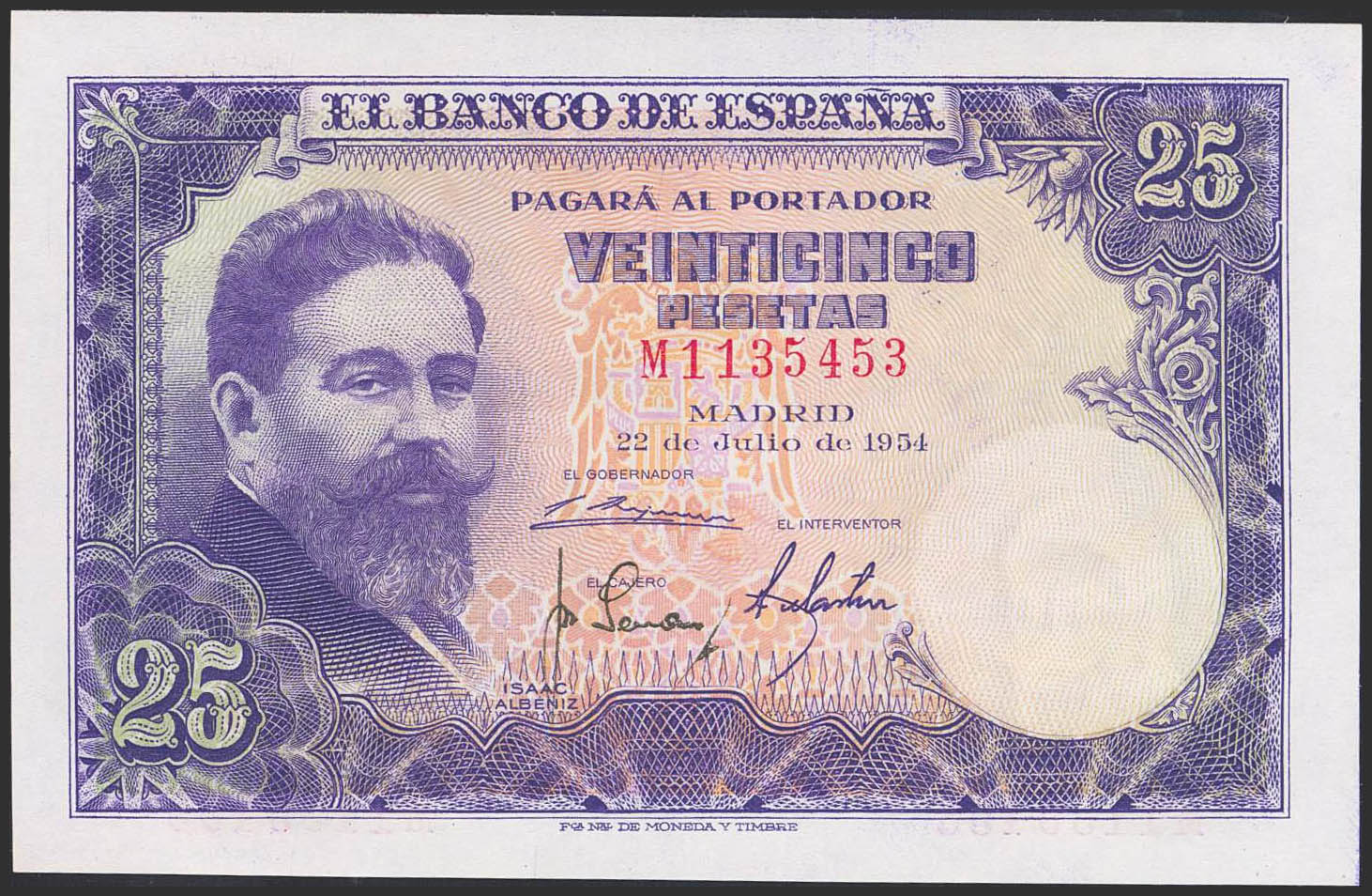 25 Pesetas. 22 de Julio de 1954. Serie M. (Edifil 2021: 467a). Apresto original. SC.