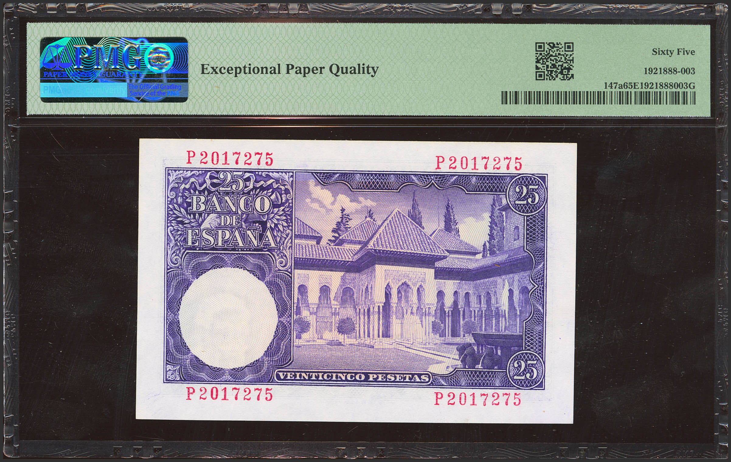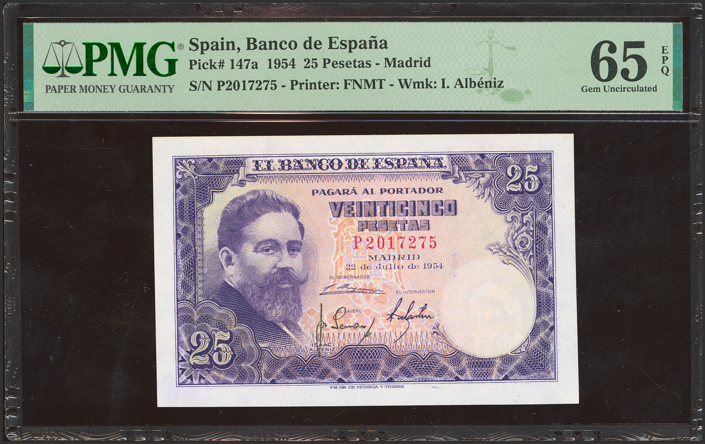 25 Pesetas. 22 de Julio de 1954. Serie P, última serie emitida. (Edifil 2021: 467b, Pick: 147a). Muy rara serie, especialmente en esta excepcional calidad, apresto original. SC. Encapsulado PMG65EPQ.