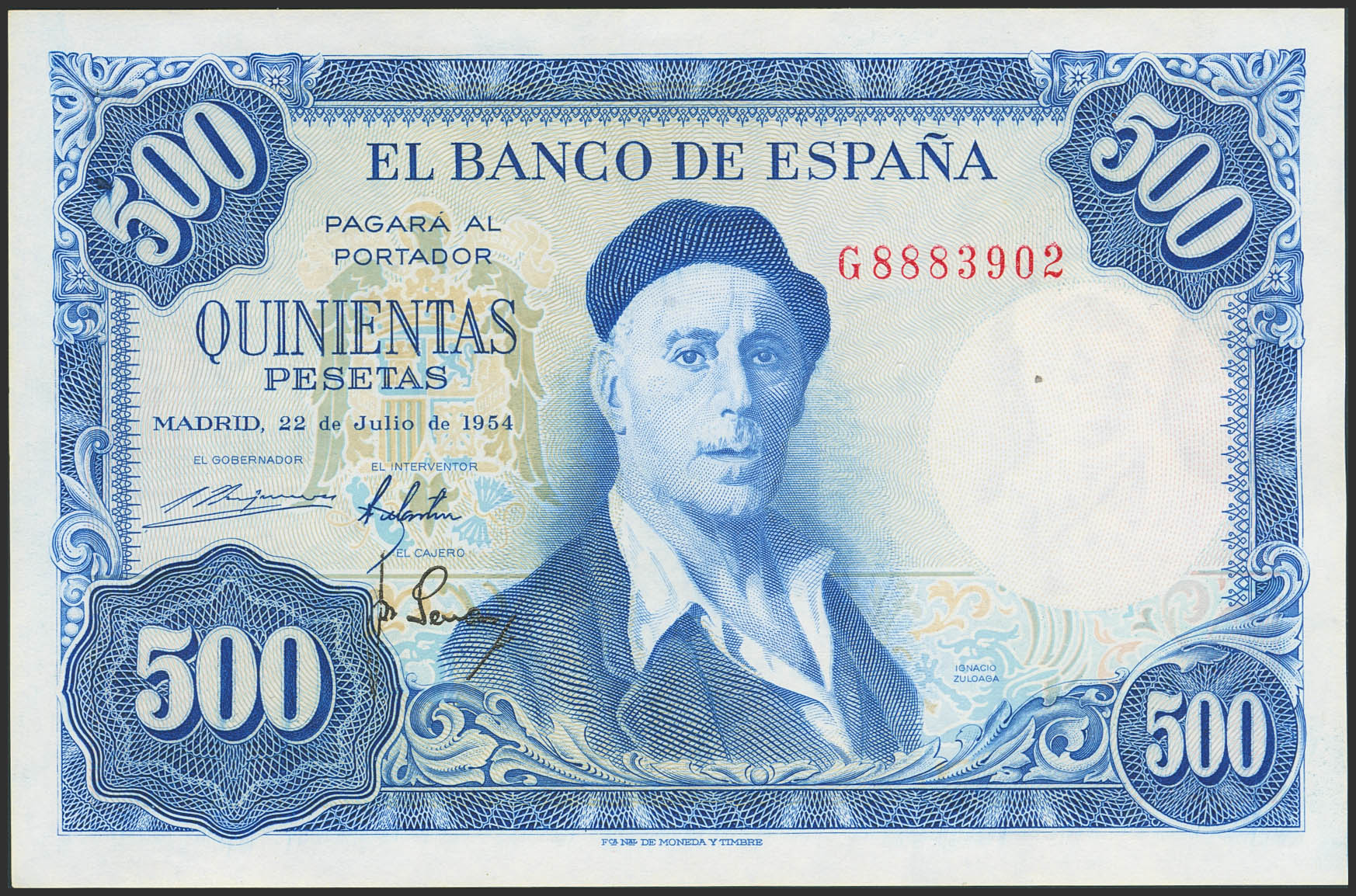 500 Pesetas. 22 de Julio de 1954. Serie G. (Edifil 2023: 468b). Conserva todo su apresto original, puntos de grapa. SC--.
