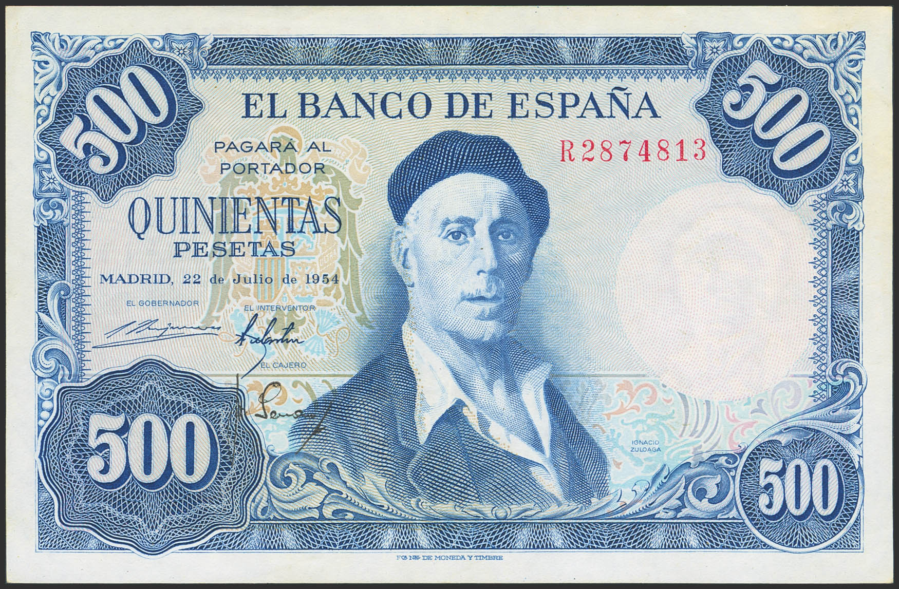 500 Pesetas. 22 de Julio de 1954. Serie R. (Edifil 2023: 468b). Conserva parte de su apresto original. EBC.